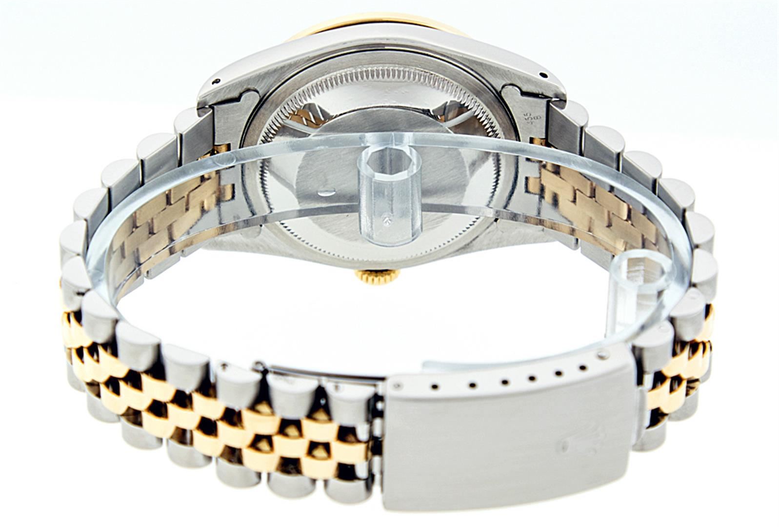 One Mens Two Tone Rolex Datejust Polished, Serviced & Electronically Tested, 14K Yellow Gold & Stainless Steel Case:36mm, 14K Yellow Gold Crown, Custom Bezel: 18K Yellow Gold Emerald Beadset Diamond Bezel, Diamond Count: 36 Diamonds + 4 Emeralds, Total Weight 1.00 Carat, Clarity: SI-VS, Color: G to H. Custom Crystal: Synthetic Sapphire Cyclops Lens. Movement: Automatic Winding Movement Caliber 3035. Custom Dial: Black String Diamond Dial VVS , Diamond Count: 58 Diamonds in Dial G To H In Color, VVS Clarity. Date Window: 3 O'Clock Position Date Display, Quickset, Model: 16013 Condition: G-6 Extra Fine. Bracelet: Two Tone 14K Yellow Gold & Stainless Steel Jubilee. Bright Polish. 7.0 Inch Length, Adjustable. Standard Clasp, With Rolex Logo.