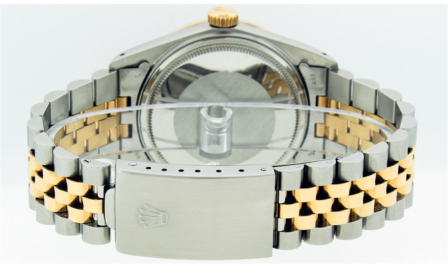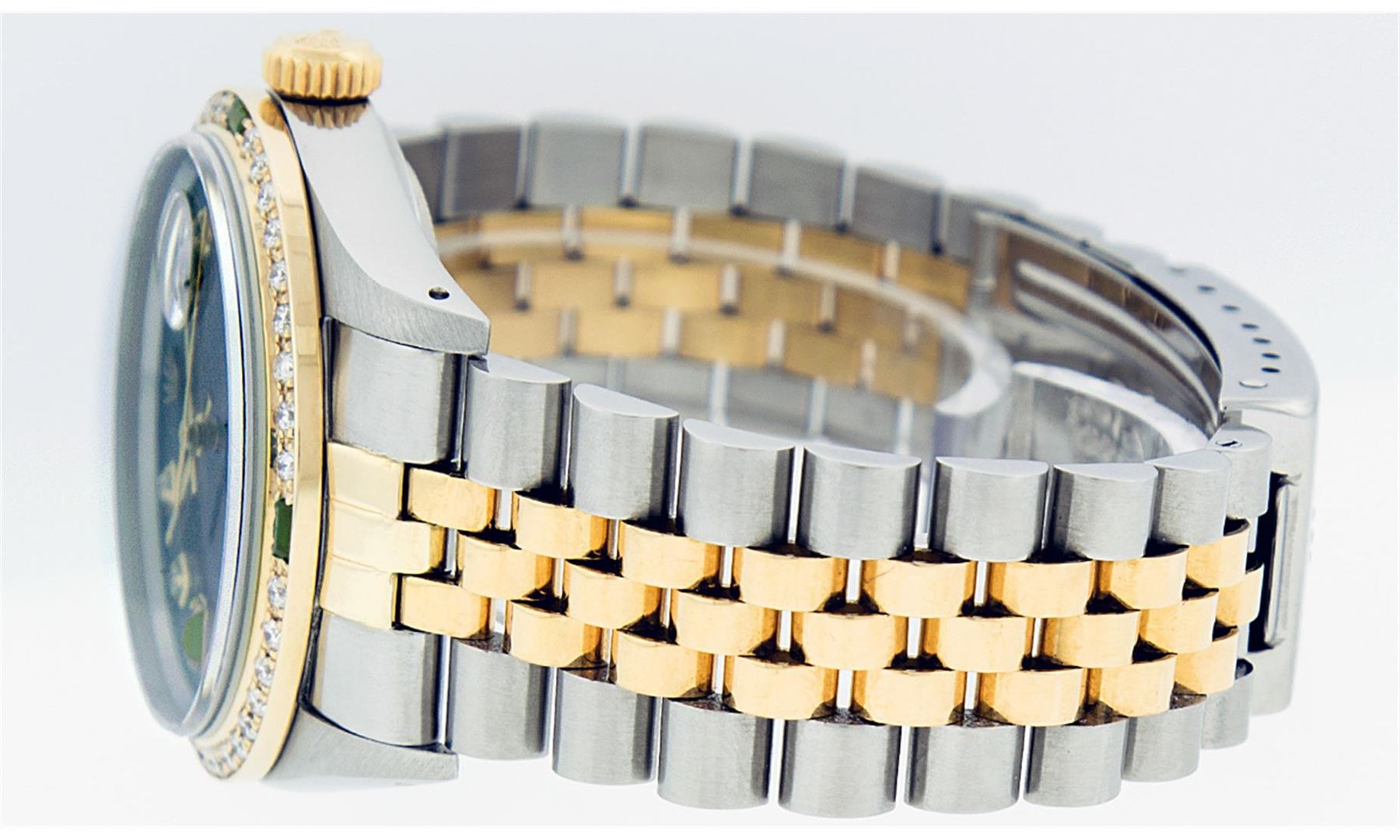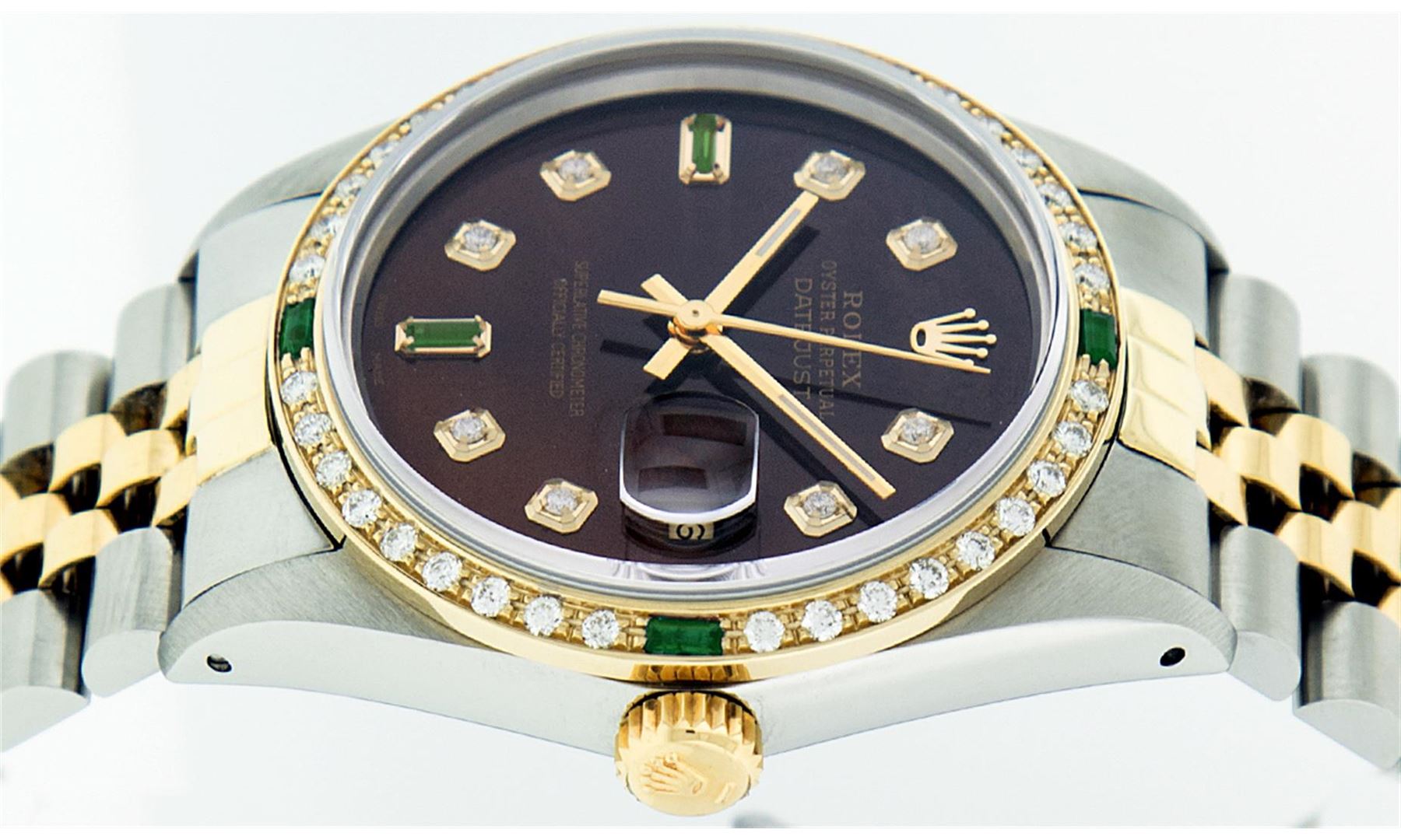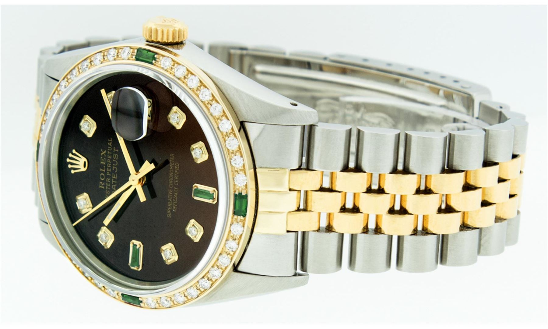 One Mens Rolex Datejust Polished Bright with Satin Finish, Serviced & Electronically Tested, Stainless Steel Case:36mm, Stainless Steel Crown, Custom Bezel: 18K Yellow Gold Emerald Beadset Diamond Bezel, Diamond + Gem Count:36 Diamonds + 4 Emeralds, Total Weight 1.00 Carat, Clarity: SI-VS, Color: G to H. Custom Crystal: Synthetic Sapphire Cyclops Lens. Movement: Automatic Winding Movement Caliber 3035. Custom Dial: Brown Diamonds With Emeralds, Diamond Count: 8 Diamond + 2 Emerald Baguettes in Dial, Dial Color: G To H In Color, Clarity: SI-VS. Date Window: 3 O'Clock Position Date Display, Quickset, Model: 16013 Condition: G-6 Extra Fine. Bracelet: 14K Yellow Gold and Stainless Steel Jubilee. Bright Polish & Satin Finish. 7.0 Inch Length, Adjustable. Standard Clasp, With Rolex Logo.