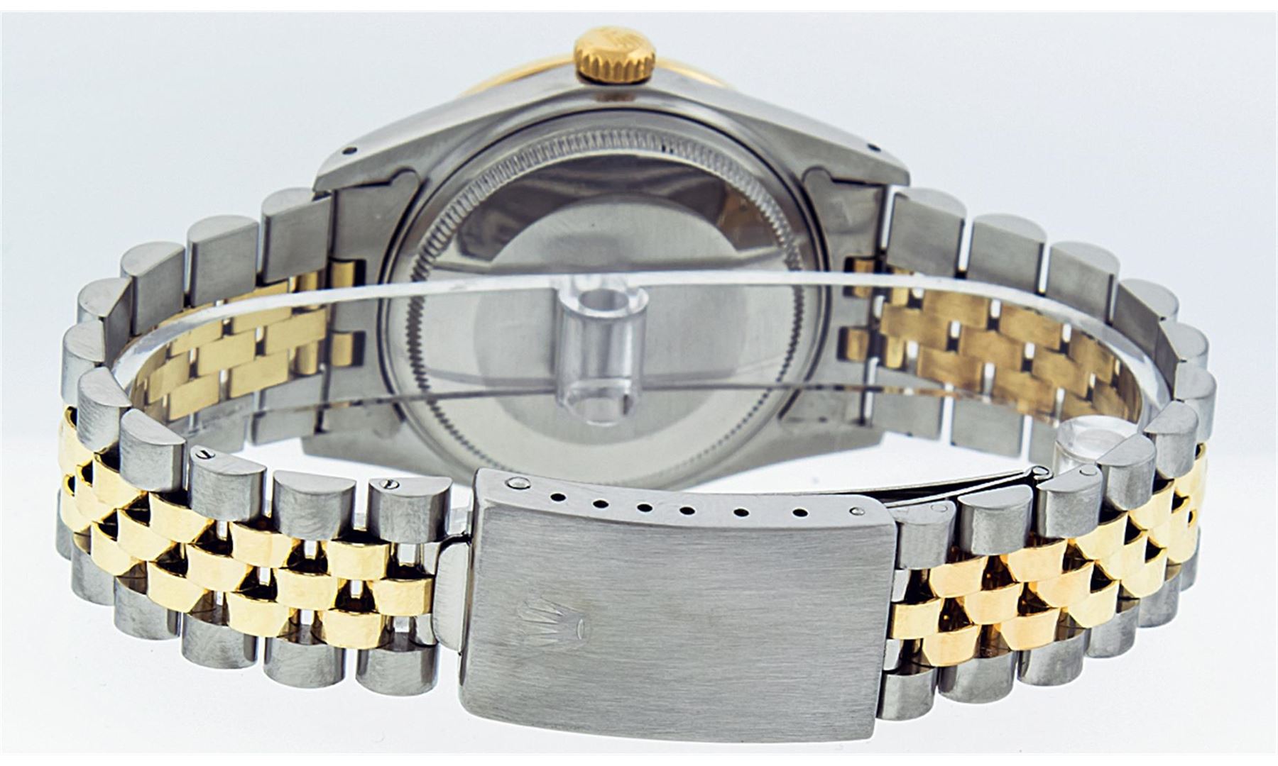 One Mens Two Tone Rolex Datejust Polished, Serviced & Electronically Tested, 14K Yellow Gold & Stainless Steel Case:36mm, 14K Yellow Gold Crown, Custom Bezel: 18K Yellow Gold Emerald Beadset Diamond Bezel, Diamond Count: 36 Diamonds + 4 Emeralds Total Weight 1.0 Carat, Clarity: Si-VS, Color: G to H. Custom Crystal: Synthetic Sapphire Cyclops Lens. Movement: Automatic Winding Movement Caliber 3035. Custom Dial: Mother Of Pearl String Diamond Dial, Diamond Count: 48 Diamonds + 10 Emeralds, Color: G to H, Clairty: SI-VS Date Window: 3 O'Clock Position Date Display, Quickset, Model: 16013 Condition: G-6 Extra Fine. Bracelet:Two Tone 14K Yellow Gold & Stainless Steel Jubilee. Bright Polish. 7.0 Inch Length, Adjustable. Standard Clasp, With Rolex Logo.