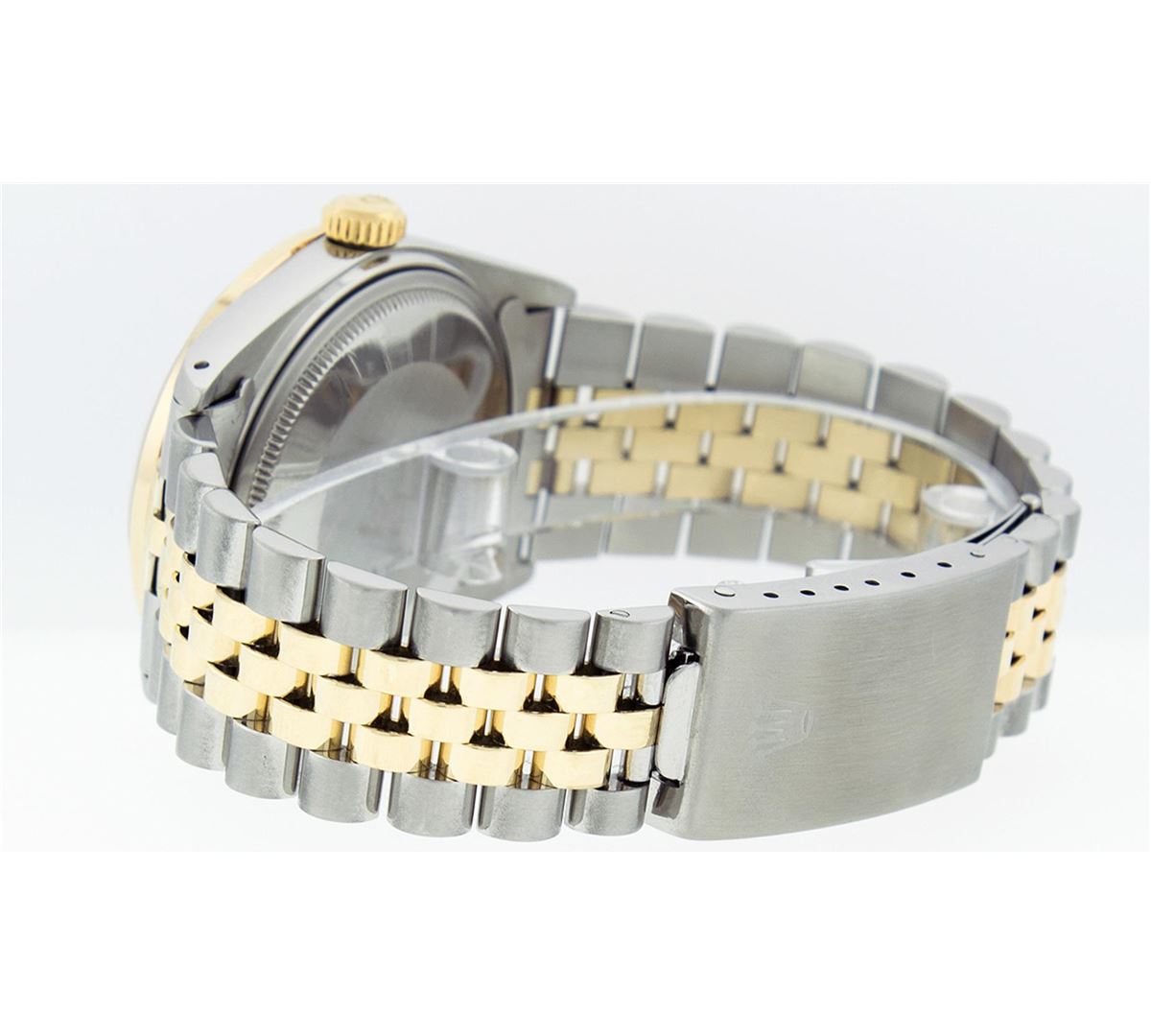 One Mens Two Tone Rolex Datejust Polished, Serviced & Electronically Tested, 14K Yellow Gold & Stainless Steel Case:36mm, 14K Yellow Gold Crown, Custom Bezel: 18K Yellow Gold Ruby Beadset Diamond Bezel, Diamond Count: 36 Diamonds + 4 Ruby, Total Weight 1.00 Carat, Clarity: SI-VS, Color: G to H. Custom Crystal: Synthetic Sapphire Cyclops Lens. Movement: Automatic Winding Movement Caliber 3035. Custom Dial: Mother Of Pearl Roman Dial. Date Window: 3 O'Clock Position Date Display, Quickset, Model: 16013 Condition: G-6 Extra Fine. Bracelet:Two Tone 14K Yellow Gold & Stainless Steel Jubilee. Bright Polish. 7.0 Inch Length, Adjustable. Standard Clasp, With Rolex Logo.