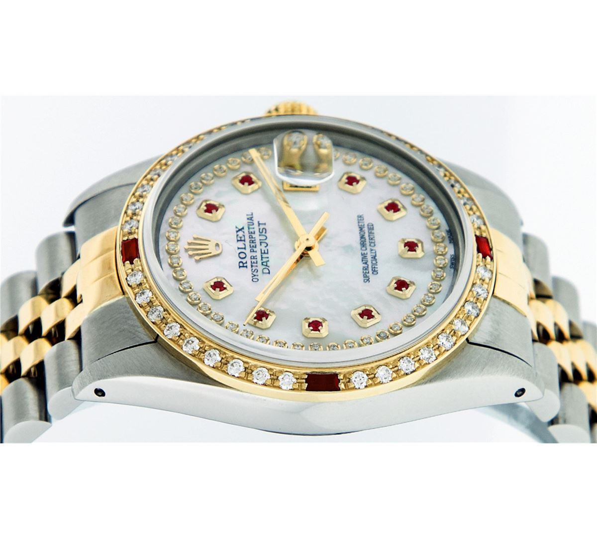 One Mens Two Tone Rolex Datejust Polished, Serviced & Electronically Tested, 14K Yellow Gold & Stainless Steel Case:36mm, 14K Yellow Gold Crown, Custom Bezel: 18K Yellow Gold Ruby Beadset Diamond Bezel, Diamond Count: 36 Diamonds + 4 Rubies Total Weight 1.00 Carat, Clarity: Si-VS, Color: G to H. Custom Crystal: Synthetic Sapphire Cyclops Lens. Movement: Automatic Winding Movement Caliber 3035. Custom Dial: Mother Of Pearl Ruby String Diamond Dial , Diamond + Gem Count: 10 Ruby + 48 Diamonds in Dial G To H In Color, SI-VS Clarity. Date Window: 3 O'Clock Position Date Display, Quickset, Model: 16013 Condition: G-6 Extra Fine. Bracelet:Two Tone 14K Yellow Gold & Stainless Steel Jubilee. Bright Polish. 7.0 Inch Length, Adjustable. Standard Clasp, With Rolex Logo.