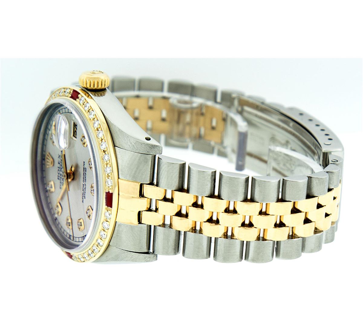 One Mens Two Tone Rolex Datejust Polished, Fully Serviced & Electronically Tested, 14K Yellow Gold & Stainless Steel Case:36mm, 14K Yellow Gold Crown, Custom Bezel: 18K Yellow Gold Ruby Beadset Diamond Bezel, Diamond Count: 36 Diamonds + 4 Rubies, Total Weight 1.0 Carat, Clarity: Si-VS, Color: G to H. Custom Crystal: Synthetic Sapphire Cyclops Lens. Movement: Automatic Winding Movement Caliber 3035. Custom Dial: Silver Diamond Dial With Square Roman Track and Luminescent Dots , Diamond Count: 10 Diamonds In Dial, Color: G to H, Clarity: SI-VS. Date Window: 3 O'Clock Position Date Display, Quickset, Model: Datejust Condition: G-6 Extra Fine. Bracelet: Two Tone 14K Yellow Gold & Stainless Steel Jubilee. Bright Polish. 7.0 Inch Length, Adjustable. Standard Clasp, With Rolex Logo.