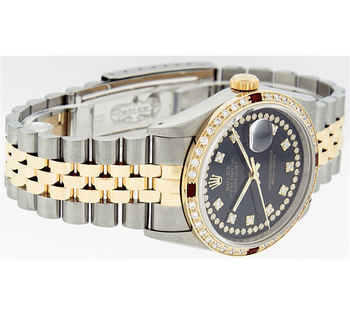 One Mens Two Tone Rolex Datejust Polished, Serviced & Electronically Tested, 14K Yellow Gold & Stainless Steel Case:36mm, 14K Yellow Gold Crown, Custom Bezel: 18K Yellow Gold Ruby Beadset Diamond Bezel, Diamond Count: 36 Diamonds + 4 Rubies, Total Weight 1.00 Carat, Clarity: SI-VS, Color: G to H. Custom Crystal: Synthetic Sapphire Cyclops Lens. Movement: Automatic Winding Movement Caliber 3035. Custom Dial: Black String Diamond Dial VVS , Diamond Count: 58 Diamonds in Dial G To H In Color, VVS Clarity. Date Window: 3 O'Clock Position Date Display, Quickset, Model: 16013 Condition: G-6 Extra Fine. Bracelet: Two Tone 14K Yellow Gold & Stainless Steel Jubilee. Bright Polish. 7.0 Inch Length, Adjustable. Standard Clasp, With Rolex Logo.