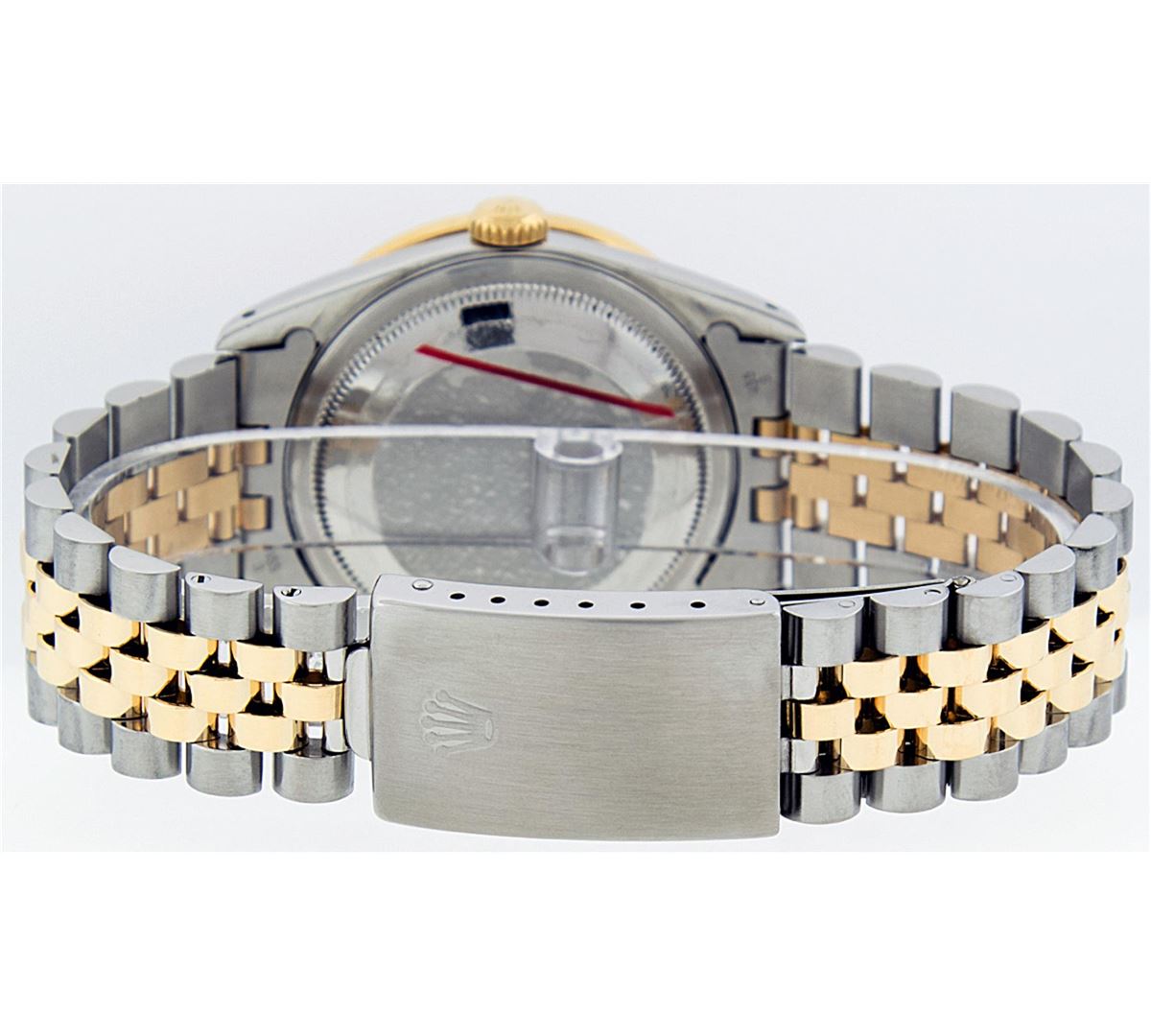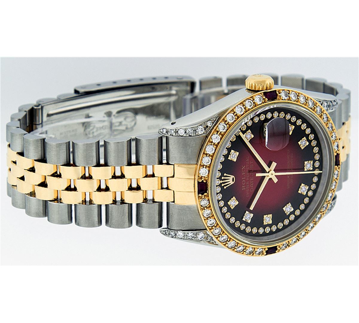 One Mens Two Tone Rolex Datejust Polished, Serviced & Electronically Tested,14K Yellow Gold And Stainless Steel Case:36mm, Diamond Lugs: Diamond Count: 24 Diamonds In Lugs, Diamond Weight: .35 Carat. Clarity SI-VS, Color: G to H. 14K Yellow Gold Crown, Custom Bezel: 18K Yellow Gold Ruby Beadset Diamond Bezel. Diamond Count: 36 Diamonds + 4 Rubies. Total Weight 1.0 Carat, Clarity: SI-VS, Color: G to H. Custom Crystal: Synthetic Sapphire Cyclops Lens. Movement: Automatic Winding Movement Caliber 3035. Custom Dial: Red Vignette String Diamond Dial VVS, Diamond Count: 58 Diamonds In Dial, Clarity: SI-VS, Color: VVS. Date Window: 3 O'Clock Position Date Display, Quickset, Model: 16013 Datejust. Condition: G-6 Extra Fine. Bracelet: 14K Yellow Gold And Stainless Steel Jubilee. Bright Polish & Satin Finish. 7.0 Inch Length, Adjustable. Standard Clasp, With Rolex Logo.