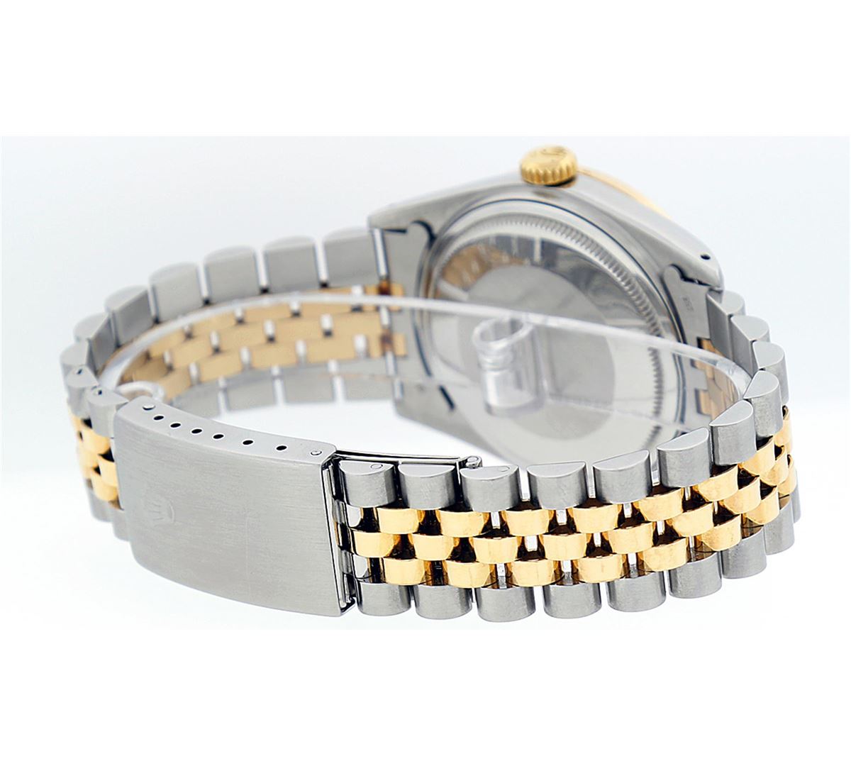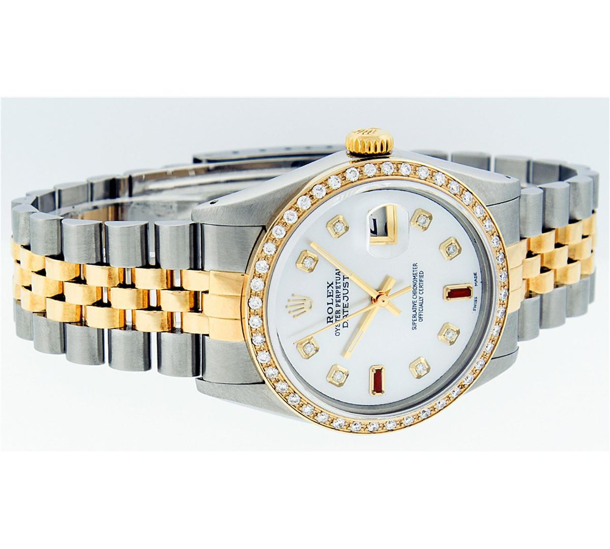 One Mens Two Tone Rolex Datejust Polished, Serviced & Electronically Tested, 14K Yellow Gold & Stainless Steel Case:36mm, 14K Yellow Gold Crown, Custom Bezel: 18K Yellow Gold Beadset Diamond Bezel, Diamond Count: 44 Diamonds. Total Weight 1.00 Carat, Clarity: Si-VS, Color: G to H. Custom Crystal: Synthetic Sapphire Cyclops Lens. Movement: Automatic Winding Movement Caliber 3035. Custom Dial: Mother Of Pearl Diamond With Ruby Baguette, 8 Diamonds + 2 Ruby Baguettes in Dial, Dial Weight: .40 Carat G To H In Color, Clarity: SI-VS Date Window: 3 O'Clock Position Date Display, Quickset, Model: 16013 Condition: G-6 Extra Fine. Bracelet:Two Tone 14K Yellow Gold & Stainless Steel Jubilee. Bright Polish. 7.0 Inch Length, Adjustable. Standard Clasp, With Rolex Logo.
