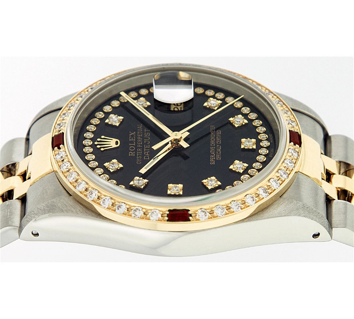 One Mens Two Tone Rolex Datejust Polished, Serviced & Electronically Tested, 14K Yellow Gold & Stainless Steel Case:36mm, 14K Yellow Gold Crown, Custom Bezel: 18K Yellow Gold Ruby Beadset Diamond Bezel, Diamond Count: 36 Diamonds + 4 Rubies, Total Weight 1.00 Carat, Clarity: SI-VS, Color: G to H. Custom Crystal: Synthetic Sapphire Cyclops Lens. Movement: Automatic Winding Movement Caliber 3035. Custom Dial: Black String Diamond Dial VVS , Diamond Count: 58 Diamonds in Dial G To H In Color, VVS Clarity. Date Window: 3 O'Clock Position Date Display, Quickset, Model: 16013 Condition: G-6 Extra Fine. Bracelet: Two Tone 14K Yellow Gold & Stainless Steel Jubilee. Bright Polish. 7.0 Inch Length, Adjustable. Standard Clasp, With Rolex Logo.