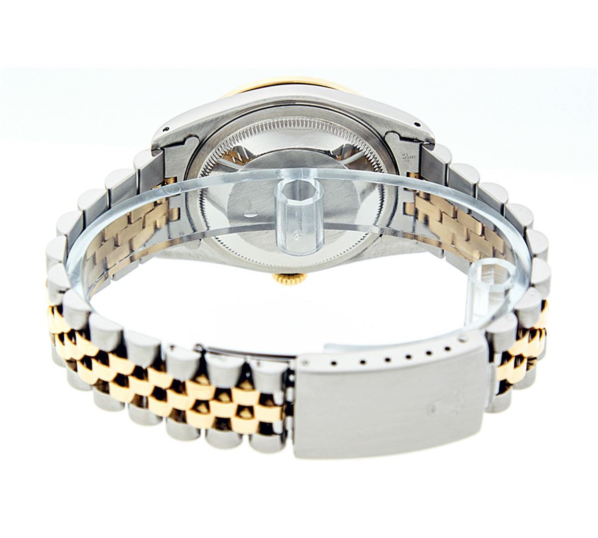 One Mens Two Tone Rolex Datejust Polished, Serviced & Electronically Tested, 14K Yellow Gold & Stainless Steel Case:36mm, 14K Yellow Gold Crown, Custom Bezel: 18K Yellow Gold Ruby Beadset Diamond Bezel, Diamond Count: 36 Diamonds + 4 Rubies, Total Weight 1.00 Carat, Clarity: SI-VS, Color: G to H. Custom Crystal: Synthetic Sapphire Cyclops Lens. Movement: Automatic Winding Movement Caliber 3035. Custom Dial: Black String Diamond Dial VVS , Diamond Count: 58 Diamonds in Dial G To H In Color, VVS Clarity. Date Window: 3 O'Clock Position Date Display, Quickset, Model: 16013 Condition: G-6 Extra Fine. Bracelet: Two Tone 14K Yellow Gold & Stainless Steel Jubilee. Bright Polish. 7.0 Inch Length, Adjustable. Standard Clasp, With Rolex Logo.