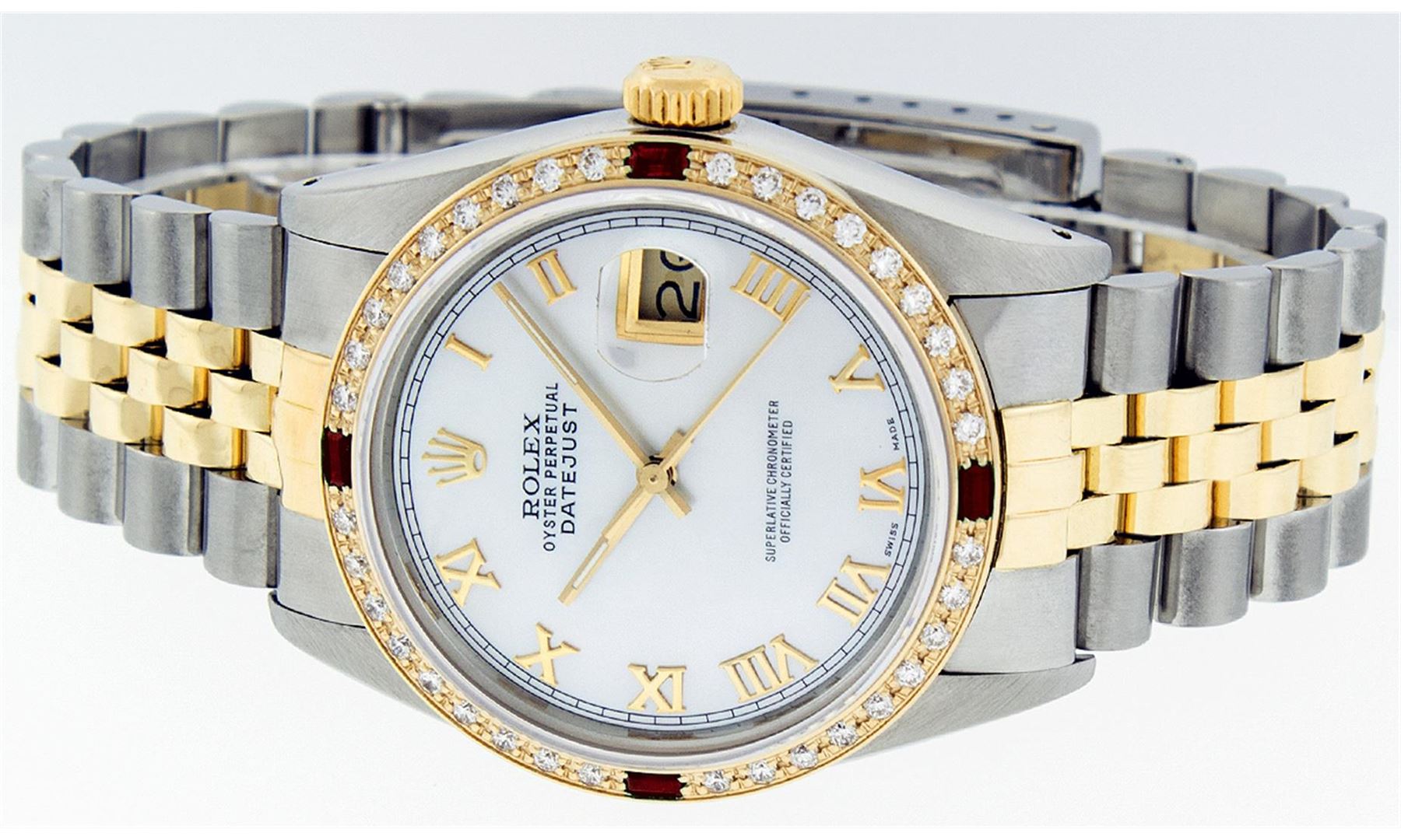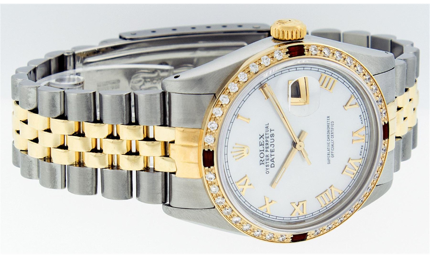 One Mens Two Tone Rolex Datejust Polished, Serviced & Electronically Tested, 14K Yellow Gold & Stainless Steel Case:36mm, 14K Yellow Gold Crown, Custom Bezel: 18K Yellow Gold Ruby Beadset Diamond Bezel, Diamond Count: 36 Diamonds + 4 Ruby, Total Weight 1.00 Carat, Clarity: SI-VS, Color: G to H. Custom Crystal: Synthetic Sapphire Cyclops Lens. Movement: Automatic Winding Movement Caliber 3035. Custom Dial: Mother Of Pearl Roman Dial. Date Window: 3 O'Clock Position Date Display,  Quickset, Model: 16013 Condition: G-6 Extra Fine. Bracelet:Two Tone 14K Yellow Gold & Stainless Steel Jubilee. Bright Polish. 7.0 Inch Length, Adjustable. Standard Clasp, With Rolex Logo.