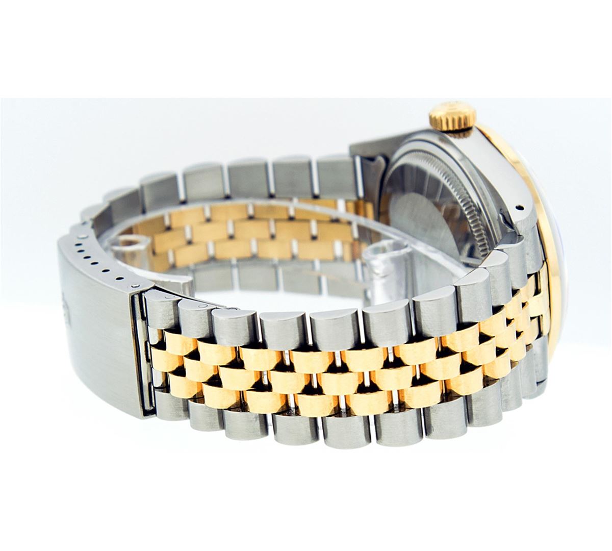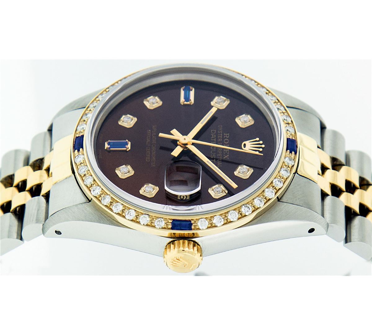 One Mens Rolex Datejust Polished Bright with Satin Finish, Serviced & Electronically Tested, Stainless Steel Case:36mm, Stainless Steel Crown, Custom Bezel: 18K Yellow Gold Sapphire Beadset Diamond Bezel, Diamond + Gem Count:36 Diamonds + 4 Sapphires, Total Weight 1.00 Carat, Clarity: SI-VS, Color: G to H. Custom Crystal: Synthetic Sapphire Cyclops Lens. Movement: Automatic Winding Movement Caliber 3035. Custom Dial: Brown Diamond With Sapphires, Diamond Count: 8 Diamond + 2 Sapphire Baguettes in Dial, Dial Color: G To H In Color, Clarity: SI-VS. Date Window: 3 O'Clock Position Date Display, Quickset, Model: 16013 Condition: G-6 Extra Fine. Bracelet: 14K Yellow Gold and Stainless Steel Jubilee. Bright Polish & Satin Finish. 7.0 Inch Length, Adjustable. Standard Clasp, With Rolex Logo.