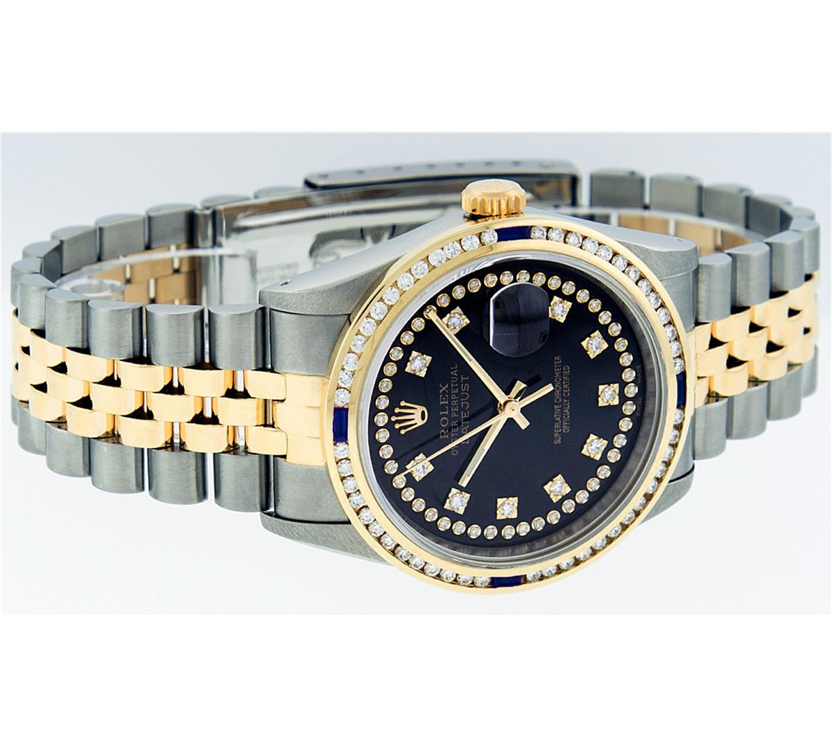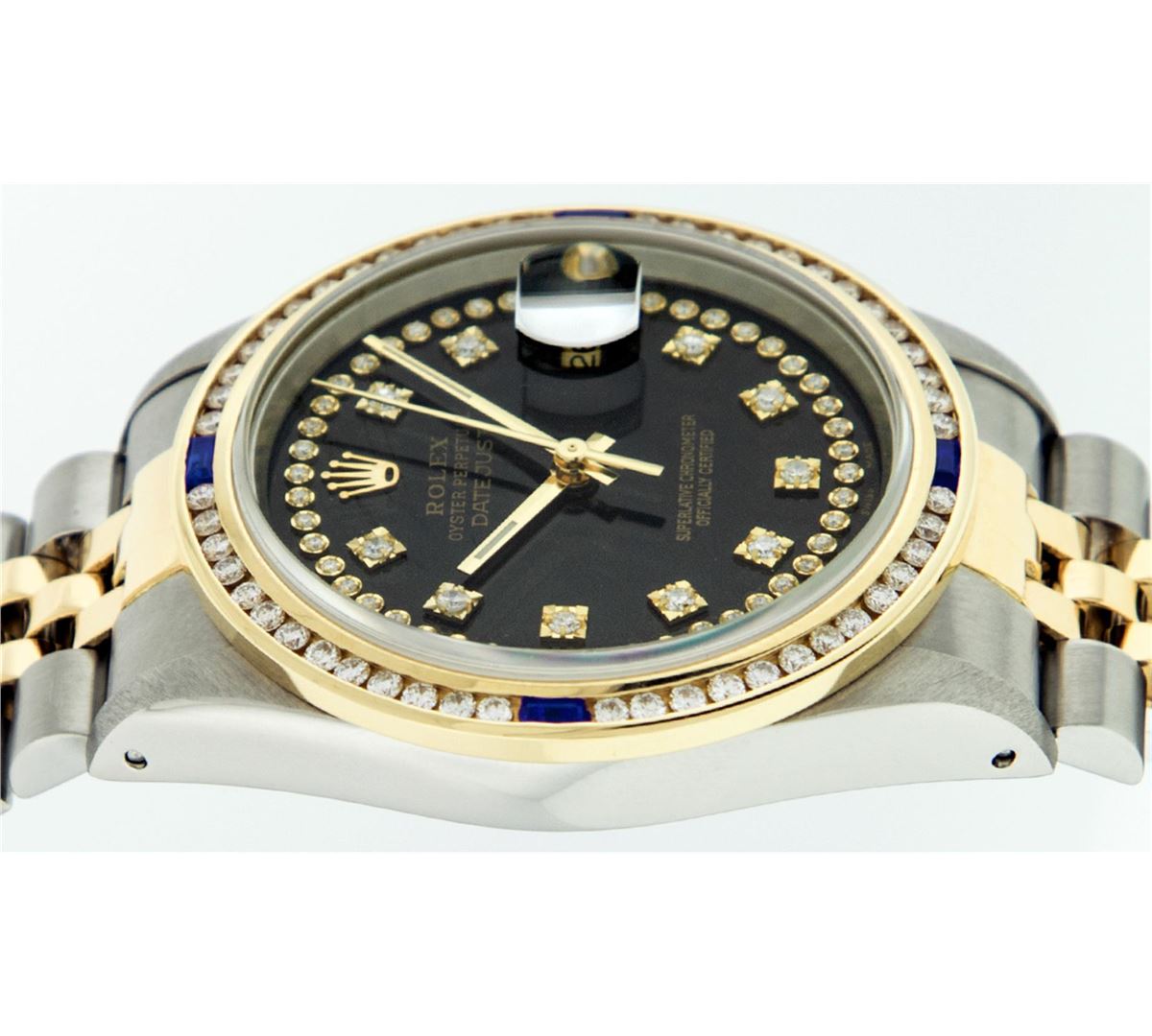 One Mens Two Tone Rolex Datejust Polished, Serviced & Electronically Tested, 14K Yellow Gold & Stainless Steel Case:36mm, 14K Yellow Gold Crown, Custom Bezel: 18K Yellow Gold Sapphire Channel Set Diamond Bezel, Diamond Count: 52 Diamonds + 4 Sapphire, Total Weight 1.30 Carat, Clarity: SI-VS, Color: G to H. Custom Crystal: Synthetic Sapphire Cyclops Lens. Movement: Automatic Winding Movement Caliber 3035. Custom Dial: Black String Diamond Dial VVS , Diamond Count: 58 Diamonds in Dial G To H In Color, VVS Clarity. Date Window: 3 O'Clock Position Date Display, Quickset, Model: 16013 Condition: G-6 Extra Fine. Bracelet:Two Tone 14K Yellow Gold & Stainless Steel Jubilee. Bright Polish. 7.0 Inch Length, Adjustable. Standard Clasp, With Rolex Logo.