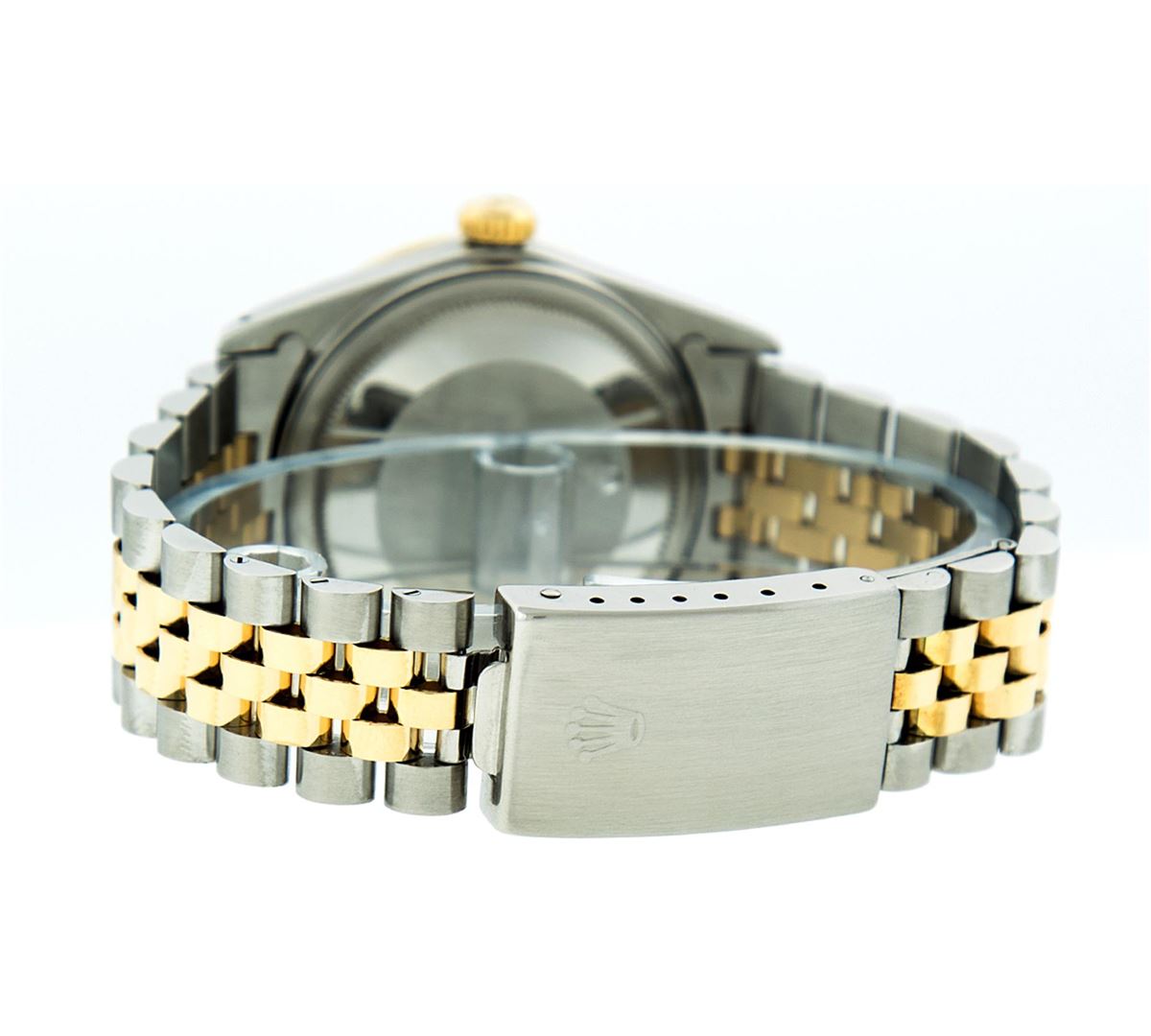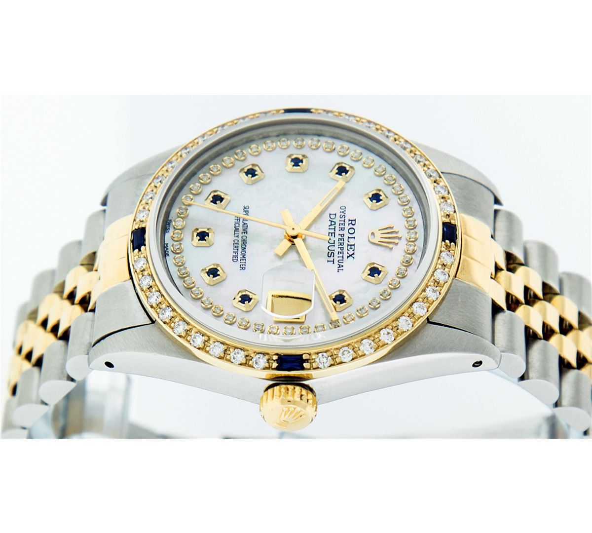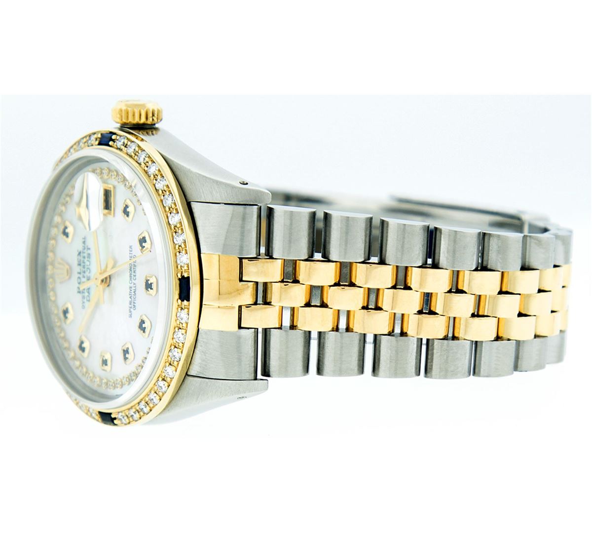One Mens Two Tone Rolex Datejust Polished, Serviced & Electronically Tested, 14K Yellow Gold & Stainless Steel Case:36mm, 14K Yellow Gold Crown, Custom Bezel: 18K Yellow Gold Sapphire Beadset Diamond Bezel, Diamond Count: 36 Diamonds + 4 Sapphires Total Weight 1.00 Carat, Clarity: Si-VS, Color: G to H. Custom Crystal: Synthetic Sapphire Cyclops Lens. Movement: Automatic Winding Movement Caliber 3035. Custom Dial: Mother Of Pearl Sapphire String Diamond Dial , Diamond + Gem Count: 10 Sapphires + 48 Diamonds in Dial G To H In Color, SI-VS Clarity. Date Window: 3 O'Clock Position Date Display, Quickset, Model: 16013 Condition: G-6 Extra Fine. Bracelet:Two Tone 14K Yellow Gold & Stainless Steel Jubilee. Bright Polish. 7.0 Inch Length, Adjustable. Standard Clasp, With Rolex Logo.