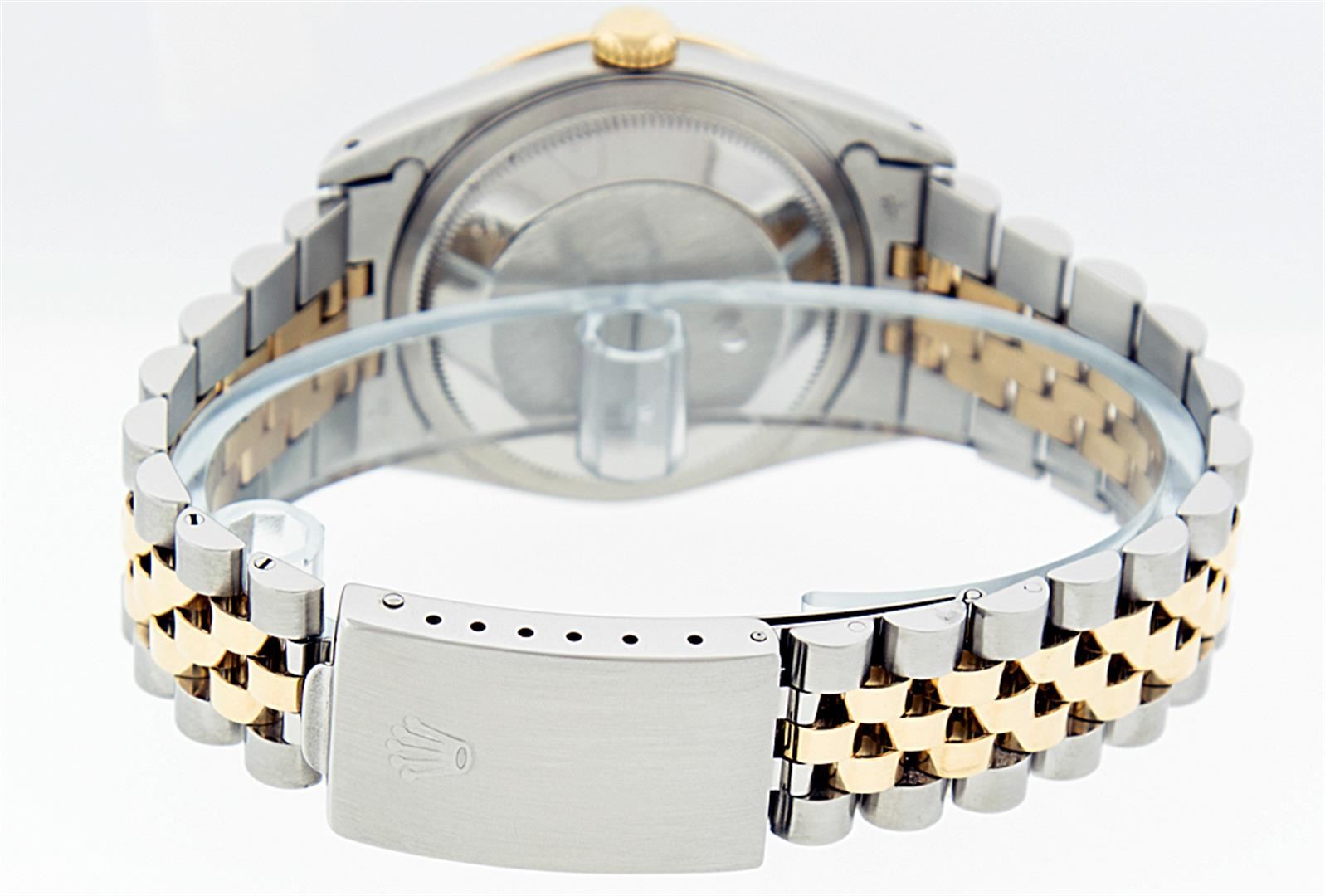 One Mens Two Tone Rolex Datejust Polished, Serviced & Electronically Tested, 14K Yellow Gold & Stainless Steel Case:36mm, 14K Yellow Gold Crown, Custom Bezel: 18K Yellow Gold Sapphire Beadset Diamond Bezel, Diamond Count: 36 Diamonds + 4 Sapphires, Total Weight 1.00 Carat, Clarity: SI-VS, Color: G to H. Custom Crystal: Synthetic Sapphire Cyclops Lens. Movement: Automatic Winding Movement Caliber 3035. Custom Dial: Black String Diamond Dial VVS , Diamond Count: 58 Diamonds in Dial G To H In Color, VVS Clarity. Date Window: 3 O'Clock Position Date Display, Quickset, Model: 16013 Condition: G-6 Extra Fine. Bracelet: Two Tone 14K Yellow Gold & Stainless Steel Jubilee. Bright Polish. 7.0 Inch Length, Adjustable. Standard Clasp, With Rolex Logo.