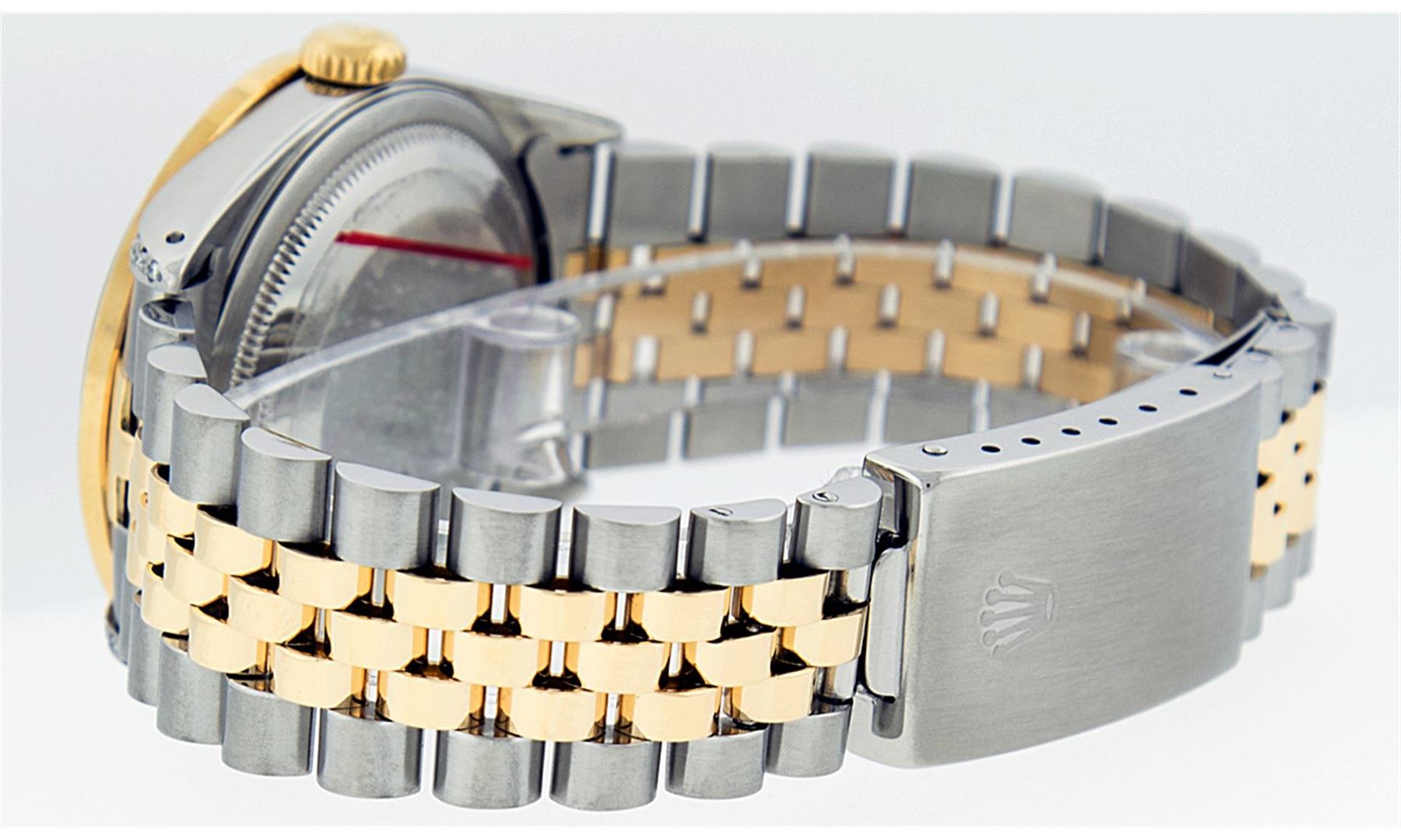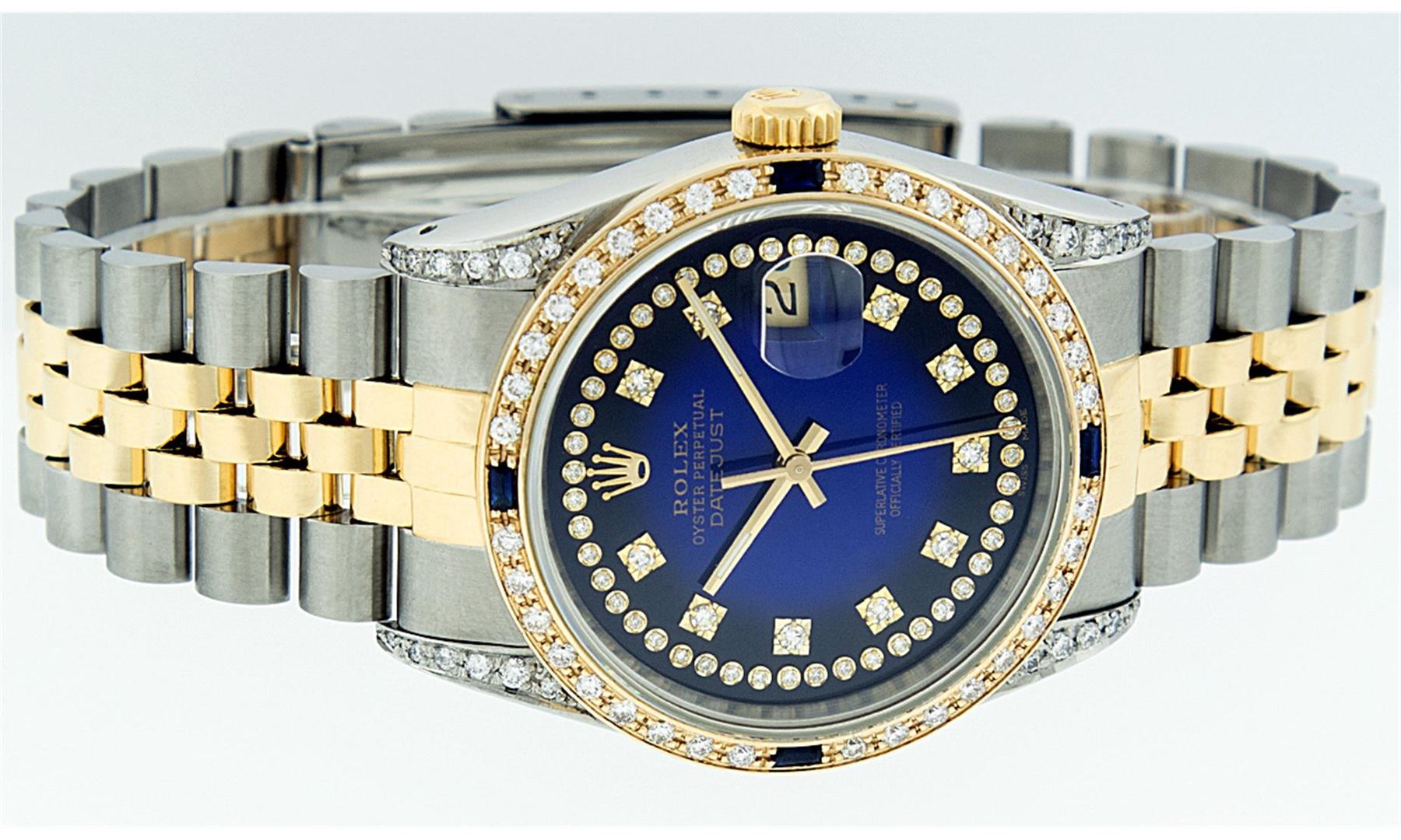 One Mens Two Tone Rolex Datejust Polished, Serviced & Electronically Tested,14K Yellow Gold And Stainless Steel Case:36mm, Diamond Lugs: Diamond Count: 24 Diamonds In Lugs, Diamond Weight: .35 Carat. Clarity SI-VS, Color: G to H. 14K Yellow Gold Crown, Custom Bezel: 18K Yellow Gold Sapphire Beadset Diamond Bezel. Diamond Count: 36 Diamonds + 4 Sapphires. Total Weight 1.0 Carat, Clarity: SI-VS, Color: G to H. Custom Crystal: Synthetic Sapphire Cyclops Lens. Movement: Automatic Winding Movement Caliber 3035. Custom Dial: Blue Vignette String Diamond Dial VVS, Diamond Count: 58 Diamonds In Dial, Clarity: SI-VS, Color: VVS. Date Window: 3 O'Clock Position Date Display, Quickset, Model: 16013 Condition: G-6 Extra Fine. Bracelet: 14K Yellow Gold And Stainless Steel Jubilee. Bright Polish & Satin Finish. 7.0 Inch Length, Adjustable. Standard Clasp, With Rolex Logo.