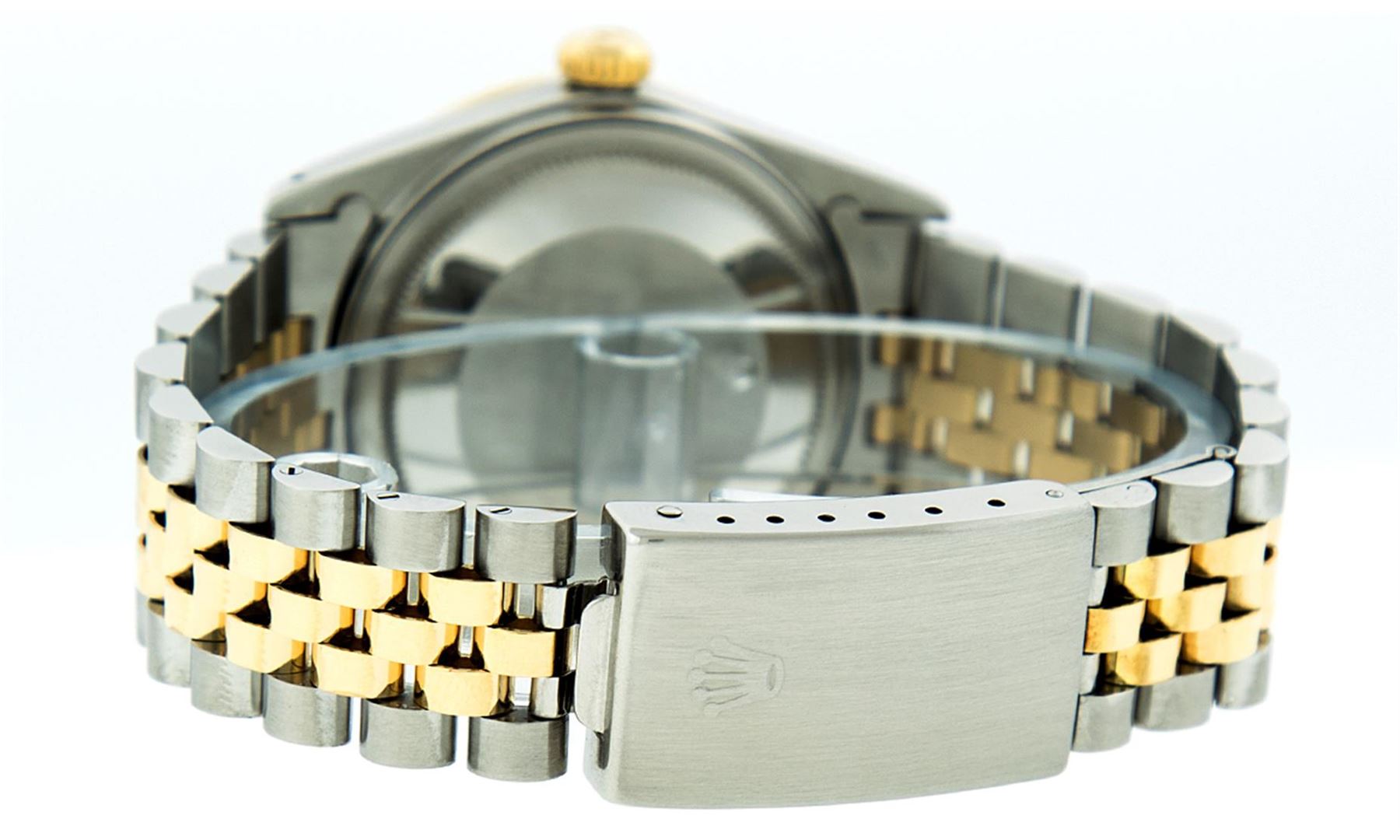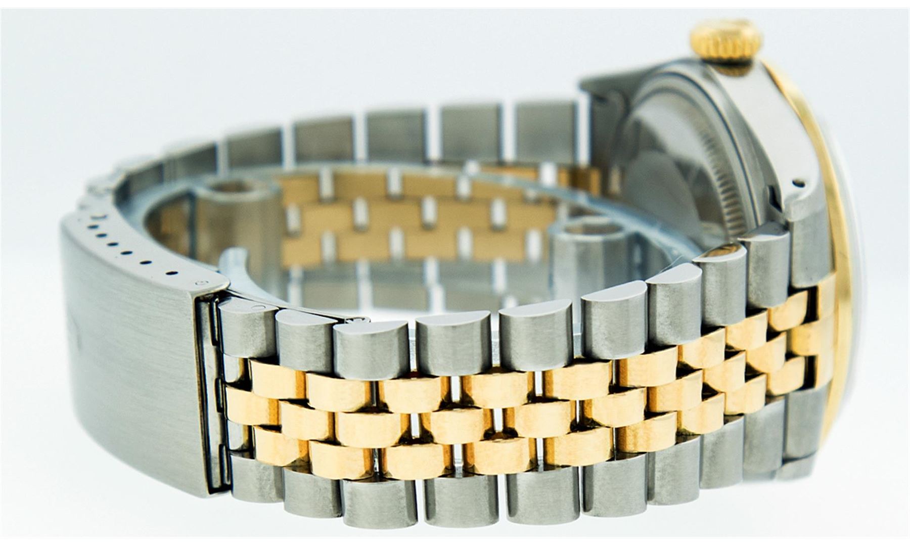 One Mens Two Tone Rolex Datejust Polished, Serviced & Electronically Tested, 14K Yellow Gold & Stainless Steel Case:36mm, 14K Yellow Gold Crown, Custom Bezel: 18K Yellow Gold Sapphire Beadset Diamond Bezel, Diamond Count: 36 Diamonds + 4 Sapphires Total Weight 1.00 Carat, Clarity: Si-VS, Color: G to H. Custom Crystal: Synthetic Sapphire Cyclops Lens. Movement: Automatic Winding Movement Caliber 3035. Custom Dial: Mother Of Pearl Sapphire String Diamond Dial , Diamond + Gem Count: 10 Sapphires + 48 Diamonds in Dial G To H In Color, SI-VS Clarity. Date Window: 3 O'Clock Position Date Display, Quickset, Model: 16013 Condition: G-6 Extra Fine. Bracelet:Two Tone 14K Yellow Gold & Stainless Steel Jubilee. Bright Polish. 7.0 Inch Length, Adjustable. Standard Clasp, With Rolex Logo.