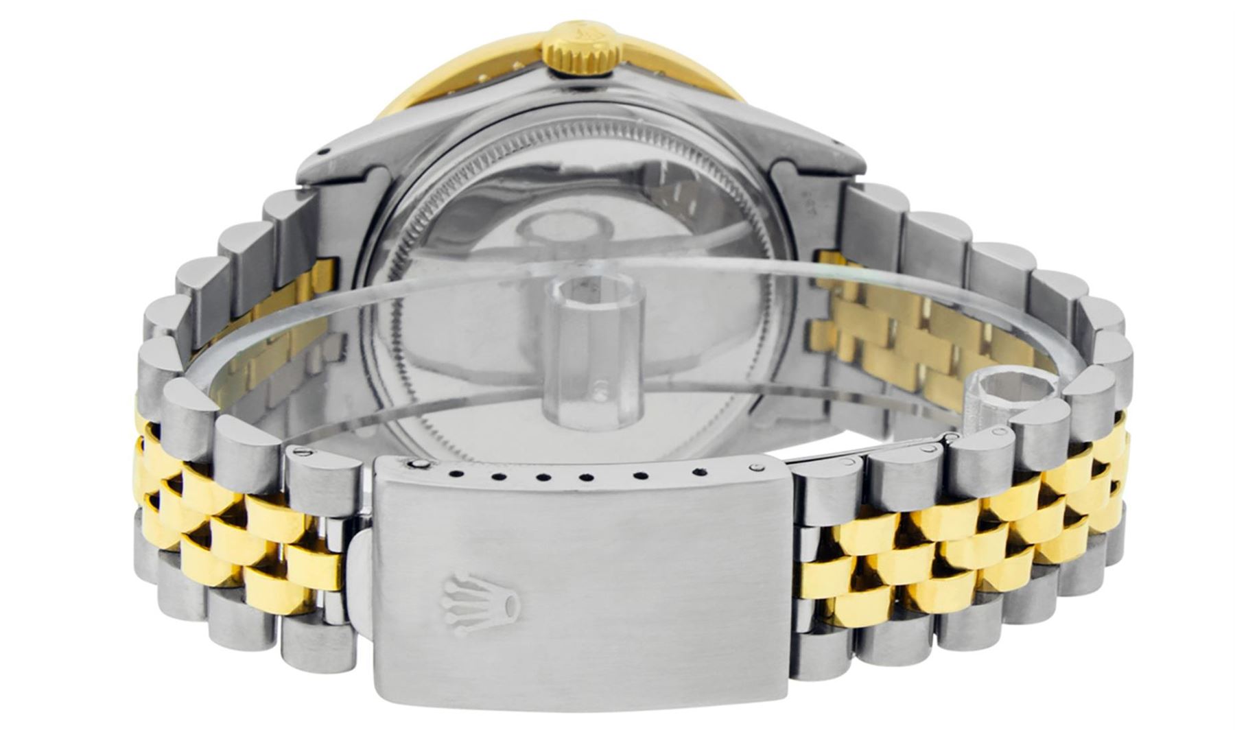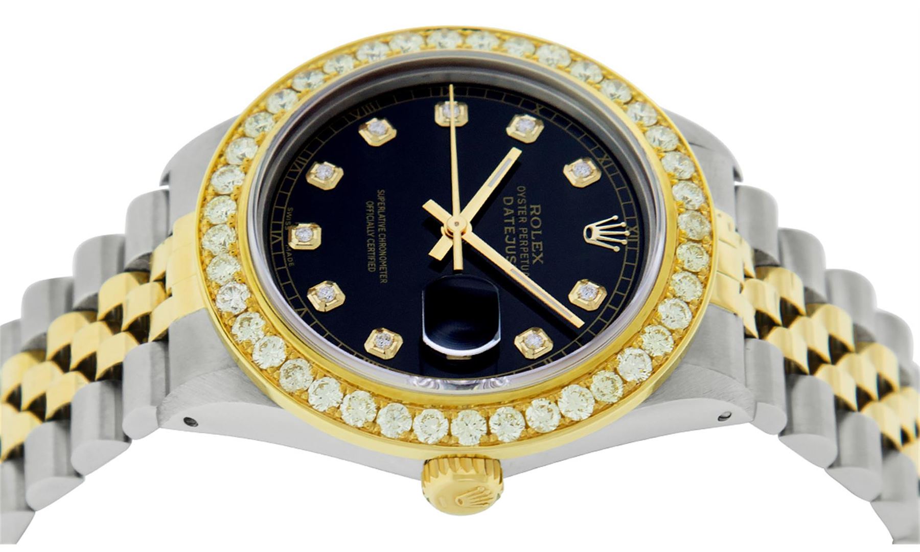 One Men's 14K Yellow Gold Two Tone Rolex Datejust Polished Bright with Satin Finish, Serviced & Electronically Tested, 14K Yellow Gold And Stainless Steel Case: 36mm, Yellow Gold Crown, Custom Bezel: New 18K Yellow Gold Beadset Diamond Bezel, Diamond Count: 40 Diamonds On Bezel, Total Weight 2.5 Carat, Clarity: SI-VS, Color: G to H. Custom Crystal: New Scratch Resistant Synthetic Sapphire Cyclops Lens. Custom Hands: New Luminescent Hands. Movement: Automatic Winding Movement Caliber 3035. Custom Dial: Black Diamond Dial With Roman Track, Diamond Count: 10 Diamonds On Dial, Dial Color: G To H In Color, Clarity: VS2-SI1. Date Window: 3 O'Clock Position Date Display, Quickset, Model: Datejust. Condition: G-6 Extra Fine. Bracelet: 14K Yellow Gold And Stainless Steel Jubilee Band. Bright Polish & Satin Finish. 7.0 Inch Length, Adjustable. Standard Clasp, With Rolex Logo. This Watch Has Been Serviced and Polished And It Is Free Of All Dents And Scratches And Has Been Time Tested.