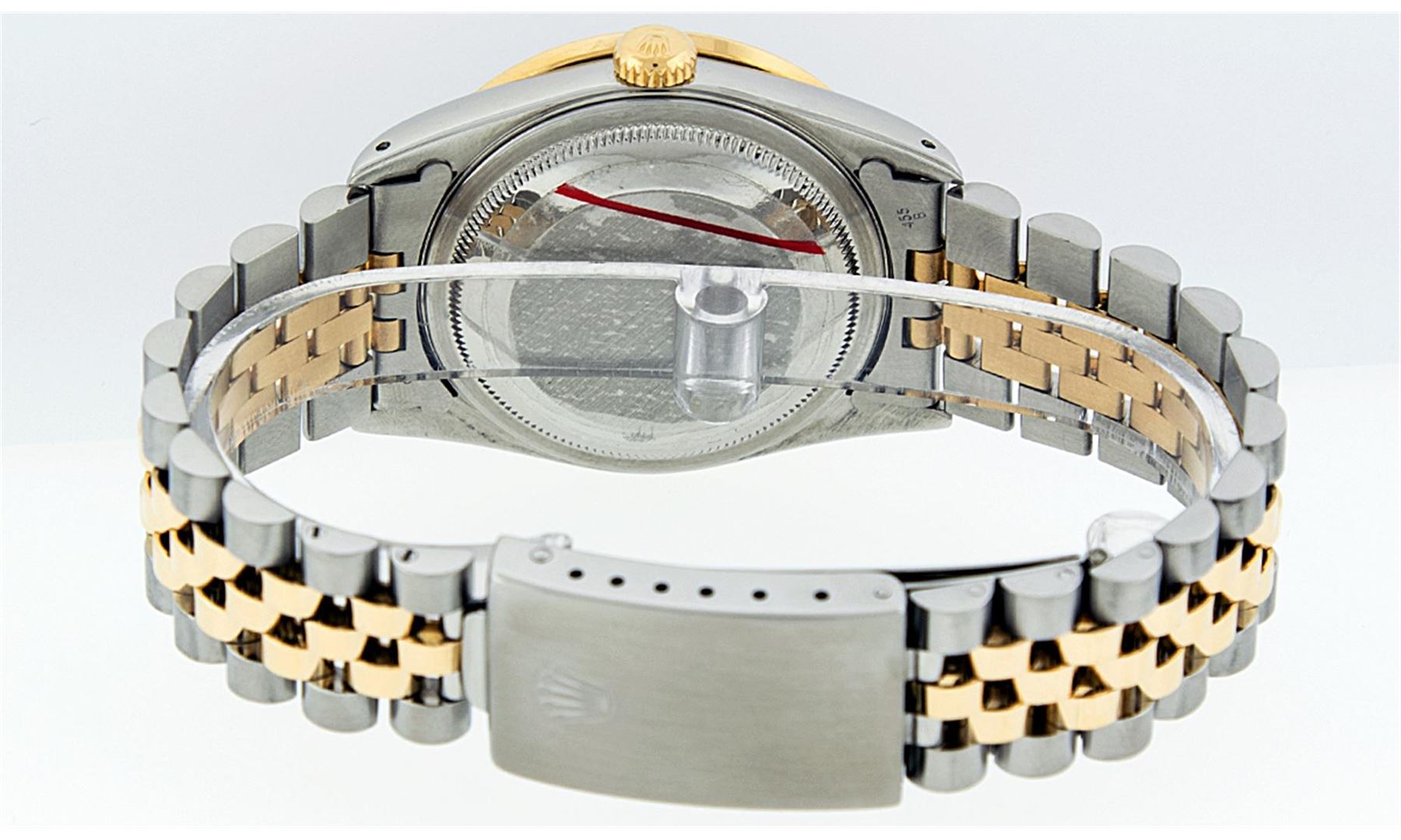 One Gents 18K Yellow Gold Two Tone Rolex Datejust Polished, Serviced & Electronically Tested, 18K Yellow Gold & Stainless Steel Case:36mm, Diamond Lugs On Case, Diamond Count: 16 Diamonds On Lugs, Color: G To H, Clarity: SI-VS. 18K Yellow Gold Crown, Custom Bezel: 18K Yellow Gold Sapphire Diamond Beadset Bezel, Diamond Count: 36 Diamonds + 4 Sapphires In Bezel. Clarity: Si-VS, Color: G to H. Custom Crystal: Synthetic Sapphire Cyclops Lens. Movement: Automatic Winding Movement Caliber 3035. Custom Dial: Mother Of Pearl Diamond Dial, Diamond Count: 10 Diamonds In Dial, Color: G To H, Clarity: SI-VS, Date Window: 3 O'Clock Position Date Display, Quickset, Model: 16013, Condition: G-6 Extra Fine The Watch Is In Very Good Condition Free Of All Scratches And Dents. Bracelet: Two Tone Yellow Gold & Stainless Steel Jubilee Band. Bright Polish. 7.0 Inch Length, Adjustable. Standard Clasp, With Rolex Logo.