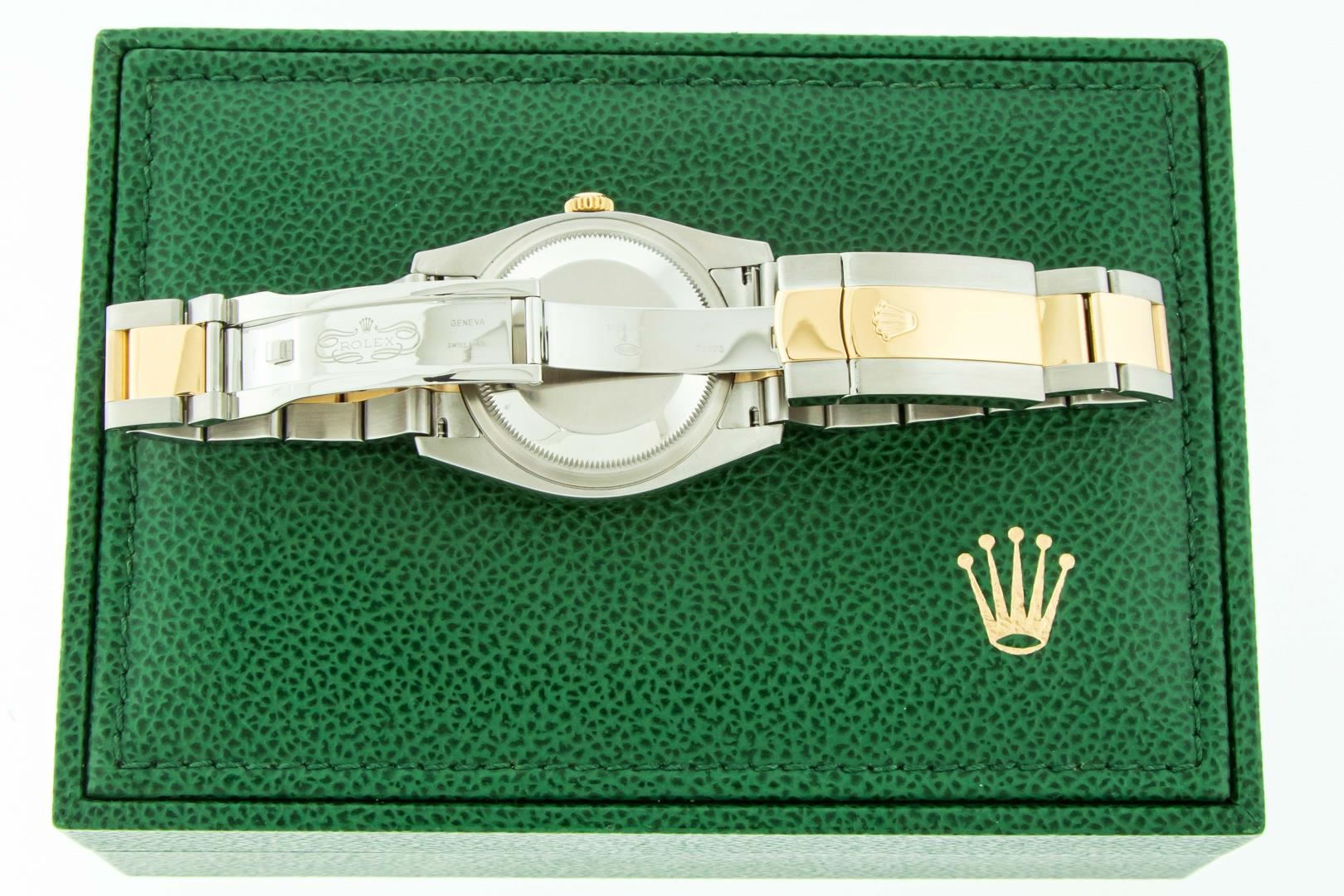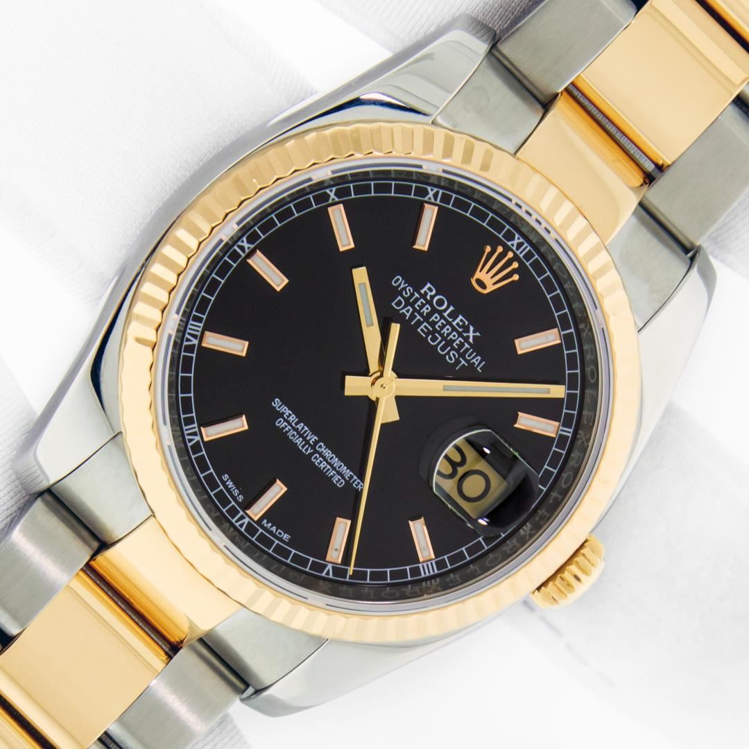One Mens Pre Owned 18K Yellow Gold and Stainless Steel Two Tone Rolex Datejust Polished, Serviced & Electronically Tested, Rolex Yellow Gold & Stainless Steel Case: 36mm, Rolex Yellow Gold Crown, Rolex Bezel: Rolex 18K Yellow Gold Fluted Bezel. Crystal: Sapphire With Cyclops Lens. Hands: Lumi Hands. Rolex Dial: Black Dial With Square Roman Track, Date Window: 3 O'Clock Position Date Display, Quickset, Model: Quickset Datejust 116233. Condition: G-6 Extra Fine. Rolex Bracelet: 18K Yellow Gold and Stainless Steel Oyster Band. Bright Polish & Satin Finish. 7.0 Inch Length, Adjustable. Standard Clasp, With Rolex Logo. This Watch Comes With A Rolex Box.