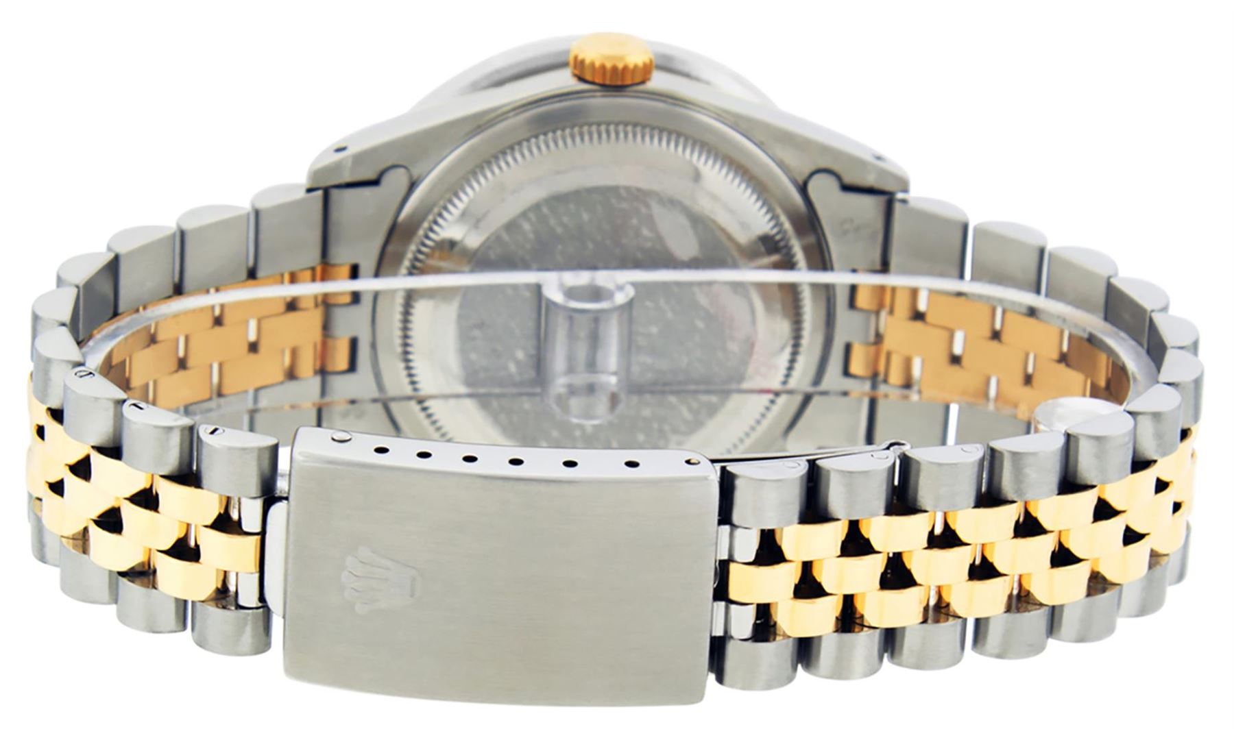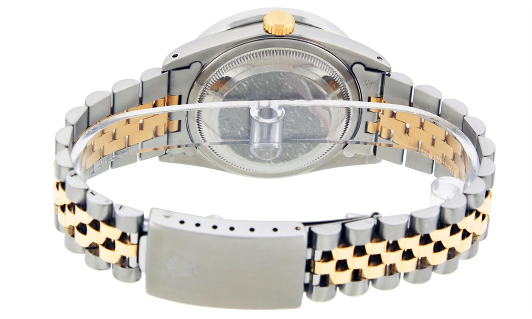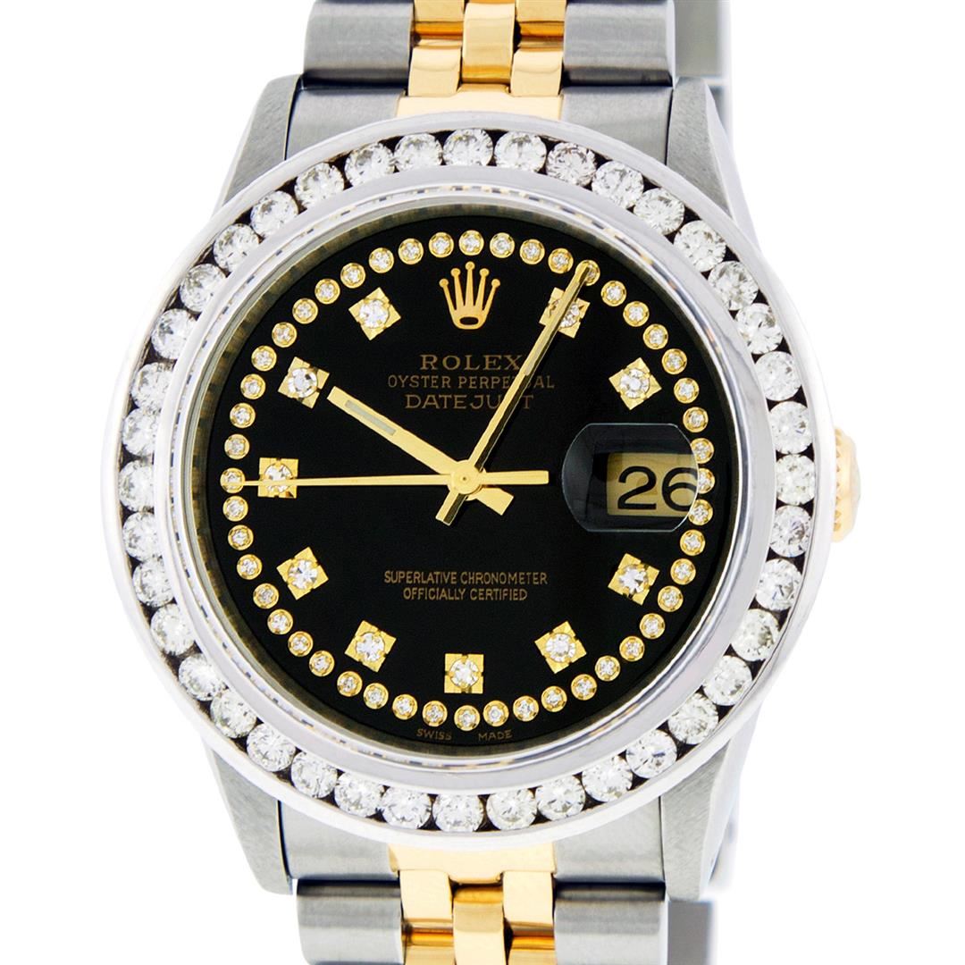 One Mens 14K Yellow Gold Rolex Datejust Polished Bright with Satin Finish, Serviced & Electronically Tested, Stainless Steel Case: 36mm, Yellow Gold Crown, Custom Bezel: New 18K White Gold 3ct Channel Set Diamond Bezel, Diamond Count: 40 Diamonds, Total Weight 3.00 Carat, Clarity: SI-VS, Color: G to H. Custom Crystal: New Synthetic Sapphire Cyclops Lens. Custom Hands: New Luminecent Hands. Movement: Automatic Winding Movement Caliber 3035. Custom Dial: Black String Diamond Dial, Diamond Count: 58 Diamonds In Dial, Color: G to H, Clarity: VS. Date Window: 3 O'Clock Position Date Display, Quickset, Model: 16013 Datejust. Condition: G-6 Extra Fine. Bracelet: 14K Yellow Gold And Stainless Steel Jubilee Band. Bright Polish & Satin Finish. 7.0 Inch Length, Adjustable. Standard Clasp, With Rolex Logo. This Watch Has Been Serviced And Polished It Is Free Of All Scratches And Dents.