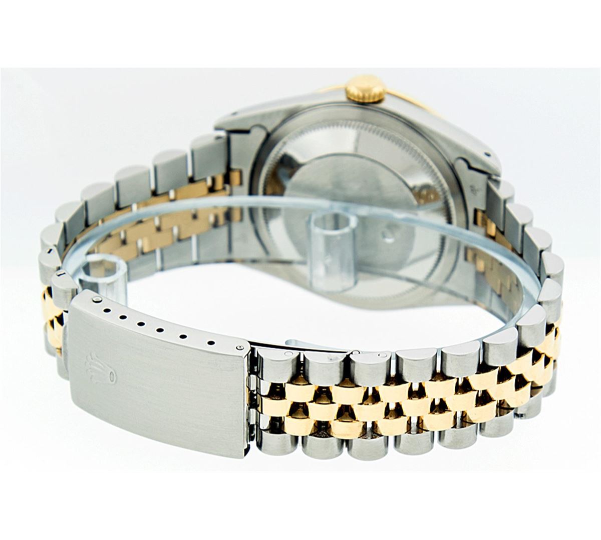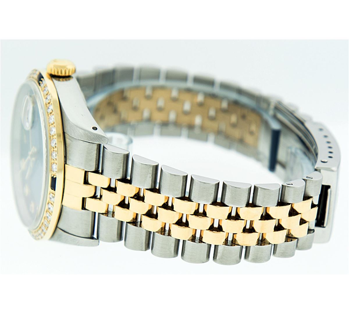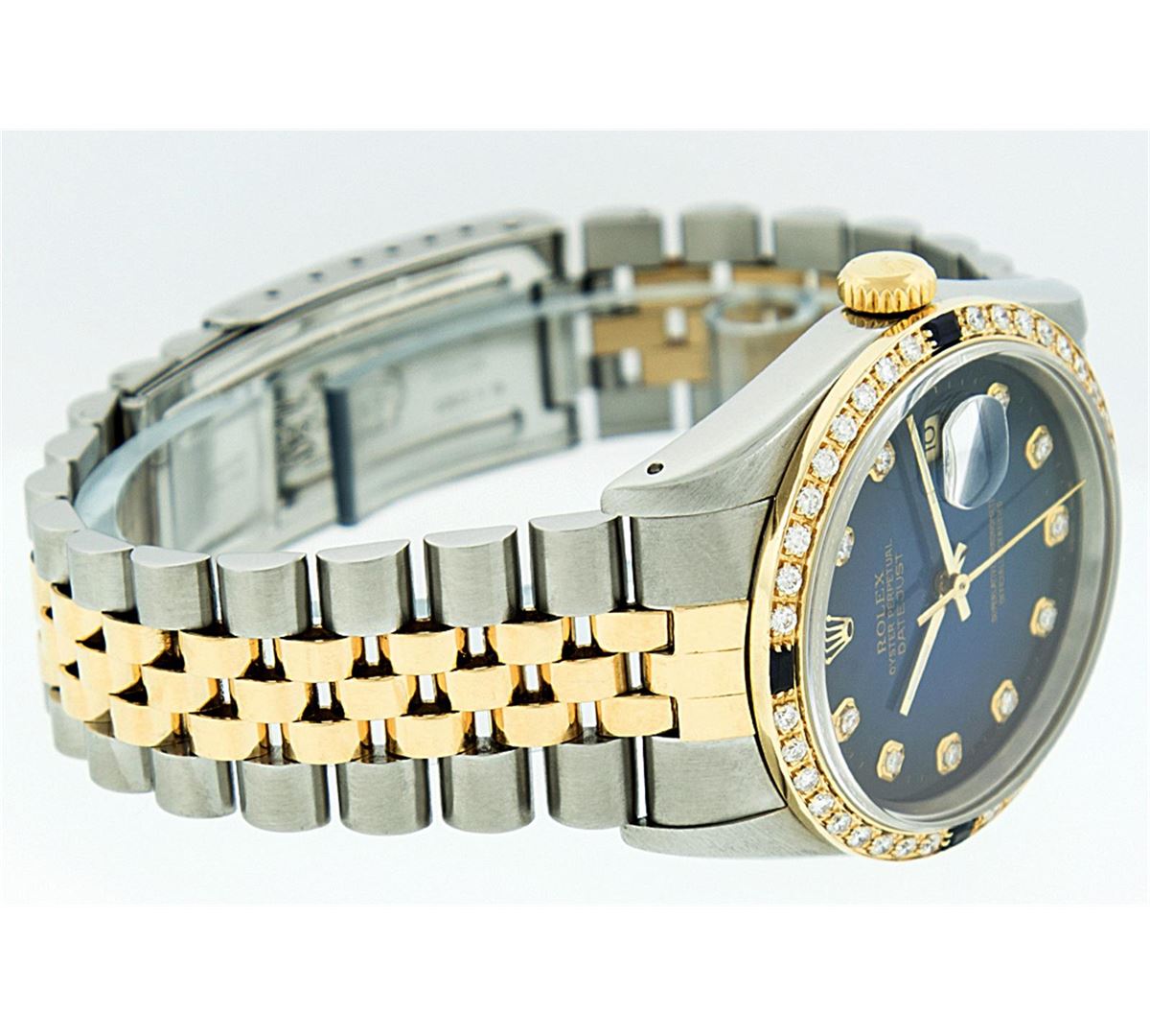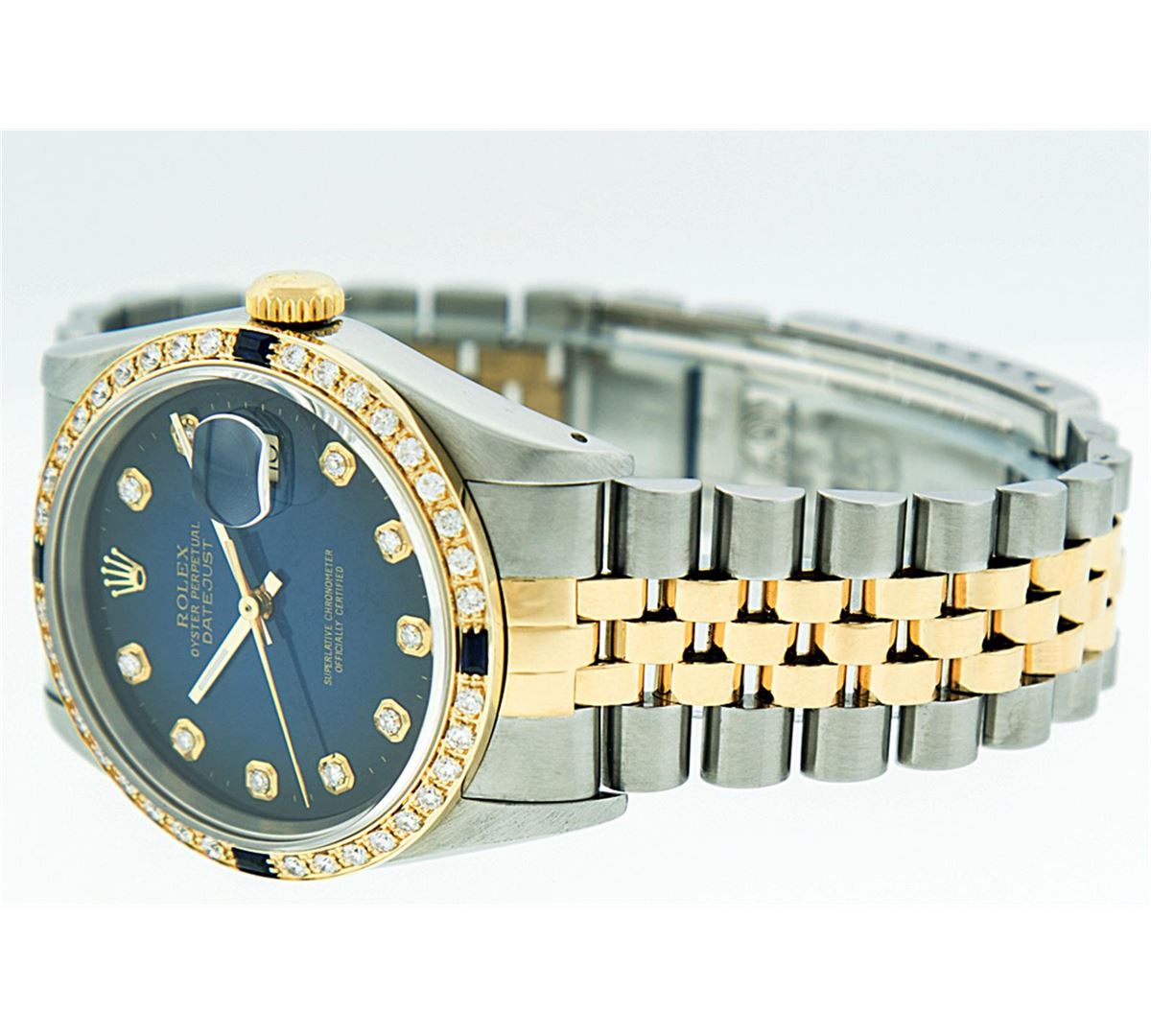 One Mens Two Tone Rolex Datejust Polished, Serviced & Electronically Tested, 14K Yellow Gold & Stainless Steel Case:36mm, 14K Yellow Gold Crown, Custom Bezel: 18K Yellow Gold Sapphire Beadset Diamond Bezel, Diamond Count: 36 Diamonds + 4 Sapphires Total Weight 1.00 Carat, Clarity: Si-VS, Color: G to H. Custom Crystal: Synthetic Sapphire Cyclops Lens. Movement: Automatic Winding Movement Caliber 3035. Custom Dial: Blue Vignette With Diamond Hour Markers. Diamond Count: 10 Diamonds Clarity: SI-VS, Color: Color G to H Date Window: 3 O'Clock Position Date Display, Quickset, Model: 16013 Condition: G-6 Extra Fine. Bracelet:Two Tone 14K Yellow Gold & Stainless Steel Jubilee. Bright Polish. 6.5 Inch Length, Adjustable. Standard Clasp, With Rolex Logo.