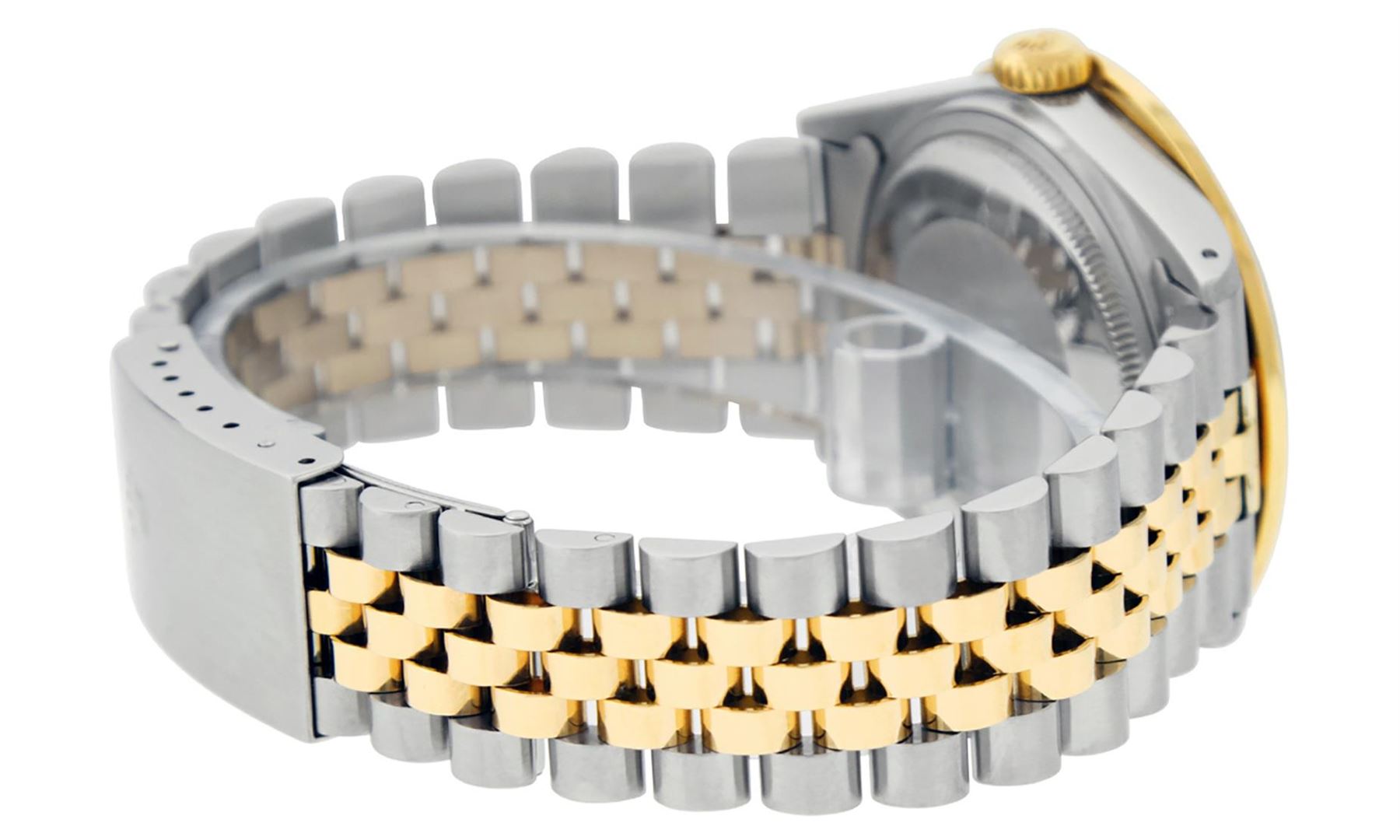 One Mens 14K Yellow Gold Rolex Datejust Polished Bright with Satin Finish, Serviced & Electronically Tested, Stainless Steel Case: 36mm, Yellow Gold Crown, Custom Bezel: New 18K Yellow Gold 3ct Channel Set Diamond Bezel, Diamond Count: 40 Diamonds In Bezel, Total Weight 3.00 Carat, Clarity: SI-VS, Color: G to H. Custom Crystal: New Scratch Resistent Synthetic Sapphire Cyclops Lens. Custom Hands: New Luminecent Hands. Movement: Automatic Winding Movement Caliber 3035. Custom Dial: Blue Vignette String Diamond Dial, Diamond Count: 58 Diamonds In Dial, Color: G to H, Clarity: VS. Date Window: 3 O'Clock Position Date Display, Quickset, Model: 16013 Datejust. Condition: G-6 Extra Fine. Bracelet: 14K Yellow Gold And Stainless Steel Jubilee Band. Bright Polish & Satin Finish. 7.0 Inch Length, Adjustable. Standard Clasp, With Rolex Logo. This Watch Has Been Serviced And Polished It Is Free Of All Scratches And Dents.