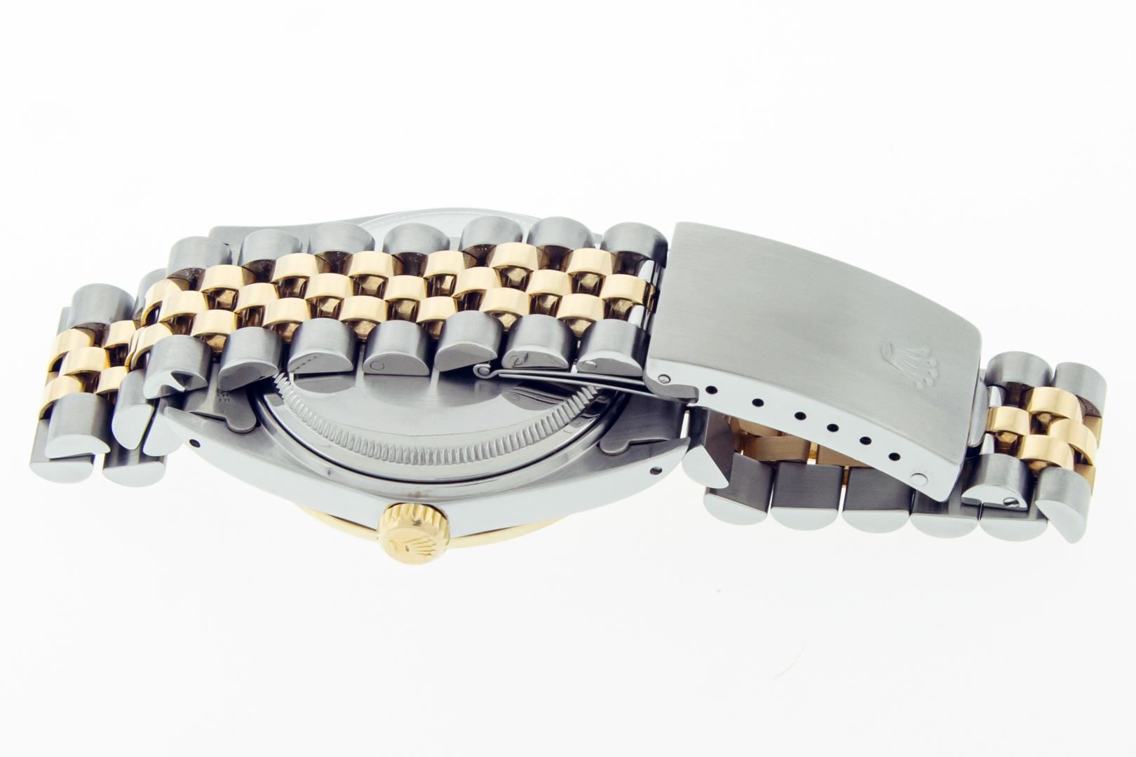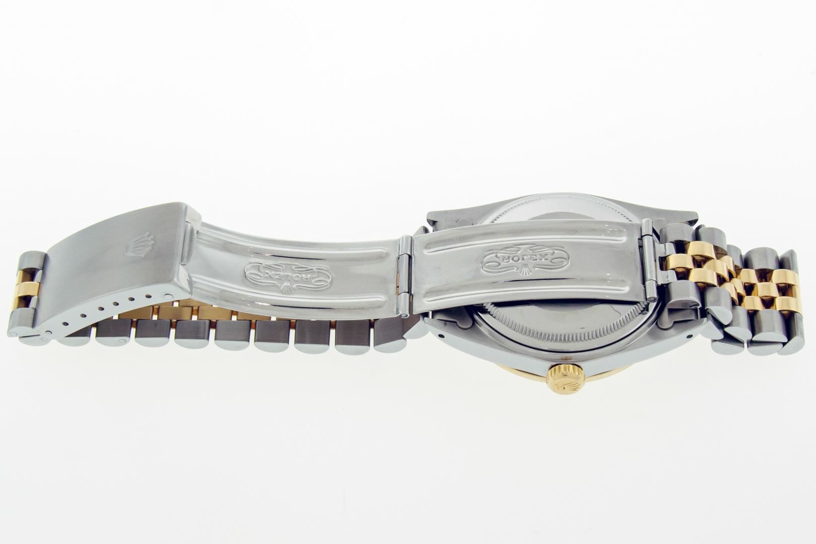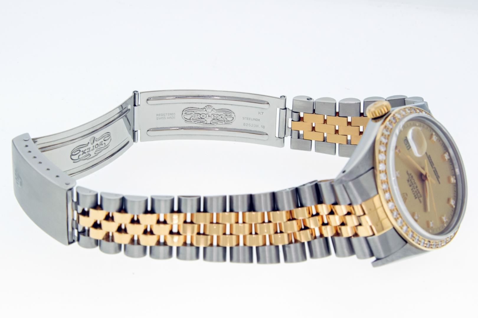 One Mens Pre Owned Two Tone Yellow Gold & Stainless Steel Rolex Datejust Polished, Serviced & Electronically Tested, Yellow Gold & Stainless Steel Case: 36mm, Rolex Yellow Gold Crown, Custom Bezel: New 18K Yellow Gold Beadset Diamond Bezel, Diamond Count: 44 Diamonds, Clarity: SI-VS, Color: G to H. Custom Crystal: New Sapphire With Magnified Date Window. Custom Hands: New Hands. Rolex Movement: Automatic Winding Movement. Rolex Factory Dial: Champagne Dial With Diamond Hour Markers. Diamond Count: 10 Diamonds In Dial. Date Window: 3 O'Clock Position Date Display, Quickset, Model: Datejust. Condition: G-6 Extra Fine. Rolex Bracelet: Two Tone Yellow Gold & Stainless Steel Jubilee Band. Bright Polish. 7.0 Inch Length, Adjustable. Standard Clasp, With Rolex Logo. This Watch Has Been Serviced Time Tested And Is In Excellent Condition It Is Free Of All Scratches And Dents.