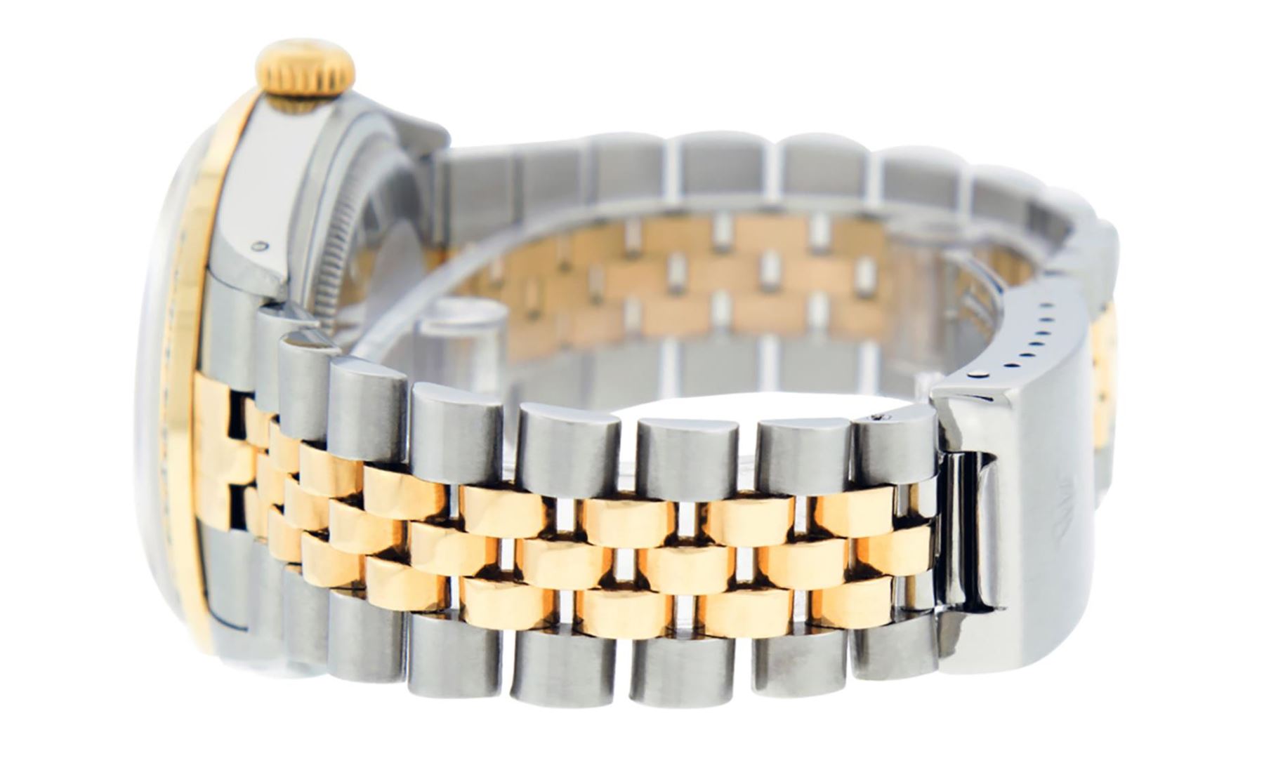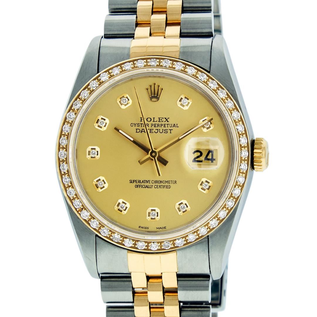 One Mens Pre Owned Rolex Two Tone Yellow Gold And Stainless Steel Datejust Polished, Serviced & Electronically Tested, Rolex Yellow Gold & Stainless Steel Case: 36mm, Rolex Yellow Gold Crown, Custom Bezel: New 18K Yellow Gold Beadset Diamond Bezel, Diamond Count: 44 Diamonds On Bezel. Custom Crystal: New Sapphire With Date Window. Custom Hands: New Luminescent Hands. Rolex Movement: Automatic Winding Movement 3035. Custom Dial: Custom Champagne Dial With Added Diamond Hour Markers. Diamond Count: 10 Diamonds On Dial. Date Window: 3 O'Clock Position Date Display, Quickset, Model: Datejust. Condition: G-6 Extra Fine. Rolex Bracelet: Two Tone Yellow Gold And Stainless Steel Jubilee Band. Bright Polish. 7.0 Inch Length, Adjustable. Standard Clasp, With Rolex Logo. This Watch Has Been Serviced Time Tested And Is In Excellent Condition It Is Free Of All Scratches And Dents.