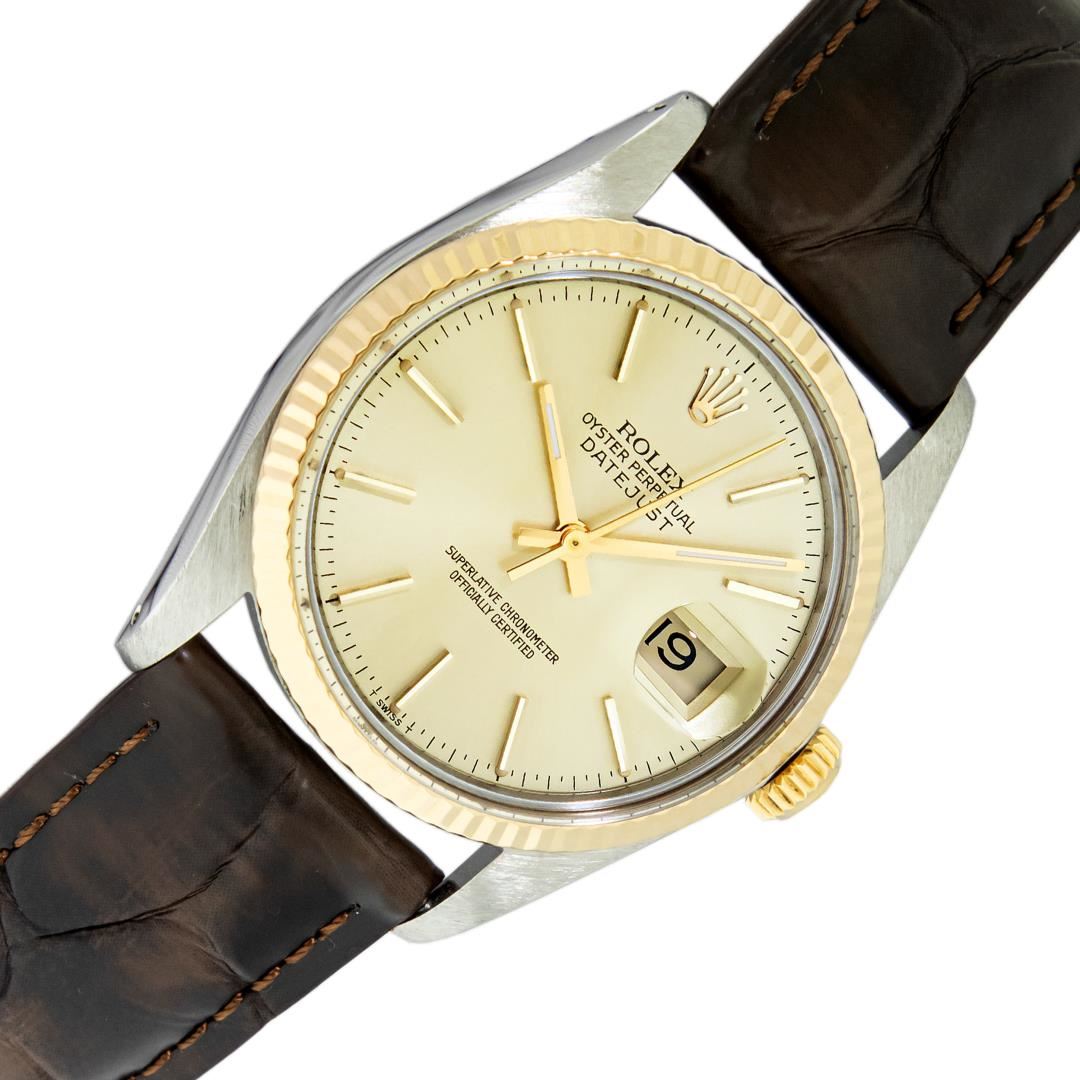 One Mens Pre Owned Two Tone Yellow Gold And Stainless Steel Rolex Datejust Polished, Serviced & Electronically Tested, Rolex Yellow Gold & Stainless Steel Case: 36mm, Rolex Yellow Gold Crown, Rolex Bezel: Yellow Gold Fluted Bezel. Custom Crystal: New Plastic With Date Window. Custom Hands: New Hands. Rolex Movement: Automatic Winding Movement. Rolex Dial: Champagne With Index Hour Markers And Dash Track. Date Window: 3 O'Clock Position Date Display, Quickset, Model: Datejust. Condition: G-6 Extra Fine. Custom Band: New Brown Leather Band 7.0 Inch Length with New Custom Pin Buckle Clasp. This Watch Has Been Serviced And Polished It Is Free Of All Scratches And Dents.