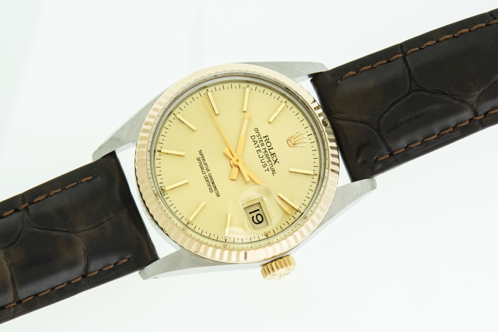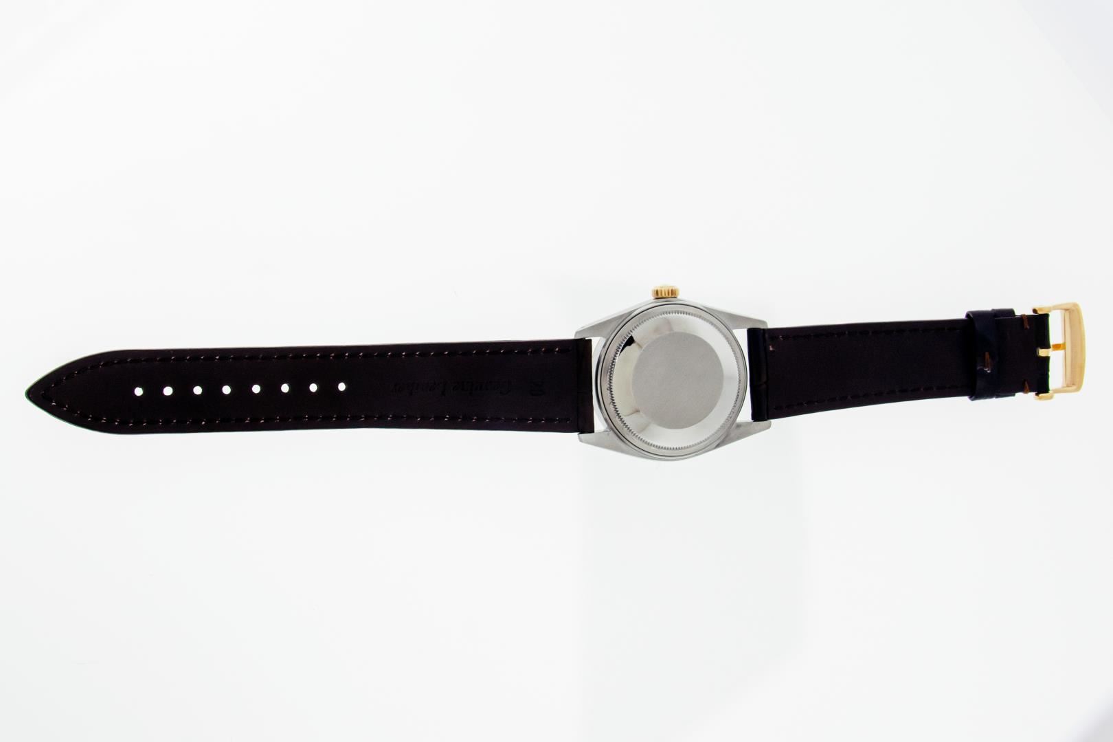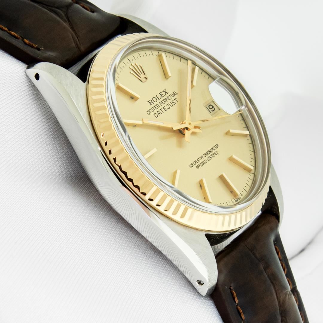 One Mens Pre Owned Two Tone Yellow Gold And Stainless Steel Rolex Datejust Polished, Serviced & Electronically Tested, Rolex Yellow Gold & Stainless Steel Case: 36mm, Rolex Yellow Gold Crown, Rolex Bezel: Yellow Gold Fluted Bezel. Custom Crystal: New Plastic With Date Window. Custom Hands: New Hands. Rolex Movement: Automatic Winding Movement. Rolex Dial: Champagne With Index Hour Markers And Dash Track. Date Window: 3 O'Clock Position Date Display, Quickset, Model: Datejust. Condition: G-6 Extra Fine. Custom Band: New Brown Leather Band 7.0 Inch Length with New Custom Pin Buckle Clasp. This Watch Has Been Serviced And Polished It Is Free Of All Scratches And Dents.
