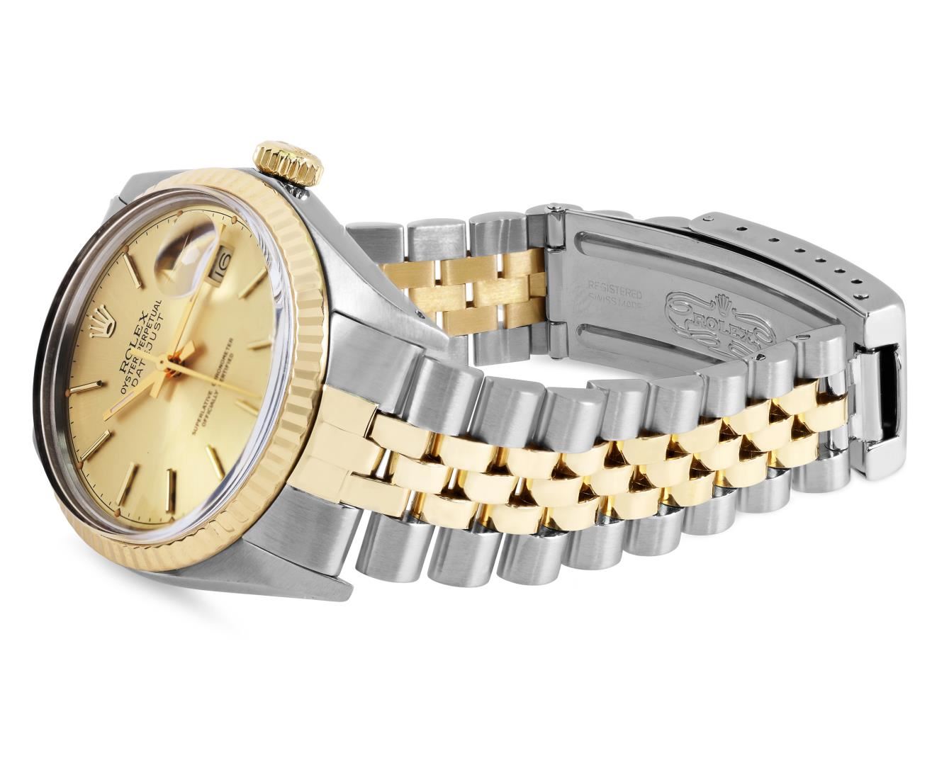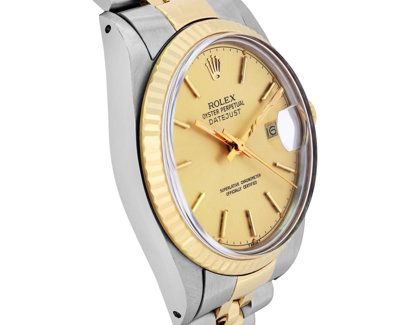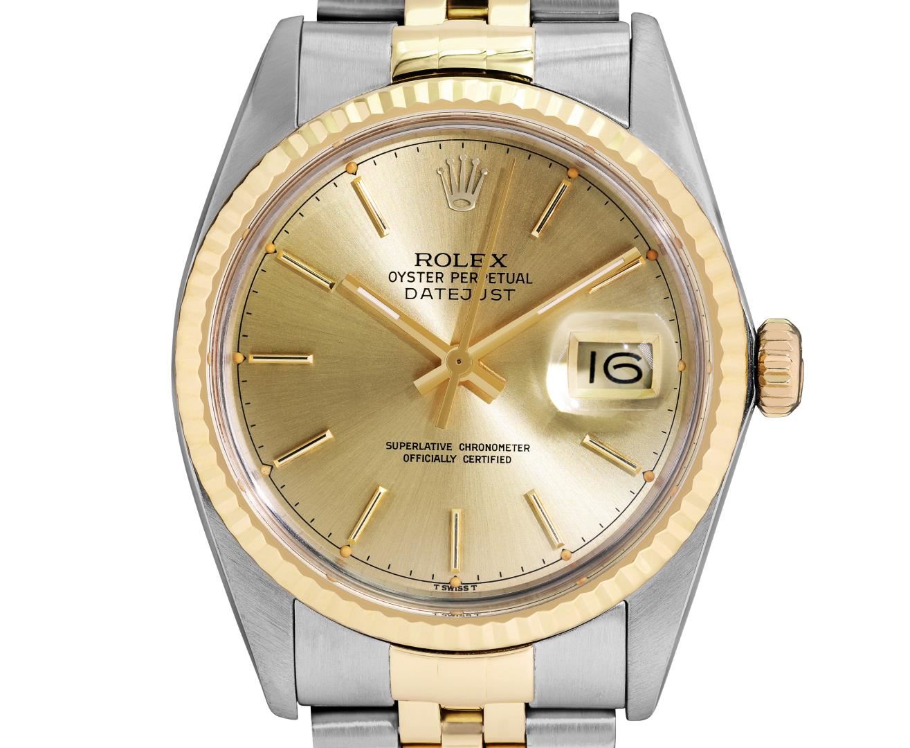 One Mens Pre Owned Yellow Gold Two Tone Rolex Datejust Polished, Serviced And Electronically Tested, Rolex Yellow Gold And Stainless Steel Case: 36mm, Rolex Yellow Gold Crown, Rolex Bezel: Yellow Gold Fluted Bezel. Custom Crystal: New Plastic With Magnified Date Window. Custom Hands: New Luminecent Hands. Rolex Movement: Automatic Winding Movement 3035. Rolex Dial: Champagne Dial With Index Hour Markers and Dash Track With Lumi Dots. Date Window: 3 O'Clock Position Date Display, Quickset, Model: Quickset Datejust. Condition: G-6 Extra Fine. Rolex Bracelet: Two Tone Yellow Gold And Stainless Steel Jubilee Band. Bright Polish. 7.0 Inch Length, Adjustable. Standard Clasp, With Rolex Logo. This Watch Has Been Serviced Time Tested And Is In Excellent Condition It Is Free Of All Scratches And Dents. This Watch Comes With A Rolex Box.