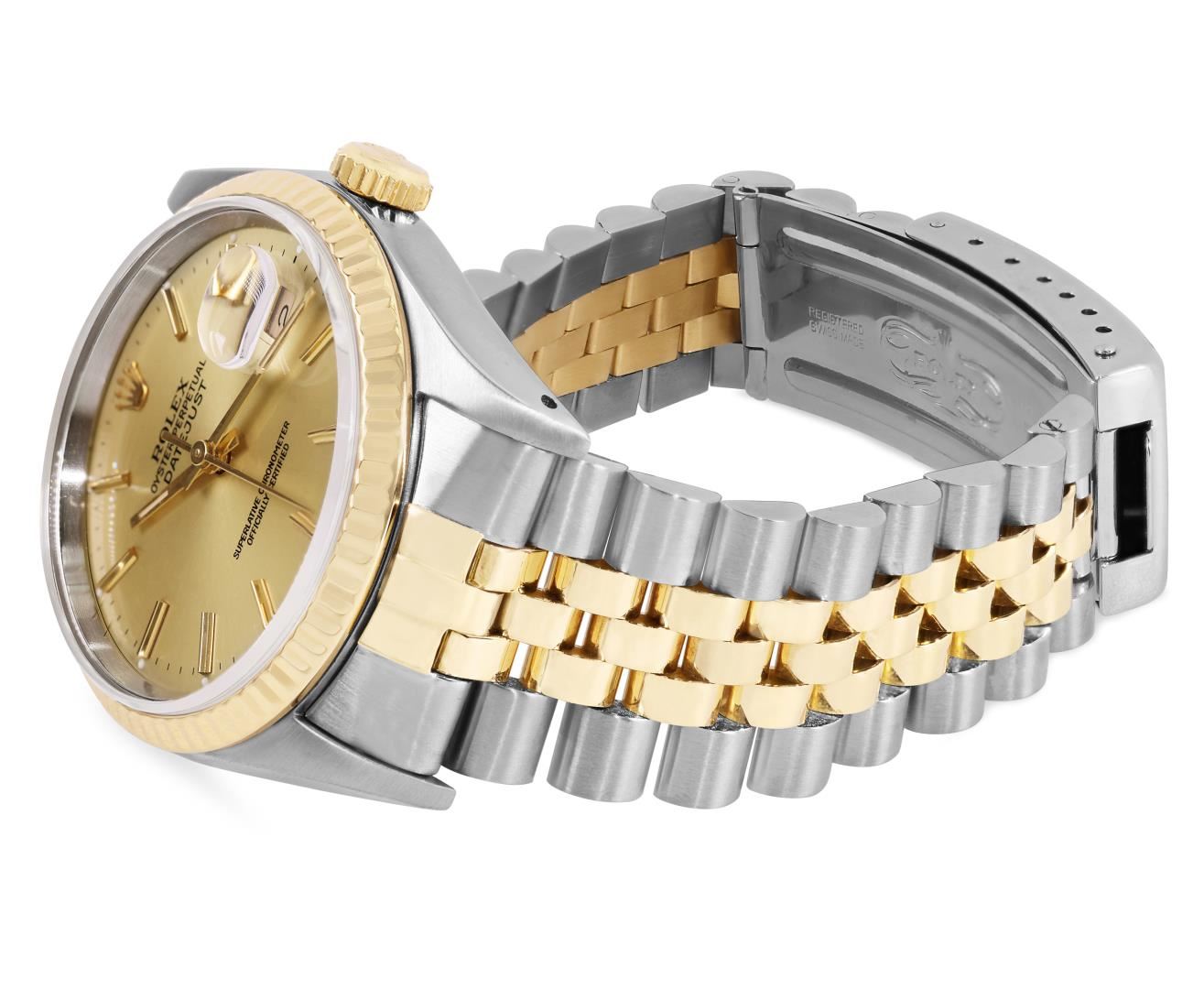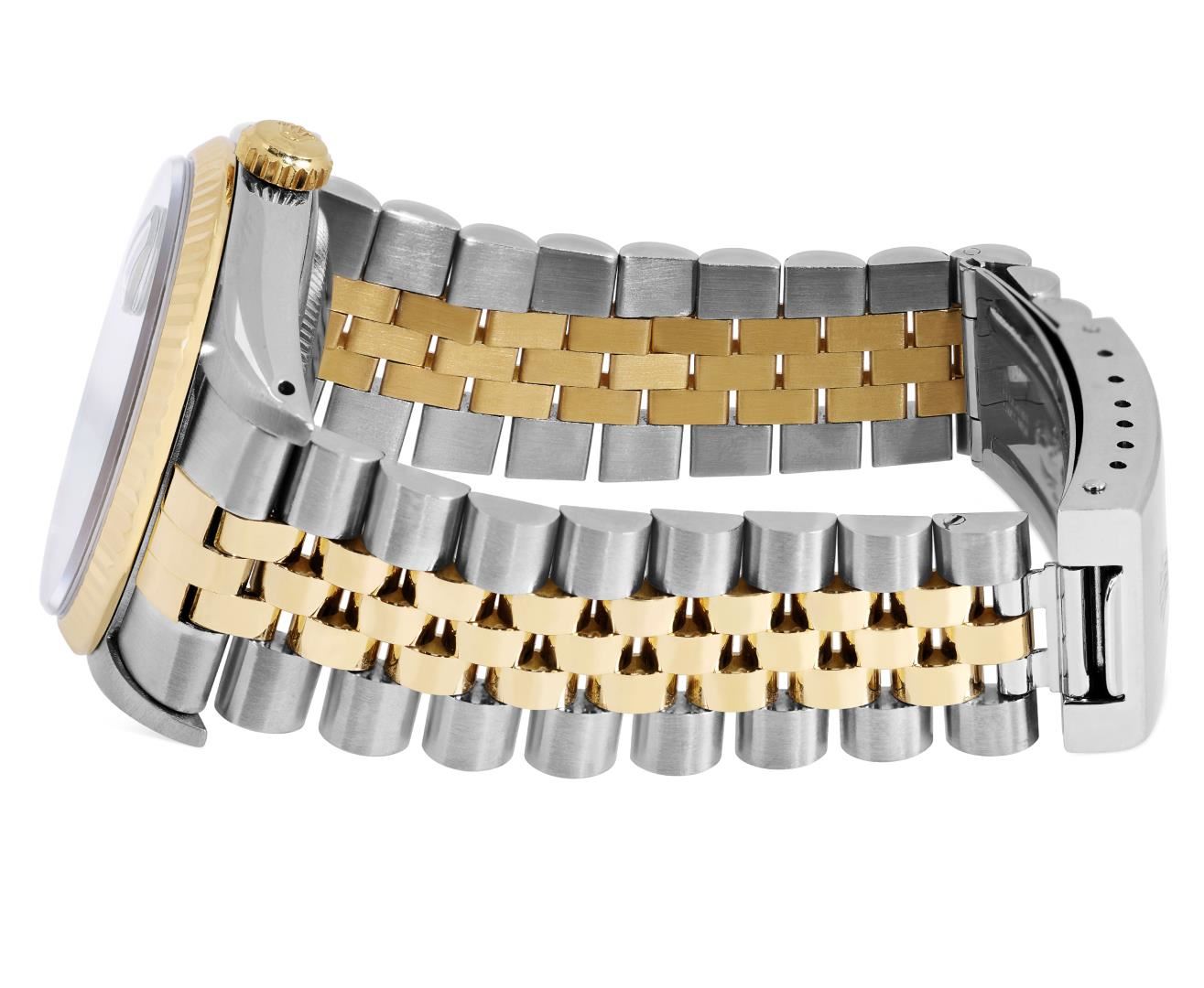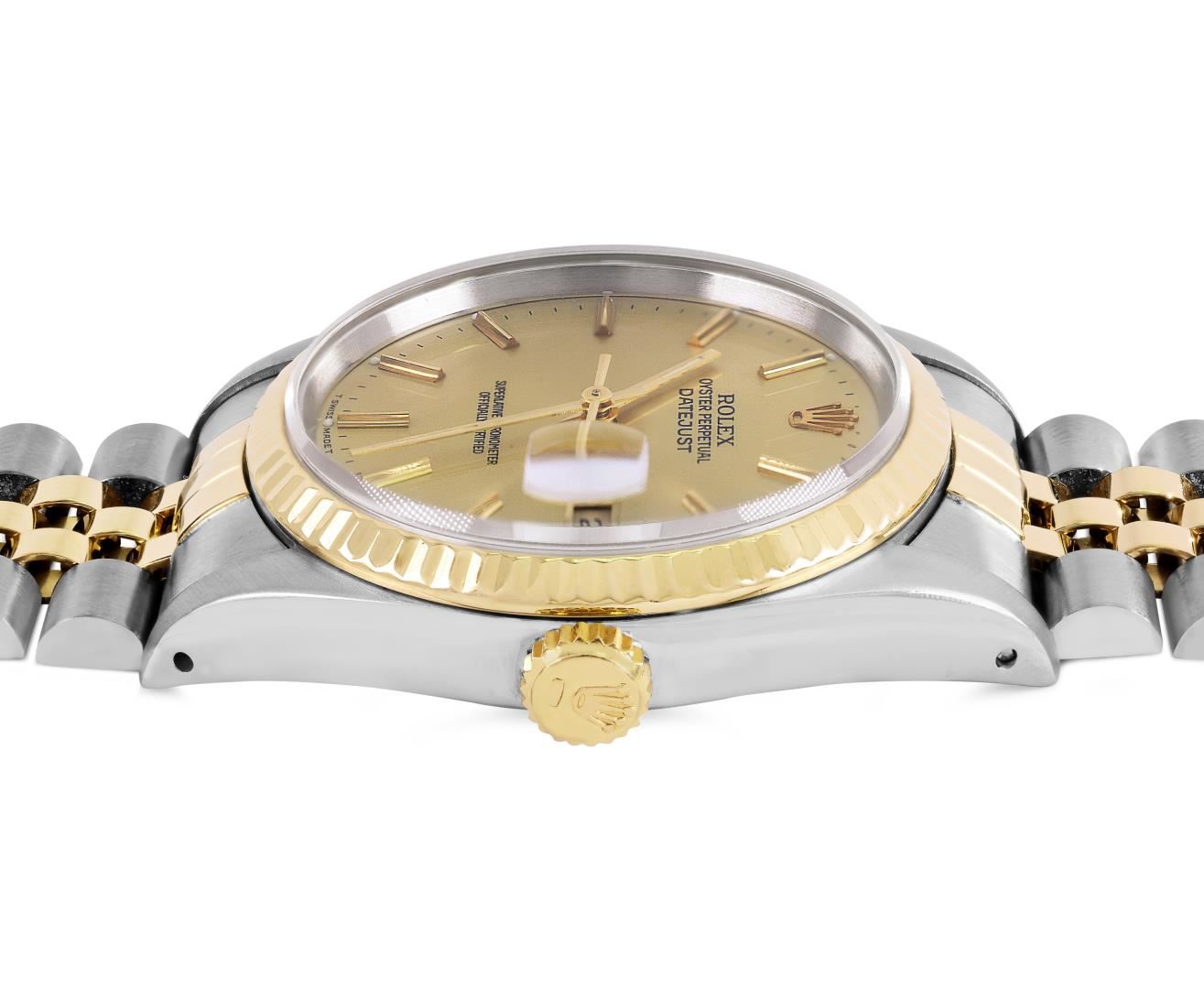 One Mens Pre Owned Yellow Gold Two Tone Rolex Datejust Polished, Serviced And Electronically Tested, Rolex Yellow Gold And Stainless Steel Case: 36mm, Rolex Yellow Gold Crown, Rolex Bezel: 18K Yellow Gold Fluted Bezel. Crystal: Sapphire With Magnified Date Window. Hands: Luminescent Hands. Rolex Movement: Automatic Winding Movement 3135. Rolex Dial: Champagne Dial With Index Hour Markers and Dash Track With Lumi Dots. Date Window: 3 O'Clock Position Date Display, Quickset, Model: Quickset Sapphire Datejust. Condition: G-6 Extra Fine. Rolex Bracelet: Two Tone Yellow Gold And Stainless Steel Jubilee Band. Bright Polish. 7.0 Inch Length, Adjustable. Standard Clasp, With Rolex Logo. This Watch Has Been Serviced Time Tested And Is In Excellent Condition It Is Free Of All Scratches And Dents. This Watch Comes With A Rolex Box.