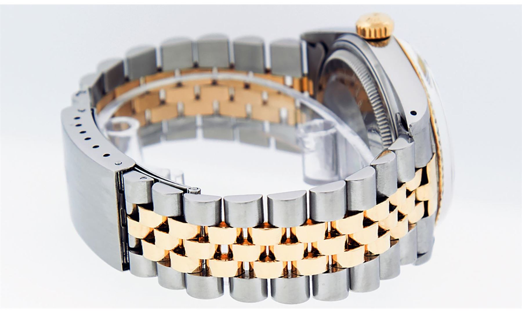 One Rolex Mens Pre Owned Yellow Gold And Stainless Steel Rolex Datejust Polished, Serviced & Electronically Tested, Yellow Gold & Stainless Steel Case: 36mm,14K Yellow Gold Crown, Bezel: 14K Yellow Gold Fluted Bezel. Custom Crystal: New Acrylic Cyclops Lens. Hands: Luminescent Hands. Rolex Movement: Automatic Winding Movement 3035. Rolex Dial: Champagne Dial With Index Hour Markers With Dash Track & Lumi Dots. Date Window: 3 O'Clock Position Date Display, Quickset, Model: Quickset Datejust. Condition: G-6 Extra Fine. Rolex Bracelet: 14K Two Tone Yellow Gold & Stainless Steel Jubilee Band. Bright Polish. 7.0 Inch Length, Adjustable. Standard Clasp, With Rolex Logo. This Watch Has Been Serviced Time Tested And Is In Excellent Condition It Is Free Of All Scratches And Dents.