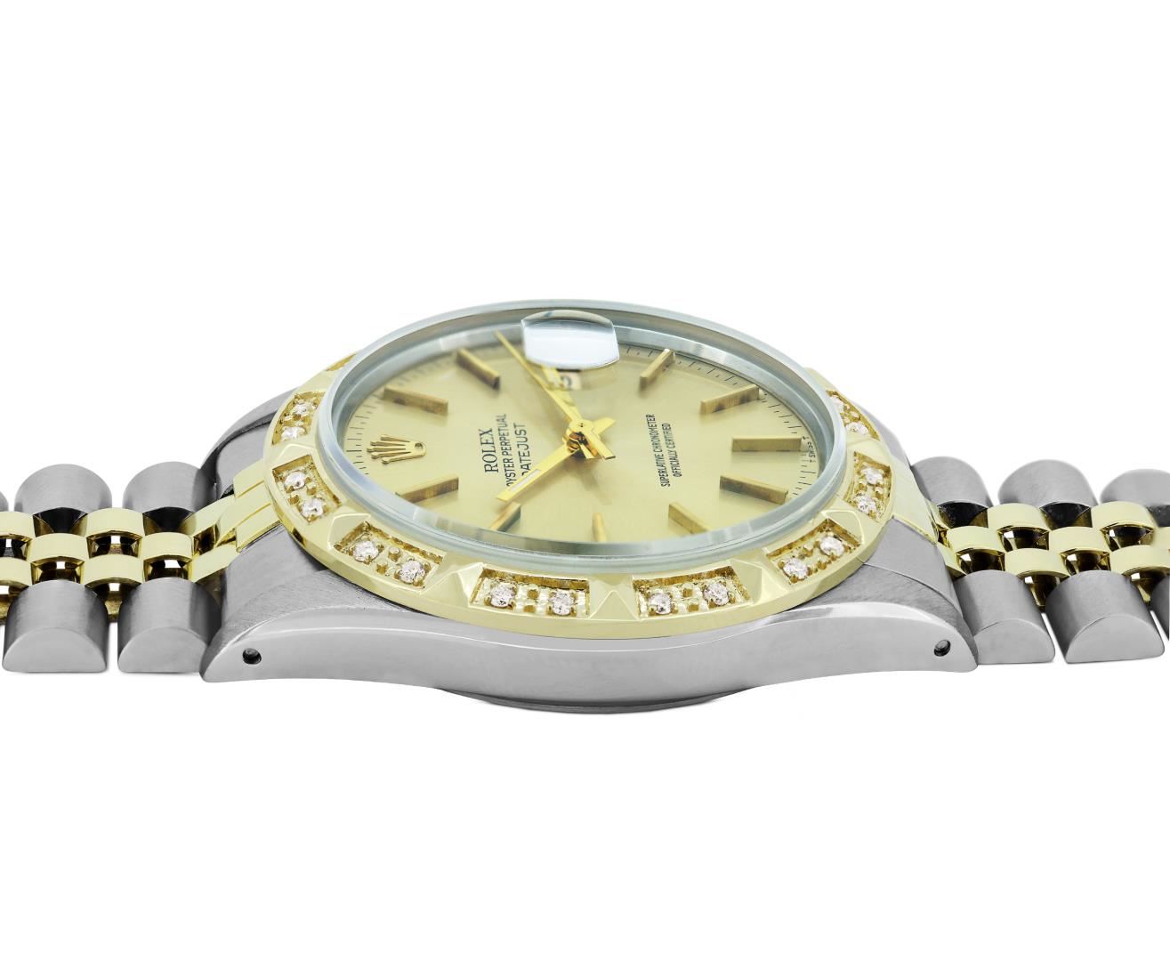 One Mens Pre Owned Yellow Gold And Steel Two Tone Rolex Datejust Polished, Serviced & Electronically Tested, Rolex Yellow Gold & Stainless Steel Case: 36mm, Rolex Yellow Gold Crown, Custom Bezel: New 18K Yellow Gold Pyramid Diamond Bezel, Diamond Count: 24 Diamonds On Dial, Total Weight .75 Carat, Clarity: SI-VS, Color: G to H. Custom Crystal: New Sapphire With Magnified Date Window. Custom Hands: New Luminescent Hands. Rolex Movement: Automatic Winding Movement 3035. Rolex Dial: Champagne Dial With Index Hour Markers and Small Track With Lumi Dots. Date Window: 3 O'Clock Position Date Display, Quickset, Model: Quickset Datejust. Condition: G-6 Extra Fine. Rolex Bracelet: Two Tone Yellow Gold & Stainless Steel Jubilee Band. Bright Polish. 7.0 Inch Length, Adjustable. Fold Clasp, With Rolex Logo. This Watch Has Been Serviced Time Tested And Is In Excellent Condition It Is Free Of All Scratches And Dents. This Watch Comes With A Rolex Box.