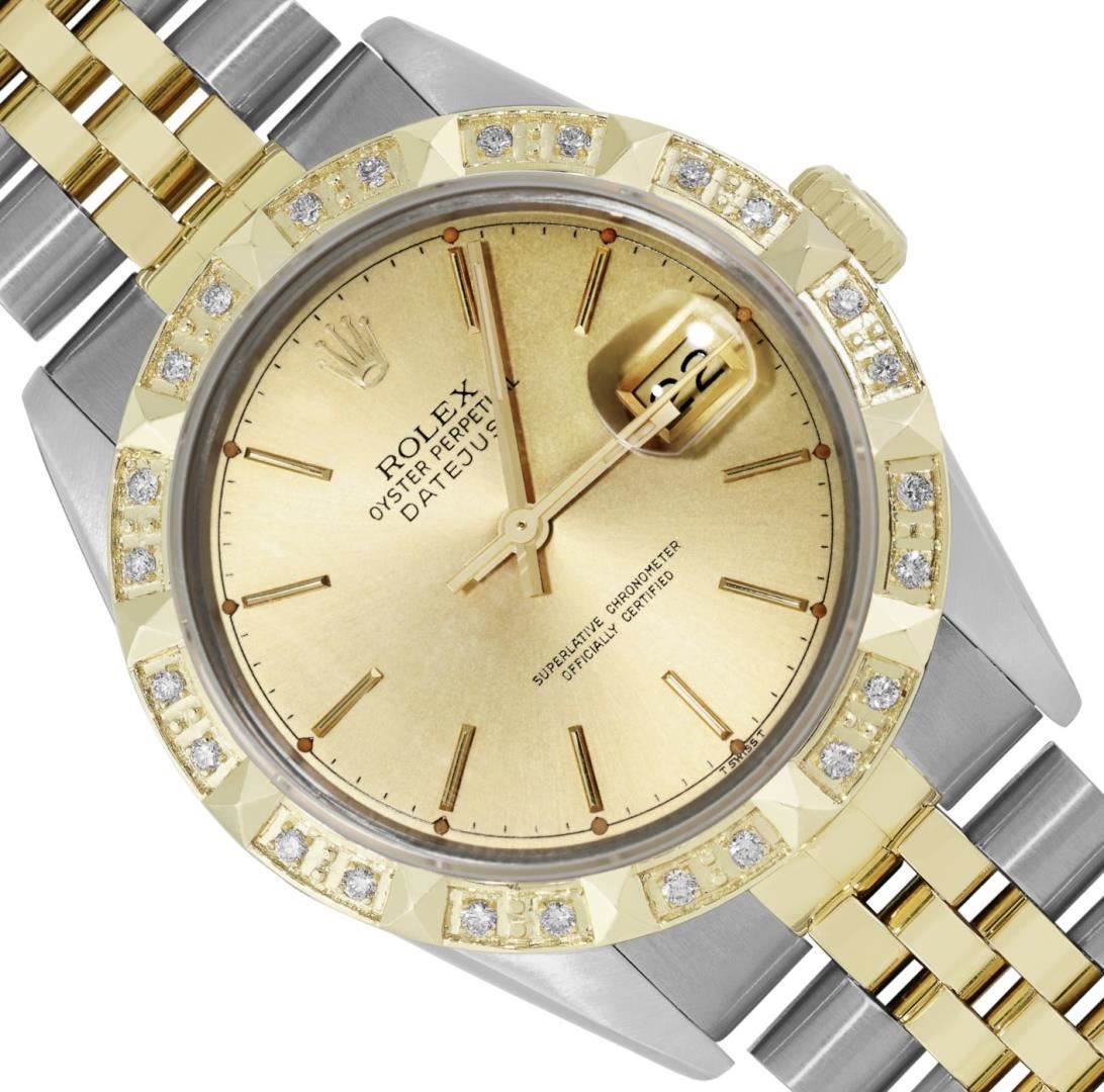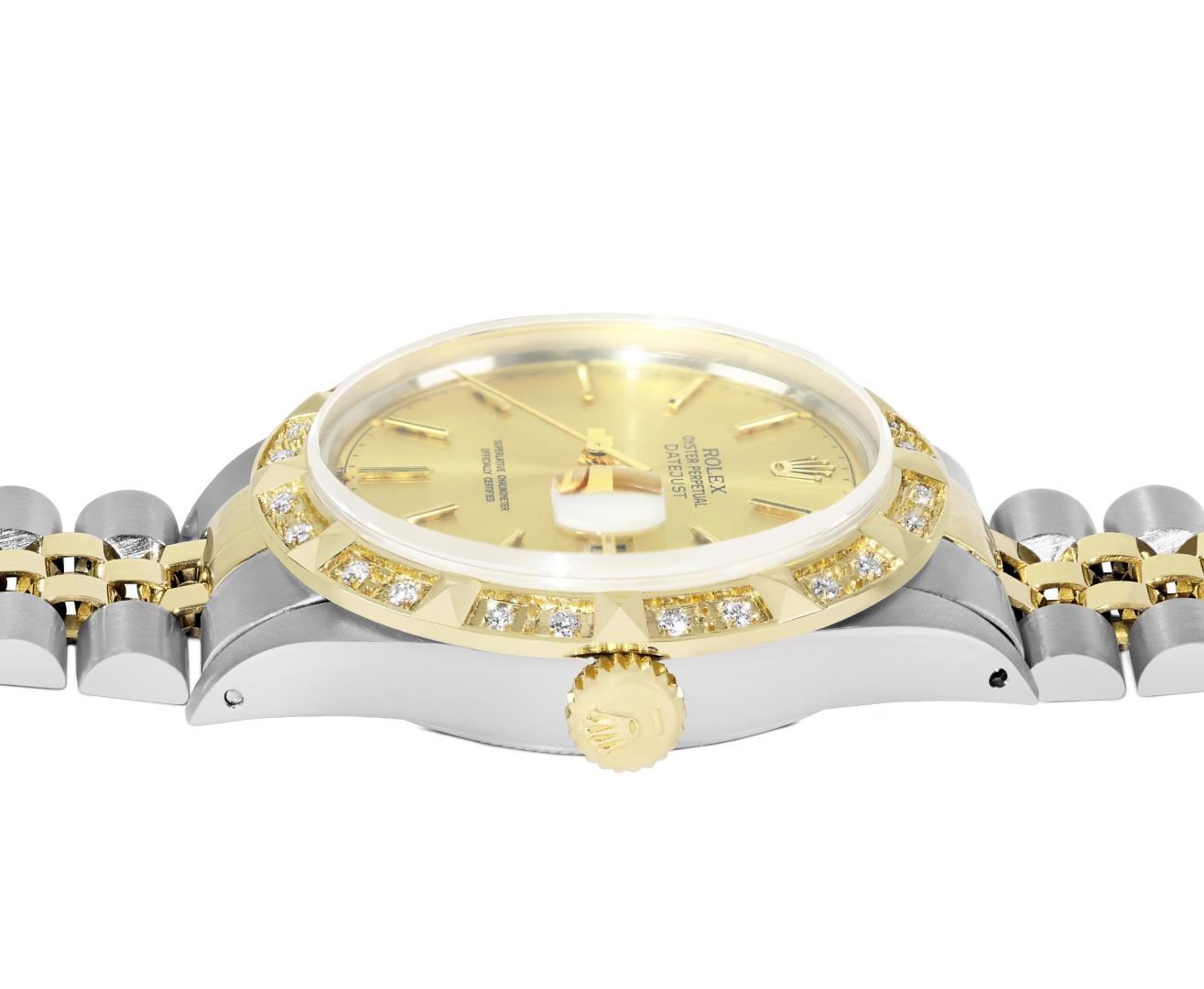 One Mens Pre Owned Yellow Gold Two Tone Rolex Datejust Polished, Serviced And Electronically Tested, Rolex Yellow Gold And Stainless Steel Case: 36mm, Rolex Yellow Gold Crown, Custom Bezel: New 18K Yellow Gold Pyramid Diamond Bezel, Diamond Count: 24 Diamonds. Custom Crystal: New Sapphire With Magnified Date Window. Custom Hands: New Luminecent Hands. Rolex Movement: Automatic Winding Movement 3035. Rolex Dial: Champagne Dial With Index Hour Markers and Small Track With Lumi Dots. Date Window: 3 O'Clock Position Date Display, Quickset, Model: Quickset Datejust. Condition: G-6 Extra Fine. Rolex Bracelet: Two Tone Yellow Gold And Stainless Steel Jubilee Band. Bright Polish. 7.0 Inch Length, Adjustable. Standard Clasp, With Rolex Logo. This Watch Has Been Serviced Time Tested And Is In Excellent Condition It Is Free Of All Scratches And Dents. This Watch Comes With A Rolex Box.