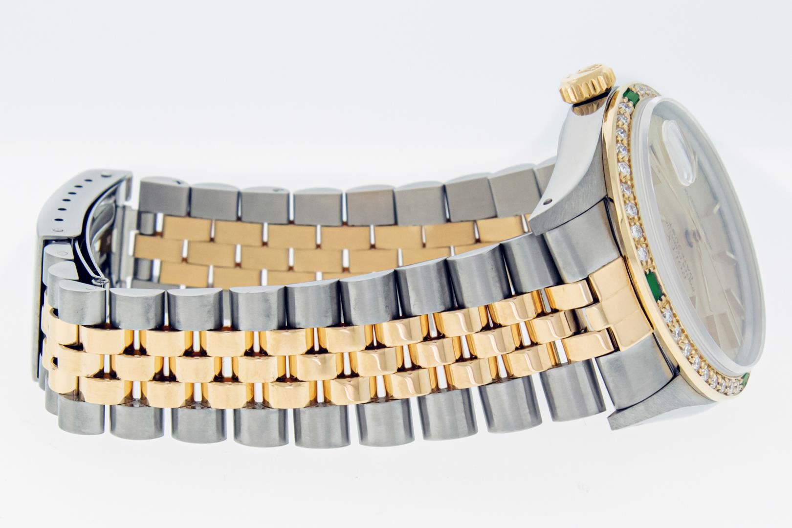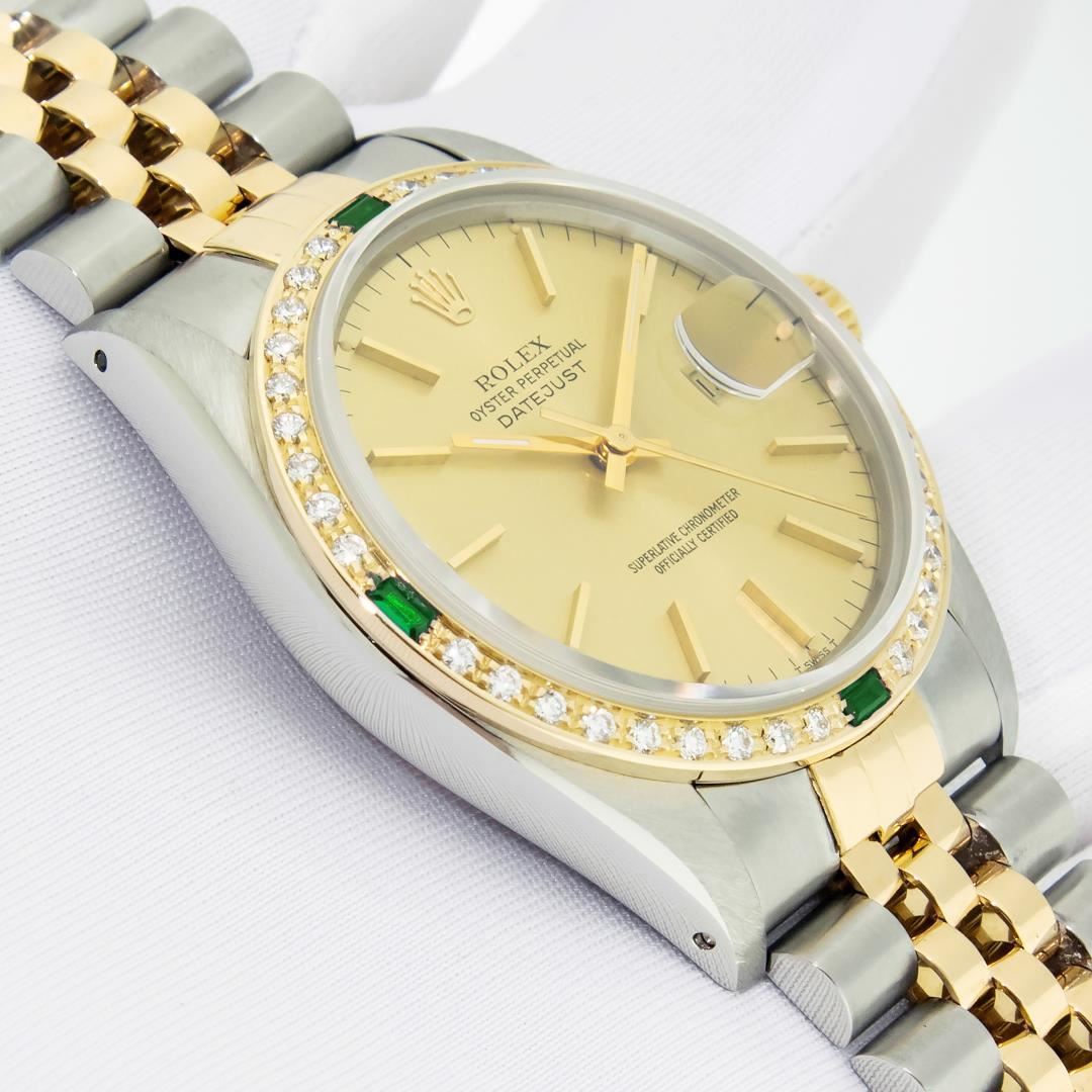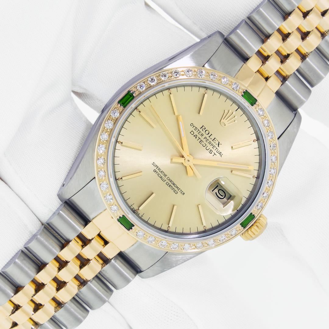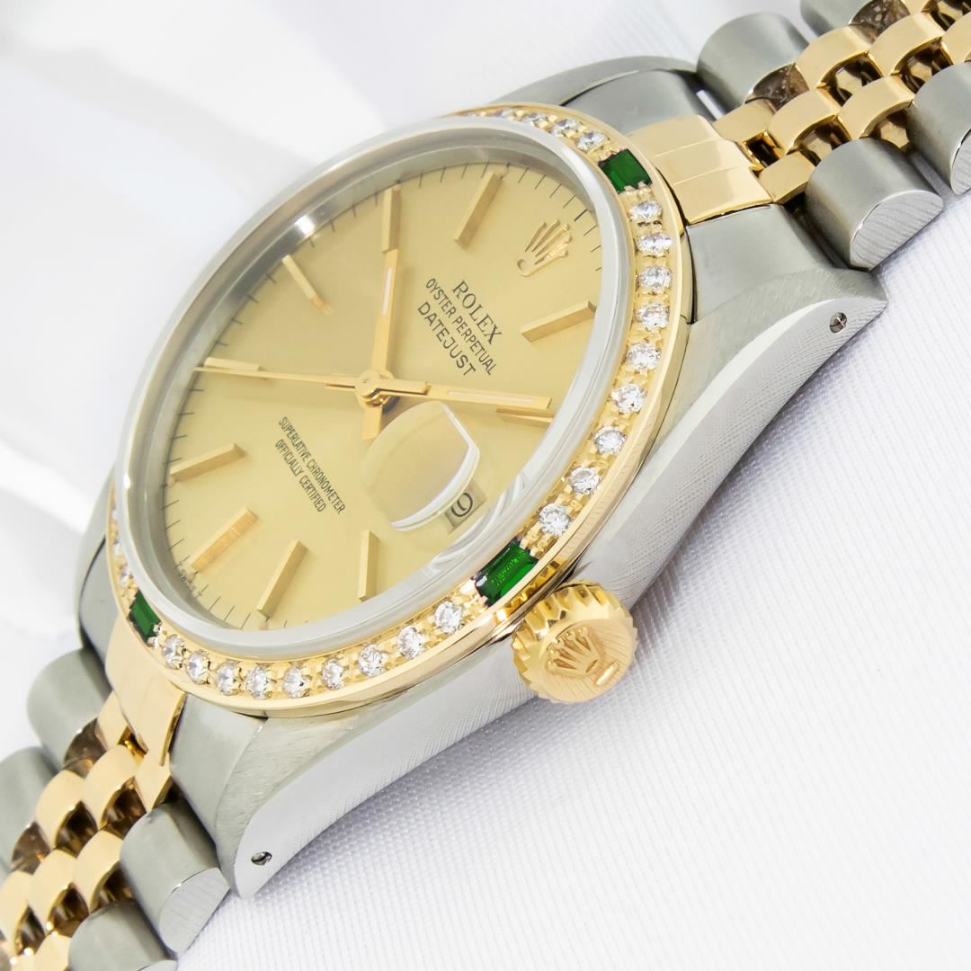 One Mens Pre Owned Two Tone Yellow Gold & Stainless Steel Rolex Datejust Polished, Serviced & Electronically Tested, Yellow Gold & Stainless Steel Case: 36mm, Rolex Yellow Gold Crown, Custom Bezel: New 18K Yellow Gold Emerald Beadset Diamond Bezel, Diamond Count: 36 Diamonds + 4 Emerald, Clarity: SI-VS, Color: G to H. Custom Crystal: New Sapphire With Magnified Date Window. Custom Hands: New Hands. Rolex Movement: Automatic Winding Movement. Rolex Factory Dial: Champagne With Index Hour Markers And Dash Track. Date Window: 3 O'Clock Position Date Display, Quickset, Model: Datejust. Condition: G-6 Extra Fine. Rolex Bracelet: Two Tone Yellow Gold & Stainless Steel Jubilee Band. Bright Polish. 7.0 Inch Length, Adjustable. Standard Clasp, With Rolex Logo. This Watch Has Been Serviced Time Tested And Is In Excellent Condition It Is Free Of All Scratches And Dents.