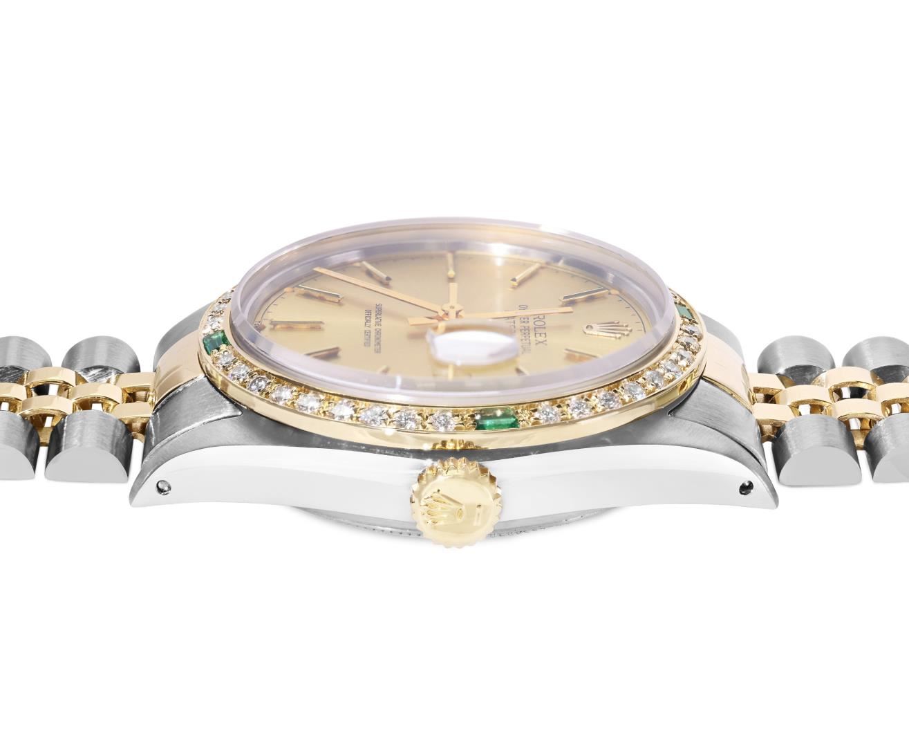 One Mens Pre Owned Two Tone Yellow Gold And Stainless Steel Rolex Datejust Polished, Serviced & Electronically Tested, Yellow Gold And Stainless Steel Case: 36mm, Rolex Yellow Gold Crown, Custom Bezel: New 18K Yellow Gold Emerald Beadset Diamond Bezel, Diamond Count: 36 Diamonds + 4 Sapphires, Clarity: SI-VS, Color: G to H. Custom Crystal: New Sapphire With Magnified Date Window. Custom Hands: New Hands. Rolex Movement: Automatic Winding Movement 3035. Rolex Factory Dial: Champagne Index With Dash Track And Lumi Dots. Date Window: 3 O'clock Position Date Display, Quickset, Model: Quickset Datejust. Condition: G-6 Extra Fine. Rolex Bracelet: Two Tone Yellow Gold And Stainless Steel Jubilee Band. Bright Polish. 7.0 Inch Length, Adjustable. Standard Clasp, With Rolex Logo. This Watch Has Been Serviced Time Tested And Is In Excellent Condition It Is Free Of All Scratches And Dents.