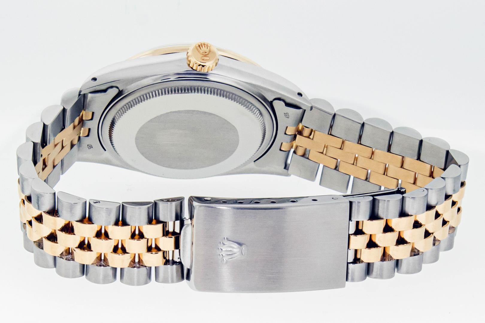 One Mens Pre Owned Two Tone Yellow Gold & Stainless Steel Rolex Datejust Polished, Serviced & Electronically Tested, Yellow Gold & Stainless Steel Case: 36mm, Rolex Yellow Gold Crown, Custom Bezel: New 18K Yellow Gold Ruby Beadset Diamond Bezel, Diamond Count: 36 Diamonds + 4 Rubies, Clarity: SI-VS, Color: G to H. Custom Crystal: New Sapphire With Magnified Date Window. Custom Hands: New Hands. Rolex Movement: Automatic Winding Movement. Rolex Factory Dial: Champagne With Index Hour Markers And Dash Track. Date Window: 3 O'Clock Position Date Display, Quickset, Model: Datejust. Condition: G-6 Extra Fine. Rolex Bracelet: Two Tone Yellow Gold & Stainless Steel Jubilee Band. Bright Polish. 7.0 Inch Length, Adjustable. Standard Clasp, With Rolex Logo. This Watch Has Been Serviced Time Tested And Is In Excellent Condition It Is Free Of All Scratches And Dents.
