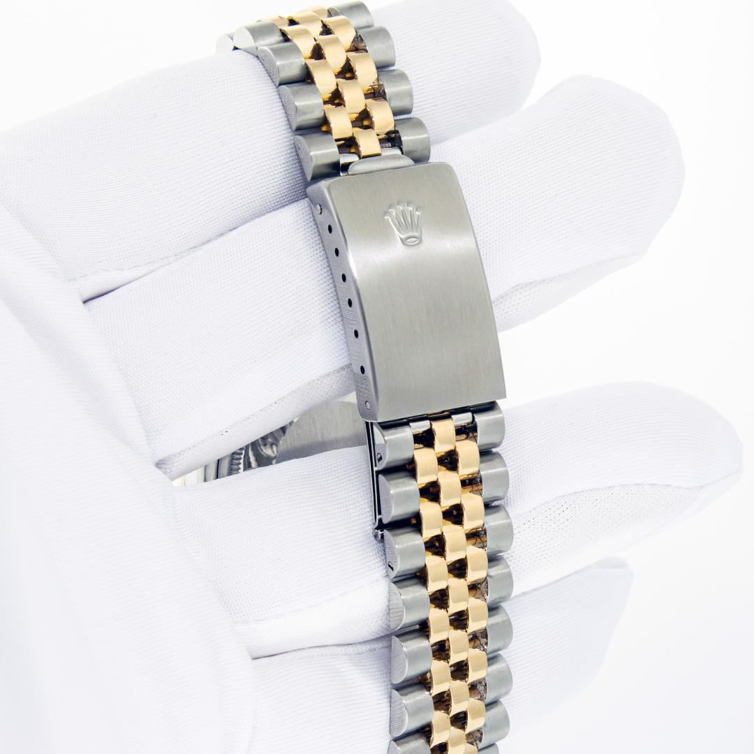 One Mens Pre Owned Two Tone Yellow Gold & Stainless Steel Rolex Datejust Polished, Serviced & Electronically Tested, Yellow Gold & Stainless Steel Case: 36mm, Rolex Yellow Gold Crown, Custom Bezel: New 18K Yellow Gold Sapphire Beadset Diamond Bezel, Diamond Count: 36 Diamonds + 4 Sapphires, Clarity: SI-VS, Color: G to H. Custom Crystal: New Sapphire With Magnified Date Window. Custom Hands: New Hands. Rolex Movement: Automatic Winding Movement. Rolex Factory Dial: Champagne With Index Hour Markers And Dash Track. Date Window: 3 O'Clock Position Date Display, Quickset, Model: Datejust. Condition: G-6 Extra Fine. Rolex Bracelet: Two Tone Yellow Gold & Stainless Steel Jubilee Band. Bright Polish. 7.0 Inch Length, Adjustable. Standard Clasp, With Rolex Logo. This Watch Has Been Serviced Time Tested And Is In Excellent Condition It Is Free Of All Scratches And Dents.