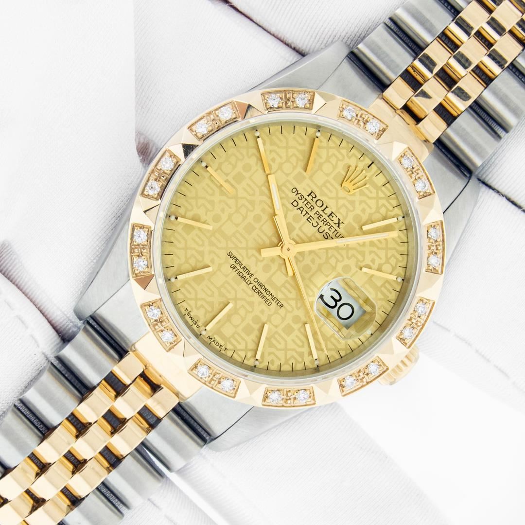 One Mens Pre Owned Yellow Gold Two Tone Rolex Datejust Polished, Serviced & Electronically Tested, Rolex Yellow Gold & Stainless Steel Case: 36mm, Rolex 14K Yellow Gold Crown, Custom Bezel: New 18K Yellow Gold Pyramid Diamond Bezel, Diamond Count: 24 Diamonds, Total Weight .75 Carat, Clarity: SI-VS, Color: G to H. Custom Crystal: New Sapphire With Magnified Date Window. Custom Hands: New Luminecent Hands. Rolex Movement: Automatic Winding Movement. Rolex Dial: Champagne Jubilee Dial With Index Hour Markers and Small Track With Lumi Dots. Date Window: 3 O'Clock Position Date Display, Quickset, Model: Datejust. Condition: G-6 Extra Fine. Rolex Bracelet: Two Tone Yellow Gold & Stainless Steel Jubilee Band. Bright Polish. 7.0 Inch Length, Adjustable. Standard Clasp, With Rolex Logo. This Watch Has Been Serviced Time Tested And Is In Excellent Condition It Is Free Of All Scratches And Dents. This Watch Comes With A Rolex Box.