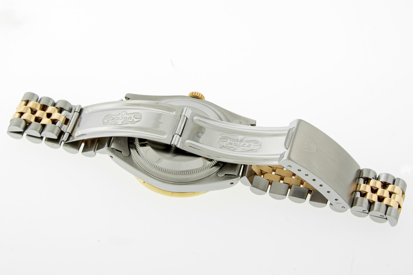 One Mens Pre Owned Yellow Gold Two Tone Rolex Datejust Polished, Serviced & Electronically Tested, Rolex Yellow Gold & Stainless Steel Case: 36mm, Rolex 14K Yellow Gold Crown, Custom Bezel: New 18K Yellow Gold Pyramid Diamond Bezel, Diamond Count On Bezel: 24 Diamonds, Total Weight .75 Carat, Clarity: SI-VS, Color: G to H. Custom Crystal: New Sapphire With Magnified Date Window. Custom Hands: New Luminecent Hands. Rolex Movement: Automatic Winding Movement. Rolex Dial: Champagne Jubilee Dial With Index Hour Markers and Small Track With Lumi Dots. Date Window: 3 O'Clock Position Date Display, Quickset, Model: Datejust. Condition: G-6 Extra Fine. Rolex Bracelet: Two Tone Yellow Gold & Stainless Steel Jubilee Band. Bright Polish. 7.0 Inch Length, Adjustable. Standard Clasp, With Rolex Logo. This Pre Owned Watch Has Been Serviced Time Tested And Is In Excellent Condition It Is Free Of All Scratches And Dents. This Watch Comes With A Rolex Box and Booklets.