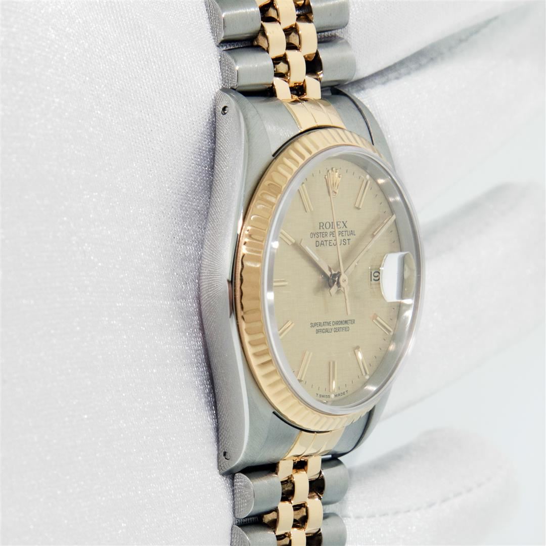 One Mens Yellow Gold Two Tone Rolex Datejust Polished, Serviced & Electronically Tested, Yellow Gold & Stainless Steel Case: 36mm, 14K Yellow Gold Crown, Bezel: Yellow Gold Fluted Bezel. Custom Crystal: New Acrylic Cyclops Lens. Custom Hands: New Luminecent Hands. Movement: Automatic Winding Movement. Dial: Champagne Linen Dial With Index Hour Markers and Small Track With Lumi Dots. Date Window: 3 O'Clock Position Date Display, Quickset, Model: Datejust. Condition: G-6 Extra Fine. Bracelet: Two Tone Yellow Gold & Stainless Steel Jubilee Band. Bright Polish. 7.0 Inch Length, Adjustable. Standard Clasp, With Rolex Logo. This Watch Has Been Serviced Time Tested And Is In Excellent Condition It Is Free Of All Scratches And Dents.