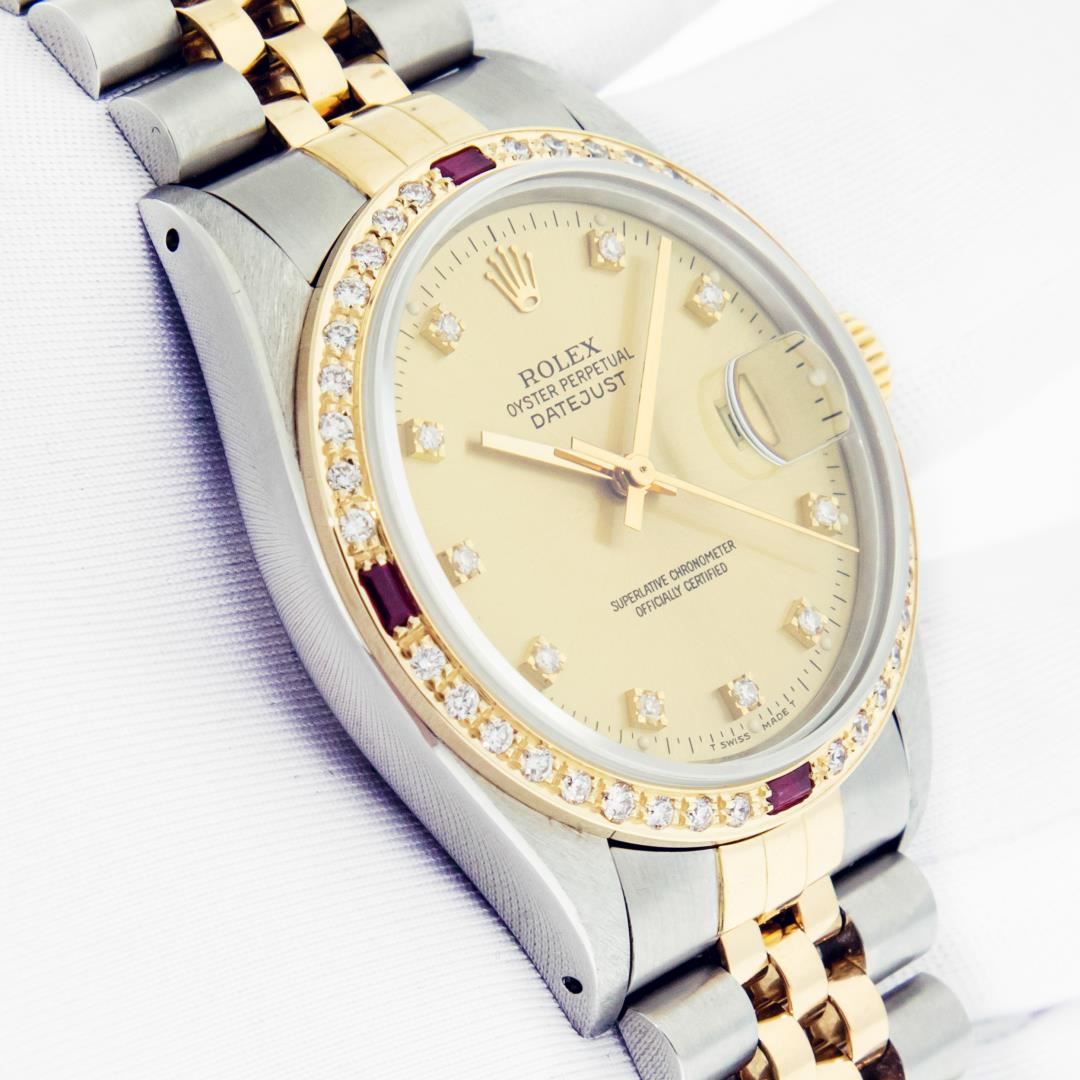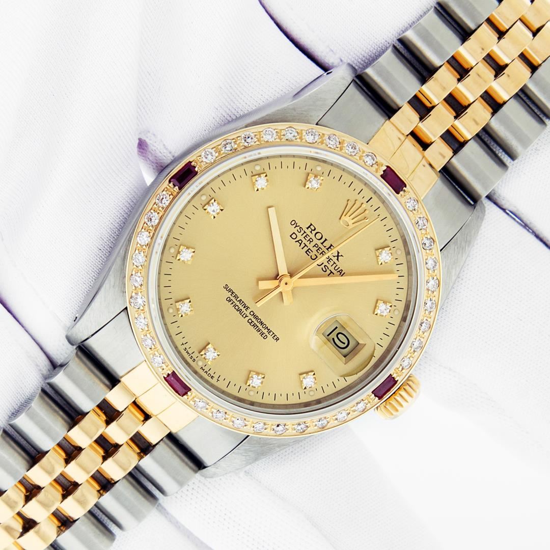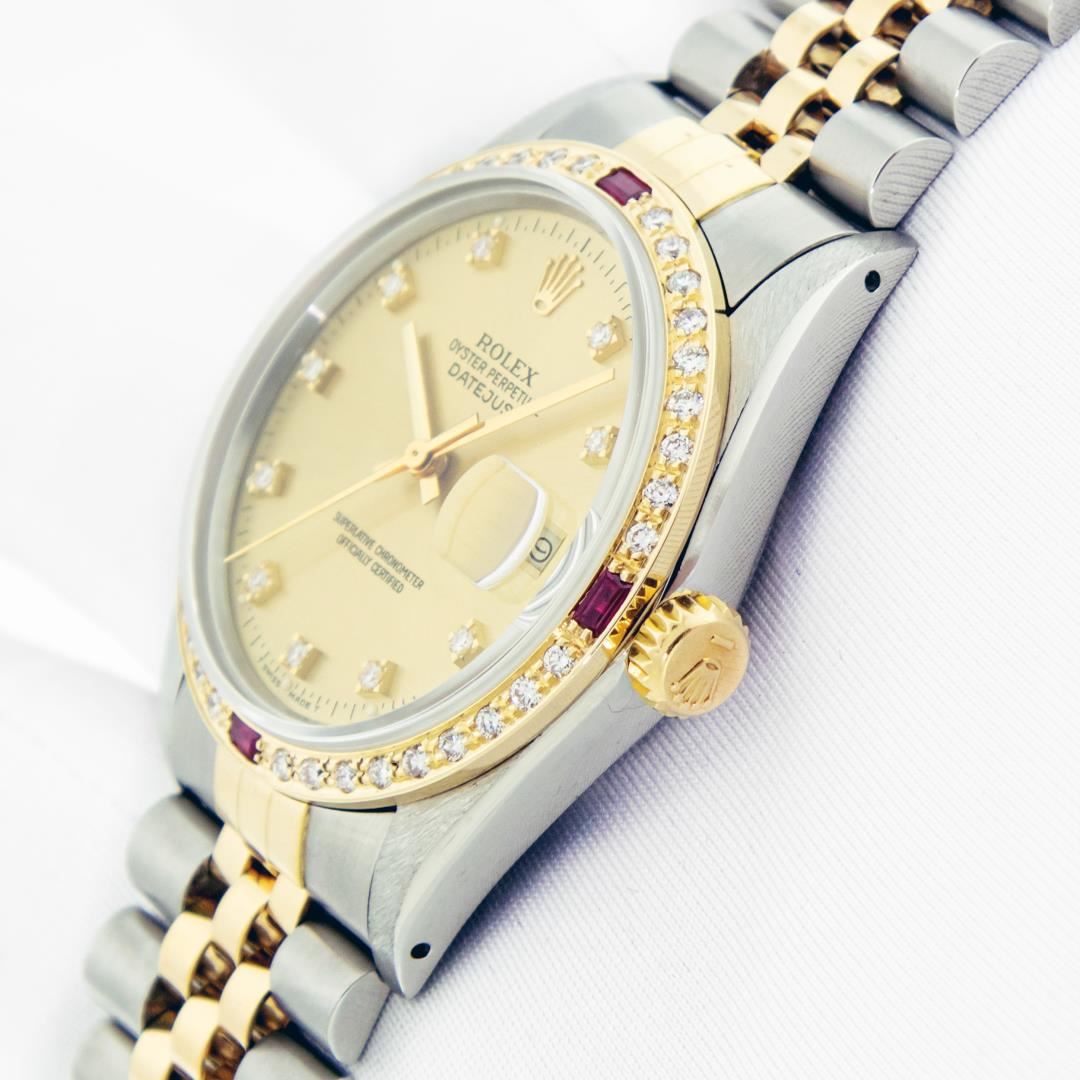 One Mens Pre Owned Yellow Gold Two Tone Rolex Datejust Polished, Serviced & Electronically Tested, Yellow Gold & Stainless Steel Case: 36mm, Rolex Yellow Gold Crown, Custom Bezel: New 18K Yellow Gold Ruby Beadset Diamond Bezel, Diamond Count: 36 Diamonds + 4 Rubies. Custom Crystal: New Sapphire With Magnified Date Window. Custom Hands: New Hands. Rolex Movement: Automatic Winding Movement. Rolex Factory Dial: Champagne Dial With Diamond Hour Markers. Diamond Count: 10 Diamonds In Dial. Date Window: 3 O'Clock Position Date Display, Quickset, Model: Datejust. Condition: G-6 Extra Fine. Rolex Bracelet: Two Tone Yellow Gold & Stainless Steel Jubilee Band. Bright Polish. 7.0 Inch Length, Adjustable. Standard Clasp, With Rolex Logo. This Pre Owned Watch Has Been Serviced Time Tested And Is In Excellent Condition It Is Free Of All Scratches And Dents.