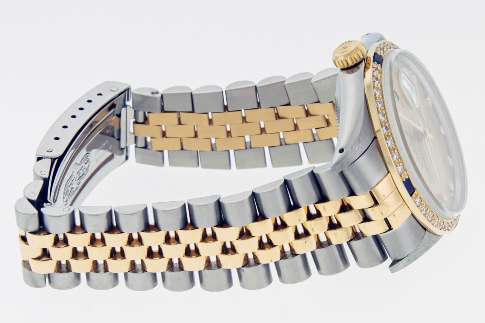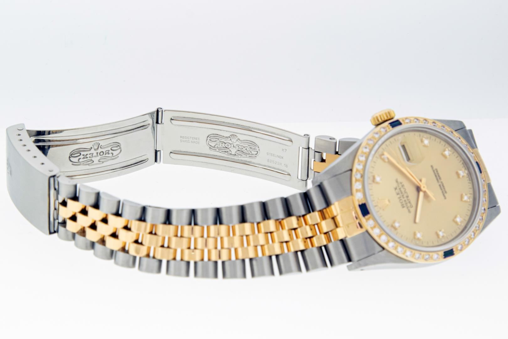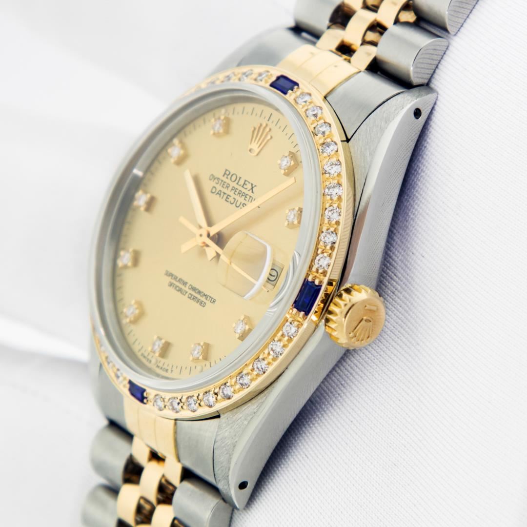 One Mens Pre owned Two Tone Yellow Gold & Stainless Steel Rolex Datejust Polished, Serviced & Electronically Tested, Yellow Gold & Stainless Steel Case: 36mm, Rolex Yellow Gold Crown, Custom Bezel: New 18K Yellow Gold Sapphire Beadset Diamond Bezel, Diamond Count: 36 Diamonds + 4 Sapphires, Clarity: SI-VS, Color: G to H. Custom Crystal: New Sapphire With Magnified Date Window. Custom Hands: New Hands. Rolex Movement: Automatic Winding Movement. Rolex Factory Dial: Champagne Dial With Diamond Hour Markers. Diamond Count: 10 Diamonds In Dial. Date Window: 3 O'Clock Position Date Display, Quickset, Model: Datejust. Condition: G-6 Extra Fine. Rolex Bracelet: Two Tone Yellow Gold & Stainless Steel Jubilee Band. Bright Polish. 7.0 Inch Length, Adjustable. Standard Clasp, With Rolex Logo. This Pre Owned Watch Has Been Serviced Time Tested And Is In Excellent Condition It Is Free Of All Scratches And Dents.