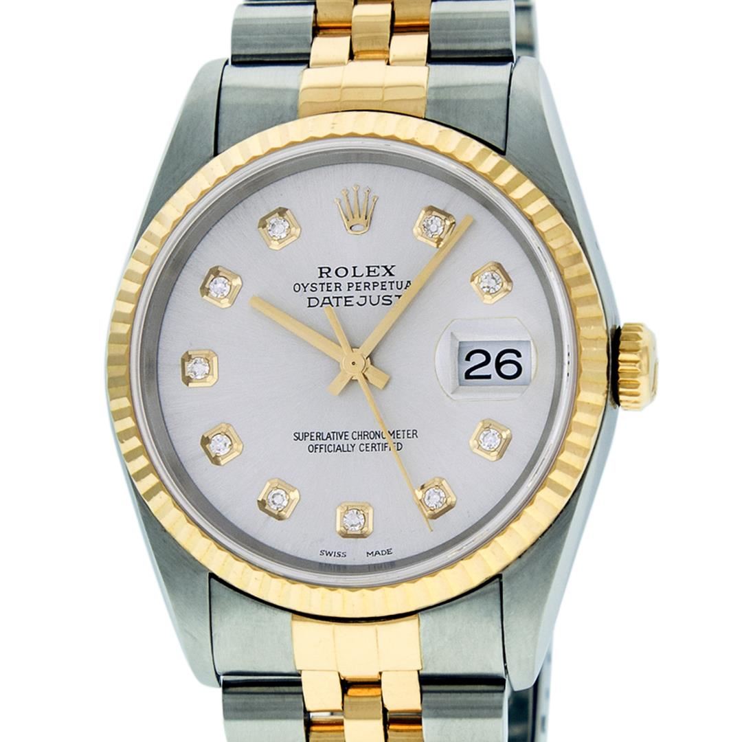 One Mens Pre Owned Yellow Gold And Steel Two Tone Rolex Datejust Polished, Serviced & Electronically Tested, Rolex Yellow Gold & Stainless Steel Case: 36mm, Rolex Yellow Gold Crown, Bezel: Yellow Gold Fluted Bezel. Custom Crystal: New Acrylic With Magnified Date Window. Custom Hands: New Luminescent Hands. Rolex Movement: Automatic Winding Movement 3035. Custom Dial: Custom Silver Dial With Added Diamond Hour Markers, Diamond Count: 10 Diamonds in Dial. Date Window: 3 O'Clock Position Date Display, Quickset, Model: Datejust, Condition: G-6 Extra Fine. Rolex Bracelet: Two Tone Yellow Gold And Stainless Steel Jubilee Band. Bright Polish. 7.0 Inch Length, Adjustable. Standard Clasp, With Rolex Logo. This Watch Has Been Serviced And Polished It Is Free Of All Scratches And Dents.