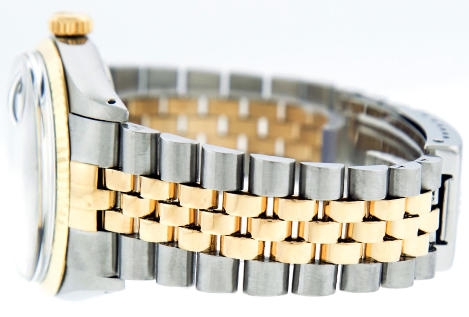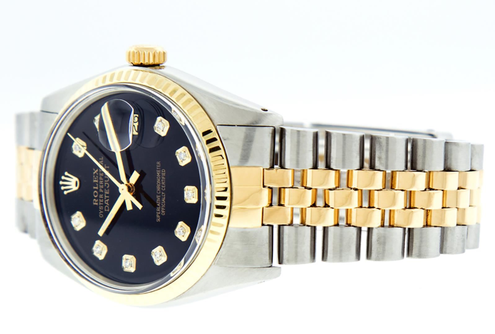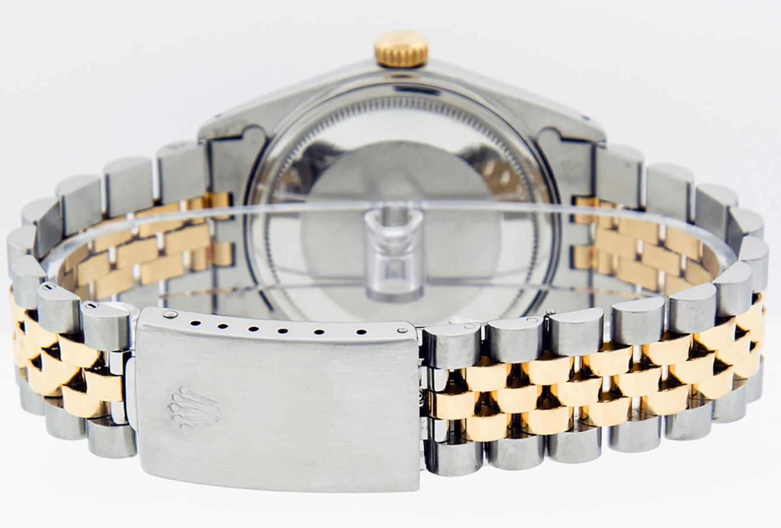 One Mens Pre Owned Rolex Two Tone Yellow Gold And Stainless Steel Datejust Polished, Serviced & Electronically Tested, Rolex Yellow Gold & Stainless Steel Case: 36mm, Rolex Yellow Gold Crown, Rolex Bezel: Yellow Gold Fluted Bezel. Custom Crystal: New Acrylic With Magnified Date Window. Custom Hands: New Luminescent Hands. Rolex Movement: Automatic Winding Movement. Custom Dial: Custom Black Dial With Added Diamond Hour Markers, Diamond Count: 10 Diamonds In Dial. Date Window: 3 O'Clock Position Date Display, Quickset, Model: Condition: G-6 Extra Fine. Rolex Bracelet: Two Tone Yellow Gold & Stainless Steel Jubilee Band. Bright Polish. 7.0 Inch Length, Adjustable. Standard Clasp, With Rolex Logo. This Watch Has Been Serviced Time Tested And Is In Excellent Condition It Is Free Of All Scratches And Dents.