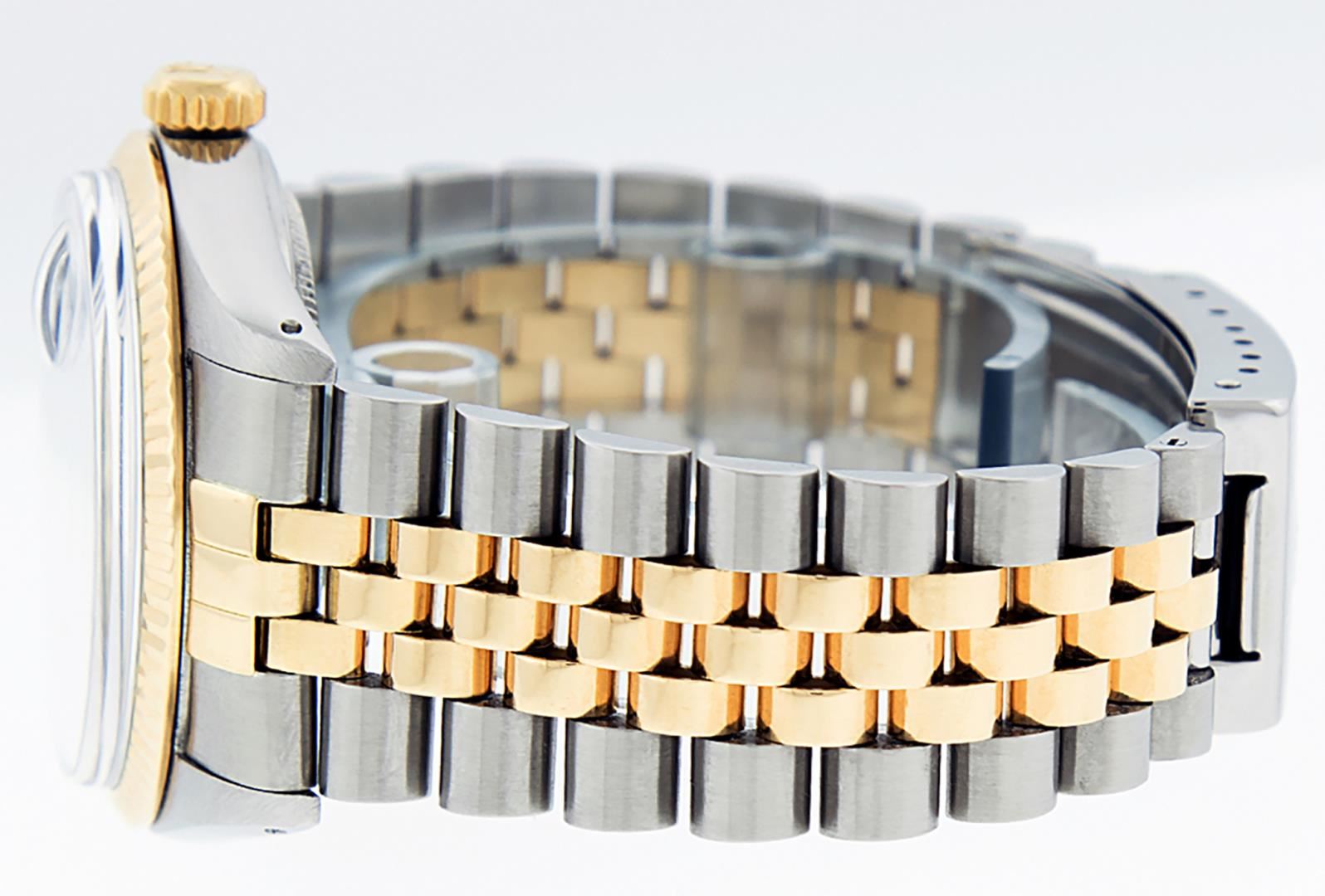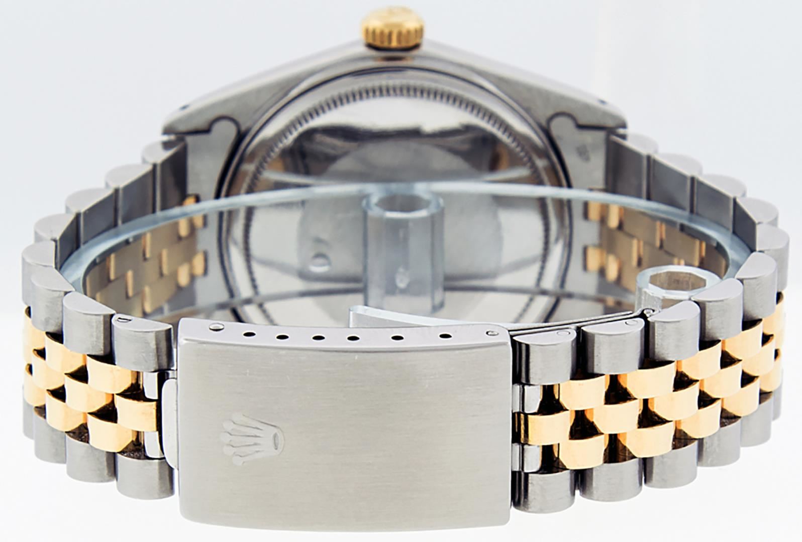 One Mens Pre Owned Two Tone Yellow Gold And Stainless Steel Rolex Datejust Polished, Serviced And Electronically Tested, Rolex Yellow Gold And Stainless Steel Case: 36mm, Rolex Yellow Gold Crown, Rolex Bezel: Yellow Gold Fluted Bezel. Custom Crystal: New Acrylic With Magnified Date Window. Custom Hands: New Luminecent Hands. Rolex Movement: Automatic Winding Movement 3035. Custom Dial: Custom Blue Dial With Added Genuine Diamond Hour Markers And Square Roman Track, Diamond Count: 10 Diamonds On Dial. Date Window: 3 O'Clock Position Date Display, Quickset, Model: Datejust, Condition: G-6 Extra Fine. Rolex Bracelet: Two Tone Yellow Gold And Stainless Steel Jubilee Band. Bright Polish. 7.0 Inch Length, Adjustable. Standard Clasp, With Rolex Logo. This Watch Has Been Serviced And Polished It Is Free Of All Scratches And Dents.