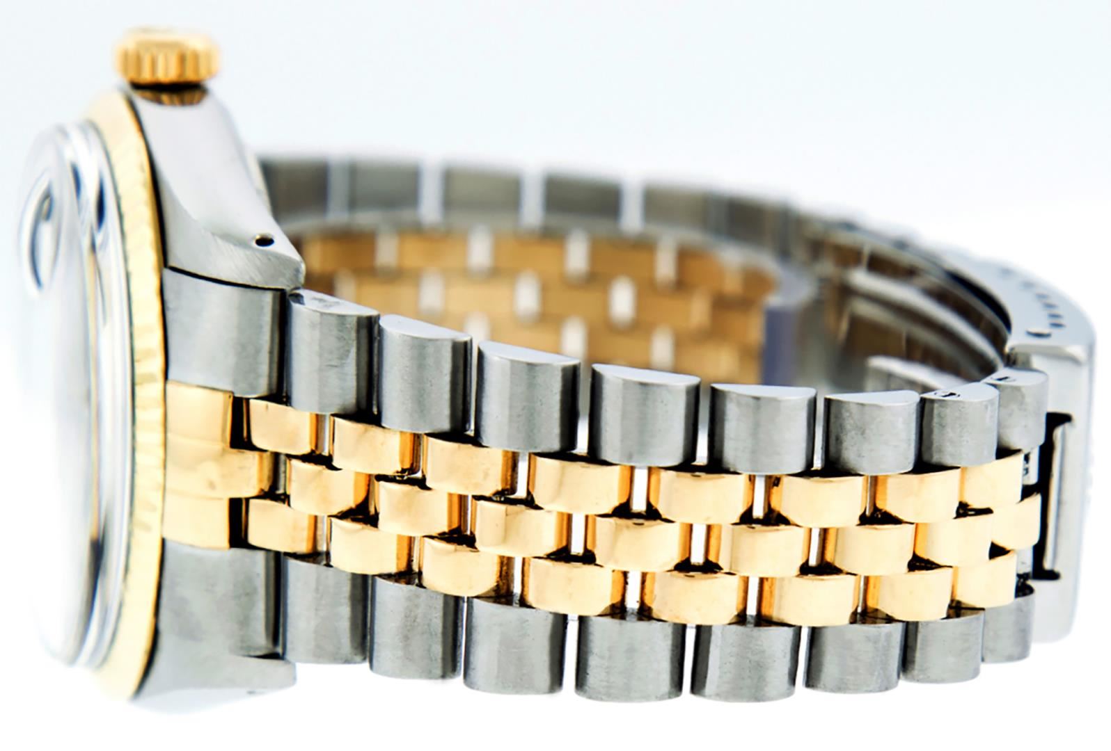 One Mens Pre Owned Rolex Yellow Gold And Stainless Steel Two Tone Rolex Datejust Polished, Serviced & Electronically Tested, Rolex Yellow Gold & Rolex Stainless Steel Case: 36mm, Rolex Yellow Gold Crown, Rolex Bezel: 18K Yellow Gold Fluted Bezel. Custom Crystal: New Acrylic With Magnified Date Window. Custom Hands: New Luminescent Hands. Movement: Rolex Automatic Winding Movement 3035. Custom Dial: Custom Black Dial With Added Diamond Hour Markers And Square Roman Track, Diamond Count: 10 Diamonds in Dial. Date Window: 3 O'Clock Position Date Display, Quickset, Model: Condition: G-6 Extra Fine. Rolex Bracelet: Two Tone Yellow Gold & Stainless Steel Jubilee Band. Bright Polish. 7.0 Inch Length, Adjustable. Standard Clasp, With Rolex Logo. This Watch Has Been Serviced And Polished It Is Free Of All Scratches And Dents.