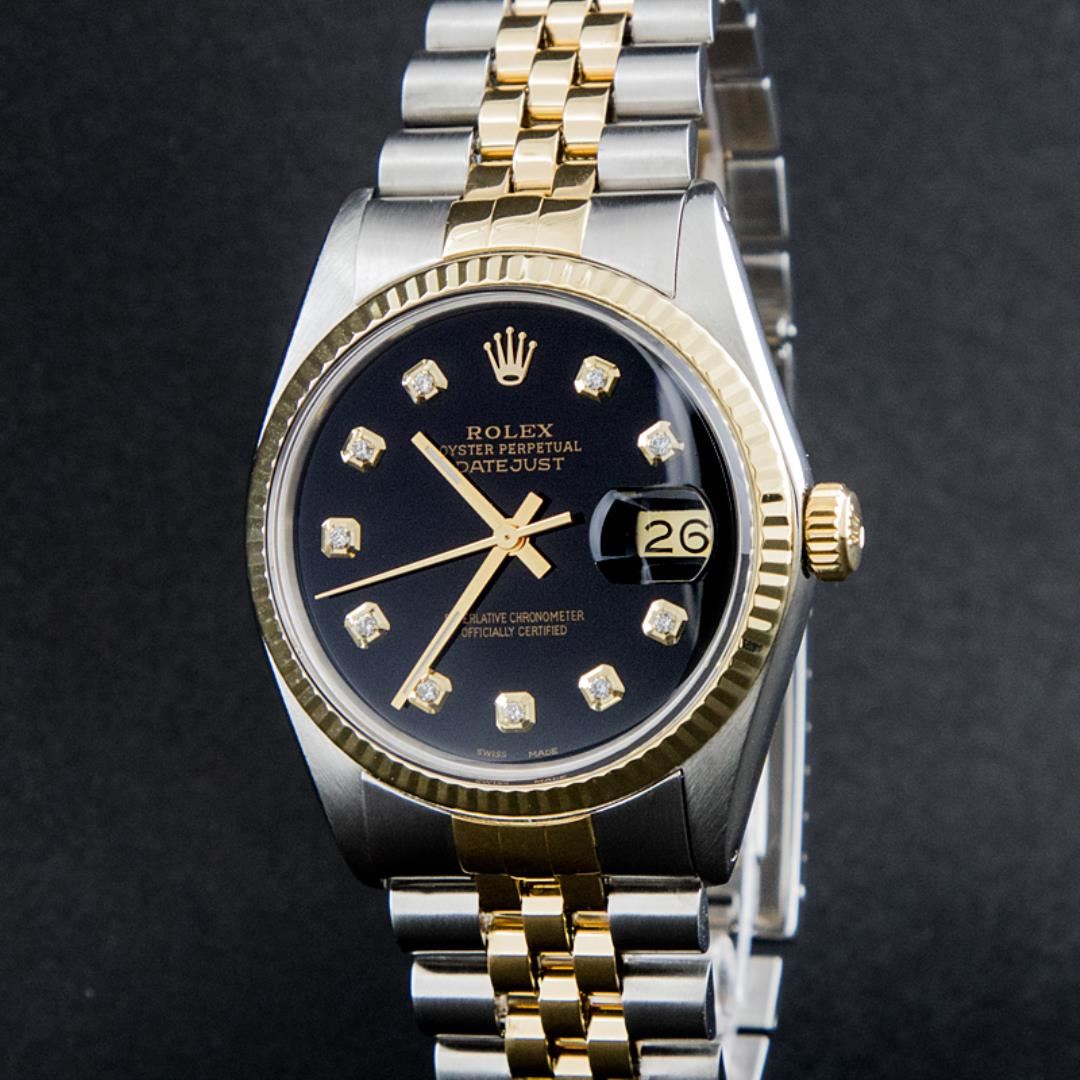One Mens Pre Owned Rolex Two Tone Yellow Gold And Stainless Steel Datejust Polished, Serviced & Electronically Tested, Rolex Yellow Gold & Stainless Steel Case: 36mm, Rolex Yellow Gold Crown, Rolex Bezel: Yellow Gold Fluted Bezel. Custom Crystal: New Acrylic With Magnified Date Window. Custom Hands: New Luminecent Hands. Rolex Movement: Automatic Winding Movement. Custom Dial: Custom Black Dial With Added Diamond Hour Markers, Diamond Count: 10 Diamonds In Dial. Date Window: 3 O'Clock Position Date Display, Quickset, Model: Condition: G-6 Extra Fine. Rolex Bracelet: Two Tone Yellow Gold & Stainless Steel Jubilee Band. Bright Polish. 7.0 Inch Length, Adjustable. Standard Clasp, With Rolex Logo. This Watch Has Been Serviced Time Tested And Is In Excellent Condition It Is Free Of All Scratches And Dents.