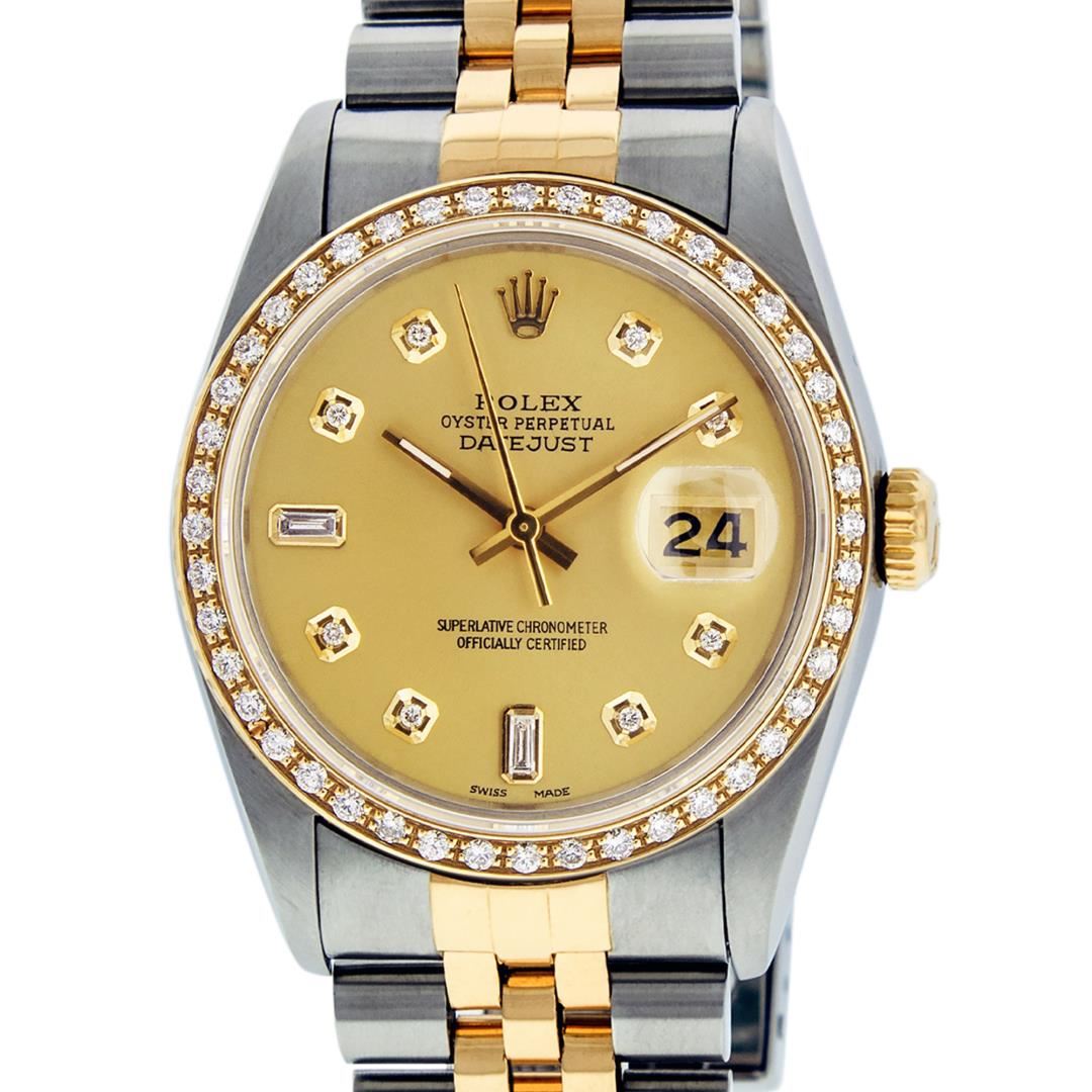 One Mens Pre Owned Two Tone Yellow Gold And Stainless Steel Rolex Datejust Polished, Serviced And Electronically Tested, Rolex 18K Yellow Gold And Stainless Steel Case: 36mm, Rolex 18K Yellow Gold Crown, Custom Bezel: New 18K Yellow Gold Beadset Diamond Bezel, Diamond Count: 44 Diamonds. Custom Crystal: New Sapphire With Magnified Lens. Custom Hands: New Luminescent Hands. Rolex Movement: Automatic Winding Movement 3035. Custom Dial: Custom Champagne Dial Added Diamonds, Diamond Count: 8 + 2 Baguette Diamonds On Dial. Date Window: 3 O'Clock Position Date Display, Quickset, Model: Datejust. Condition: G-6 Extra Fine. Rolex Bracelet: Two Tone Yellow Gold And Stainless Steel Jubilee Band. Bright Polish. 7.0 Inch Length, Adjustable. Standard Clasp, With Rolex Logo. This Watch Has Been Serviced Time Tested And Is In Excellent Condition It Is Free Of All Scratches And Dents.
