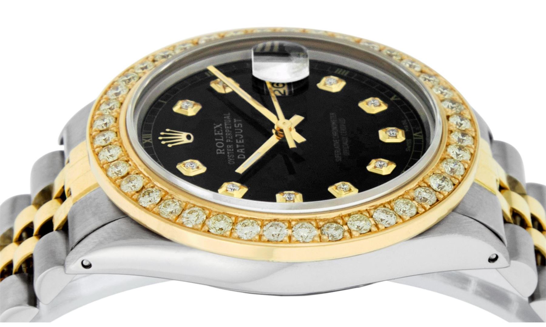 One Mens Pre Owned Two Tone Yellow Gold And Stainless Steel Rolex Datejust Polished Bright with Satin Finish, Serviced And Electronically Tested, Rolex Yellow Gold And Stainless Steel Case: 36mm, Rolex Yellow Gold Crown, Custom Bezel: New 18K Yellow Gold Beadset Diamond Bezel, Diamond Count: 40 Diamonds On Bezel, Total Weight 2.0 Carat. Custom Crystal: New Sapphire With Date Window. Custom Hands: New Luminescent Hands. Rolex Movement: Automatic Winding Movement 3035. Custom Dial: Custom Black Dial With Added Diamonds, Diamond Count: 10 Diamonds On Dial. Date Window: 3 O'Clock Position Date Display, Quickset, Model: Datejust. Condition: G-6 Extra Fine. Rolex Bracelet: Yellow Gold And Stainless Steel Jubilee Band. Bright Polish And Satin Finish. 7.0 Inch Length, Adjustable. Standard Clasp, With Rolex Logo. This Watch Has Been Serviced and Polished And It Is Free Of All Dents And Scratches And Has Been Time Tested.