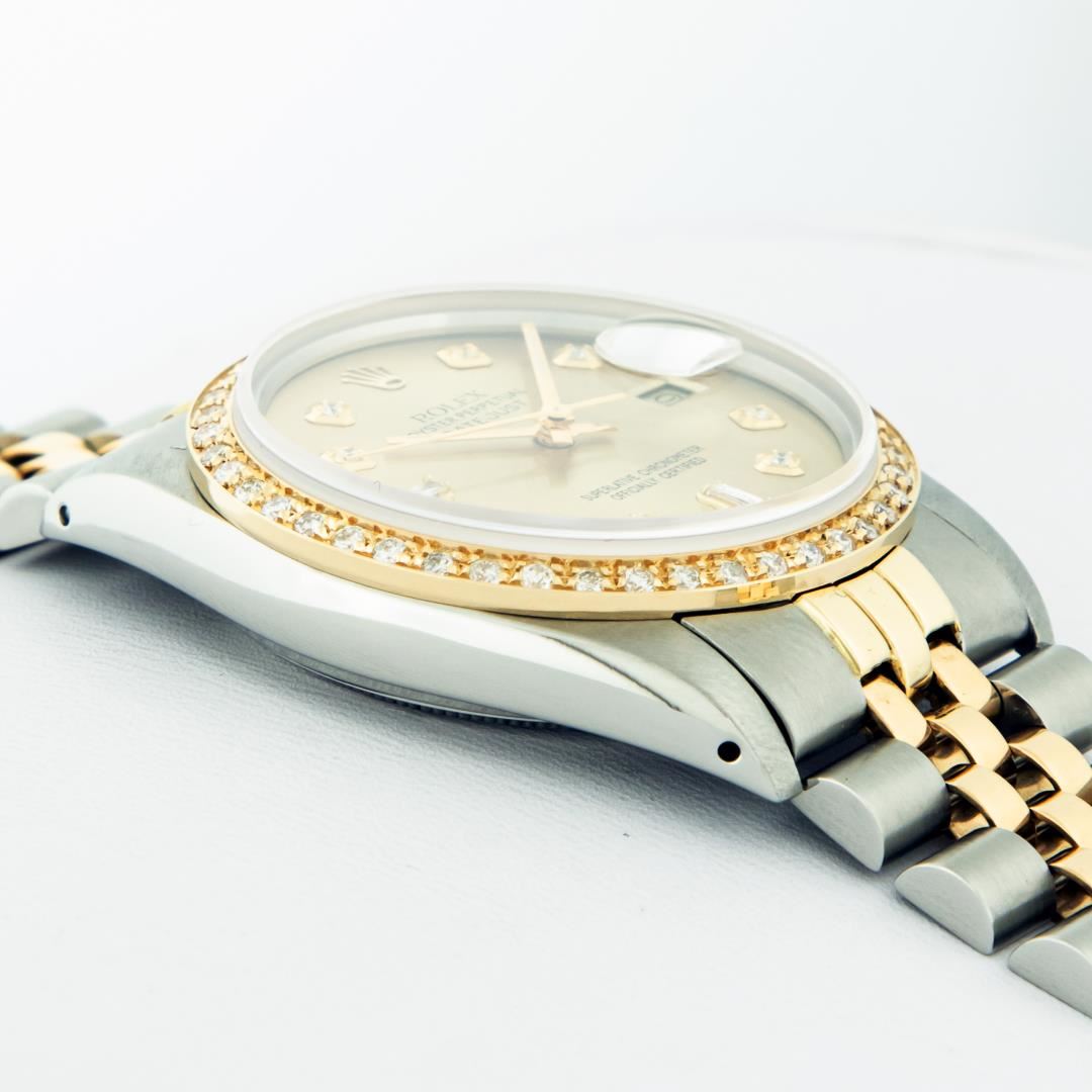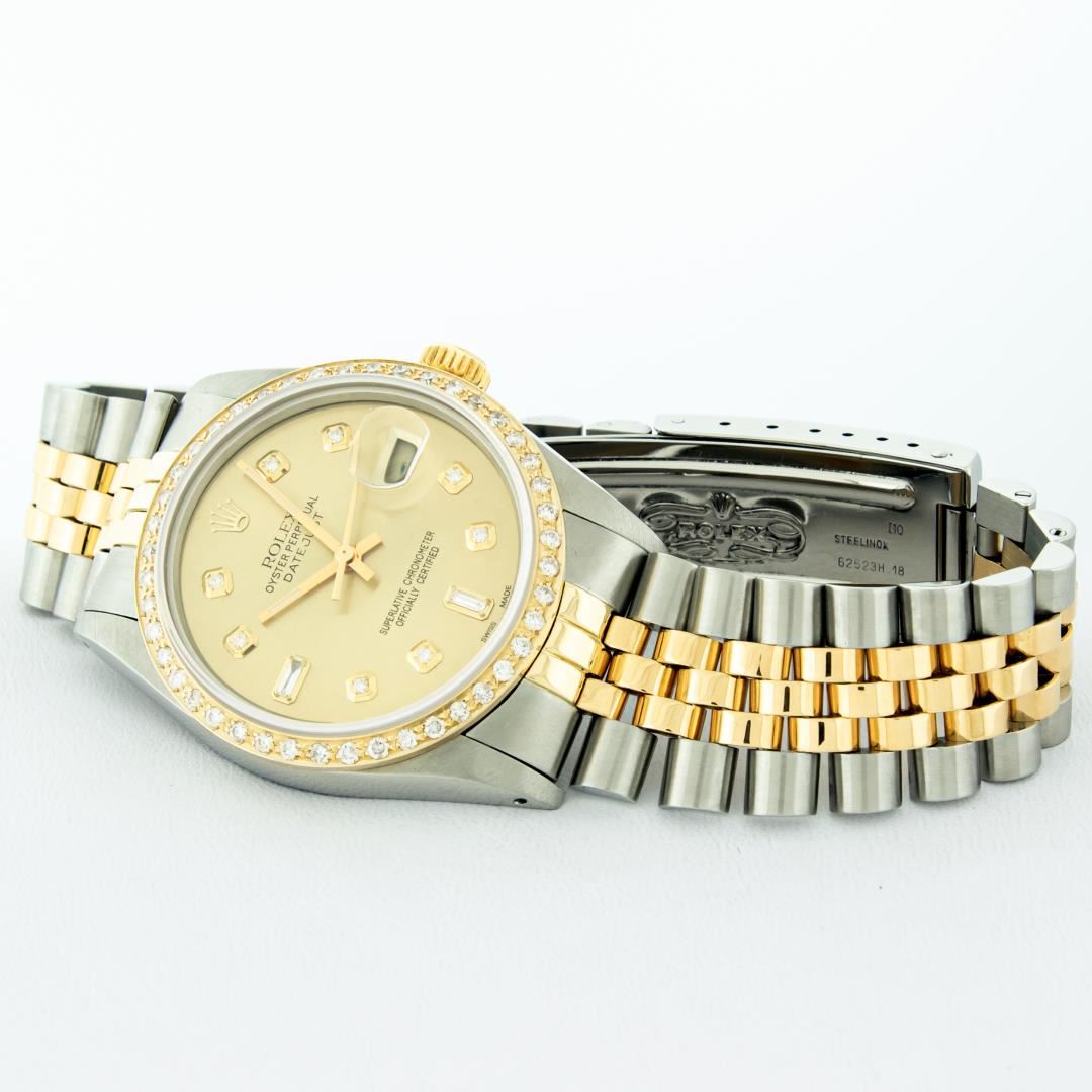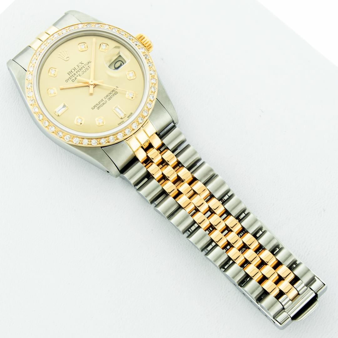 One Mens Pre Owned Two Tone Yellow Gold And Stainless Steel Rolex Datejust Polished, Serviced And Electronically Tested, Rolex 18K Yellow Gold And Stainless Steel Case: 36mm, Rolex 18K Yellow Gold Crown, Custom Bezel: New 18K Yellow Gold Beadset Diamond Bezel, Diamond Count: 44 Diamonds. Custom Crystal: New Sapphire With Magnified Lens. Custom Hands: New Luminescent Hands. Rolex Movement: Automatic Winding Movement 3035. Custom Dial: Custom Champagne Dial Added Diamonds, Diamond Count: 8 + 2 Baguette Diamonds On Dial. Date Window: 3 O'Clock Position Date Display, Quickset, Model: Datejust. Condition: G-6 Extra Fine. Rolex Bracelet: Two Tone Yellow Gold And Stainless Steel Jubilee Band. Bright Polish. 7.0 Inch Length, Adjustable. Standard Clasp, With Rolex Logo. This Watch Has Been Serviced Time Tested And Is In Excellent Condition It Is Free Of All Scratches And Dents.